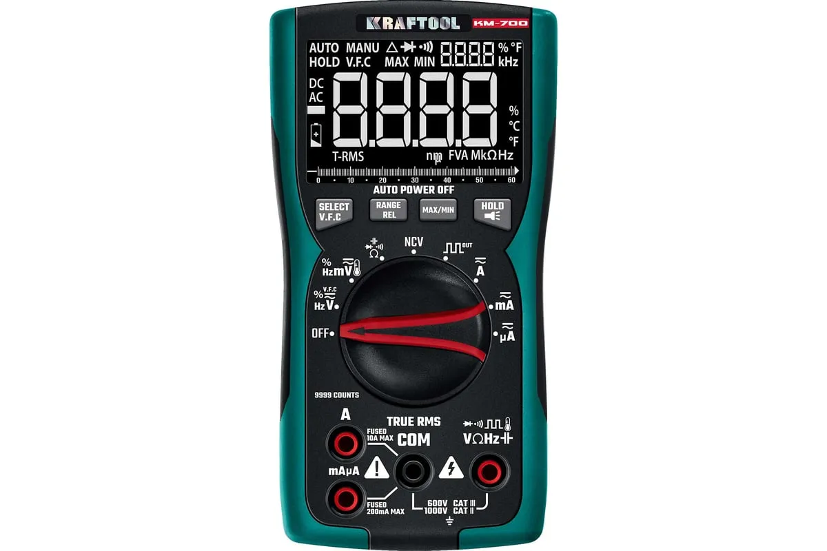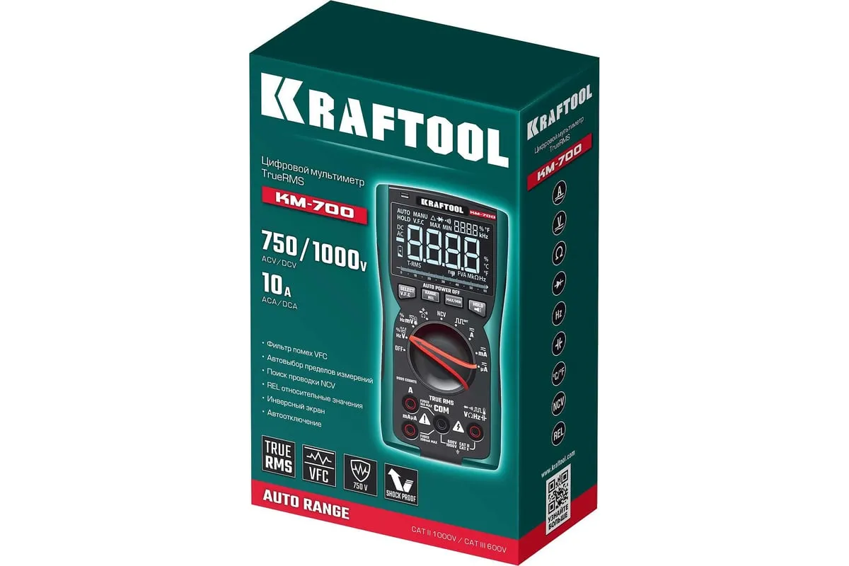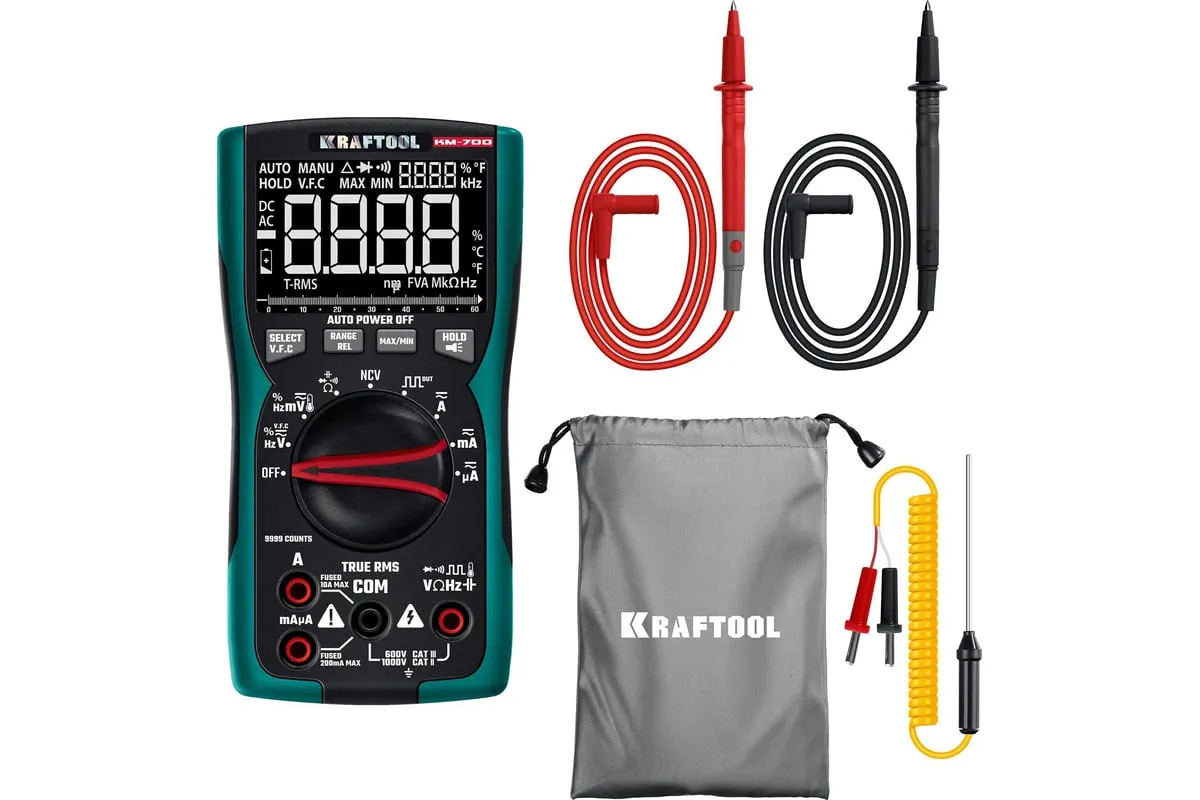 Профессиональный автоматический цифровой мультиметр KRAFTOOL гарантирует наивысшую точность измерений. Применение высококачественных материалов обеспечивает длительный срок службы. Прибор имеет функции измерения переменного и постоянного напряжения, сопротивления, емкости, проверки целостности цепей со звуковым сигналом, проверки диодов, измерения переменного и постоянного тока, измерение частоты до 100 МГц, измерение температуры и режим относительных измерений.