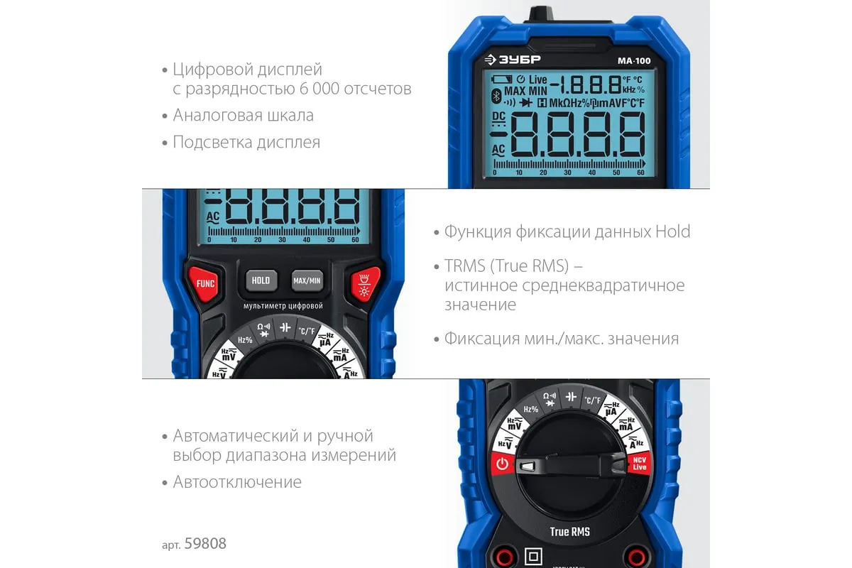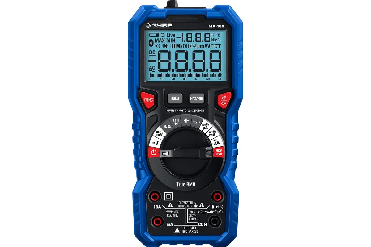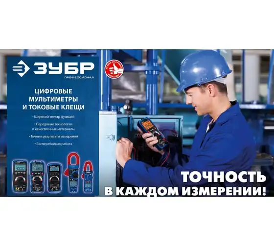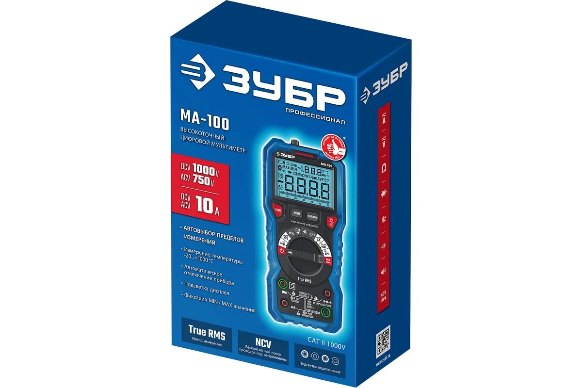 Профессиональный автоматический цифровой мультиметр ЗУБР обеспечивает высокую точность измерений. Применение высококачественных материалов формирует длительный срок службы. Прибор имеет функции измерения переменного и постоянного напряжения, сопротивления, емкости, проверки целостности цепей со звуковым сигналом, проверки диодов, измерения переменного и постоянного тока, измерение частоты до 10 МГц, измерение температуры и режим поиска проводки под напряжением NCV Live. Используется для проведения высокоточных измерений электрических параметров сети и приборов.