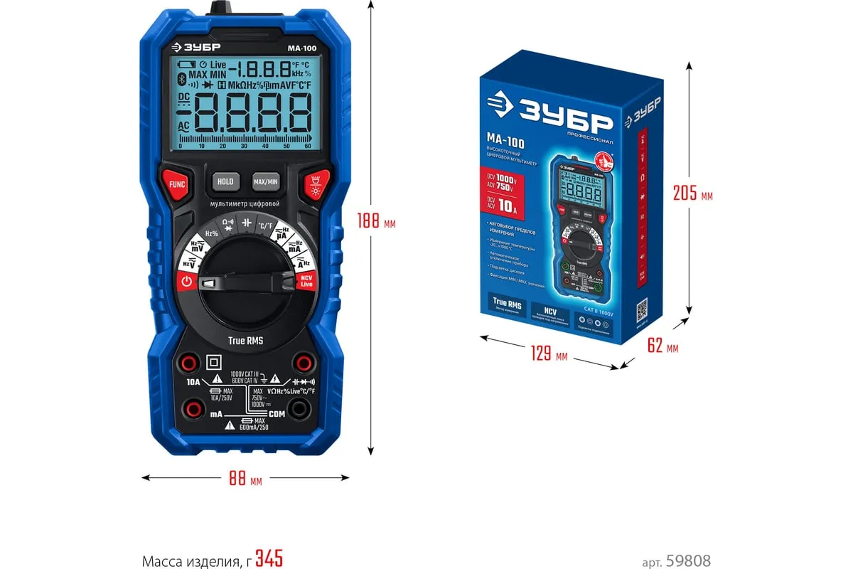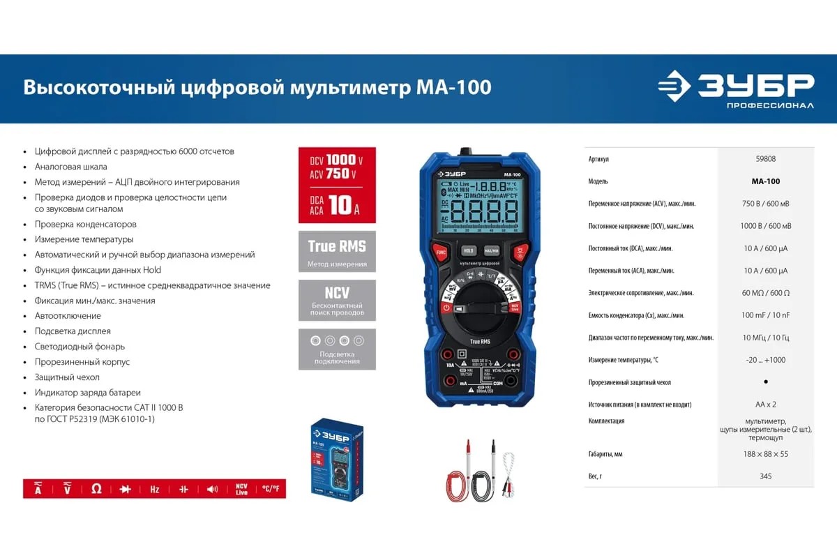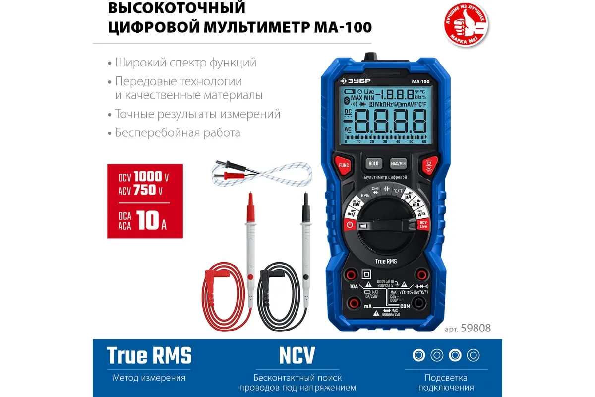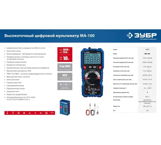 Профессиональный автоматический цифровой мультиметр ЗУБР обеспечивает высокую точность измерений. Применение высококачественных материалов формирует длительный срок службы. Прибор имеет функции измерения переменного и постоянного напряжения, сопротивления, емкости, проверки целостности цепей со звуковым сигналом, проверки диодов, измерения переменного и постоянного тока, измерение частоты до 10 МГц, измерение температуры и режим поиска проводки под напряжением NCV Live. Используется для проведения высокоточных измерений электрических параметров сети и приборов.