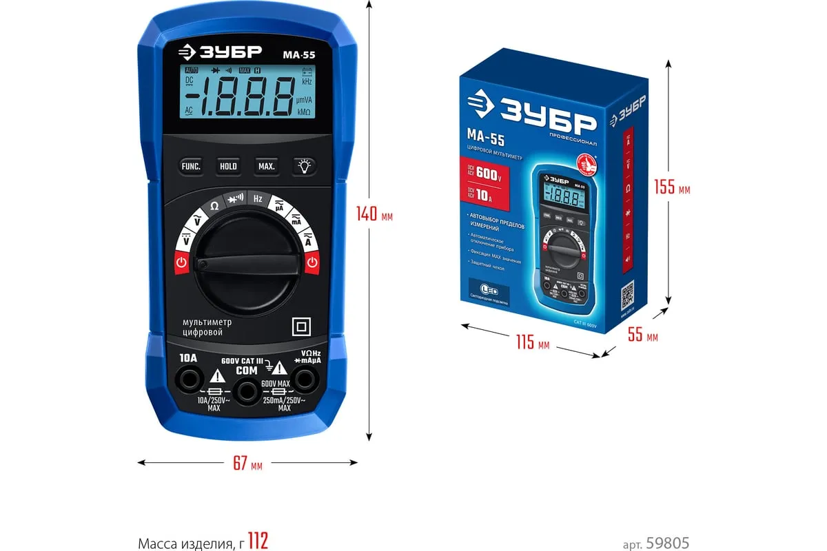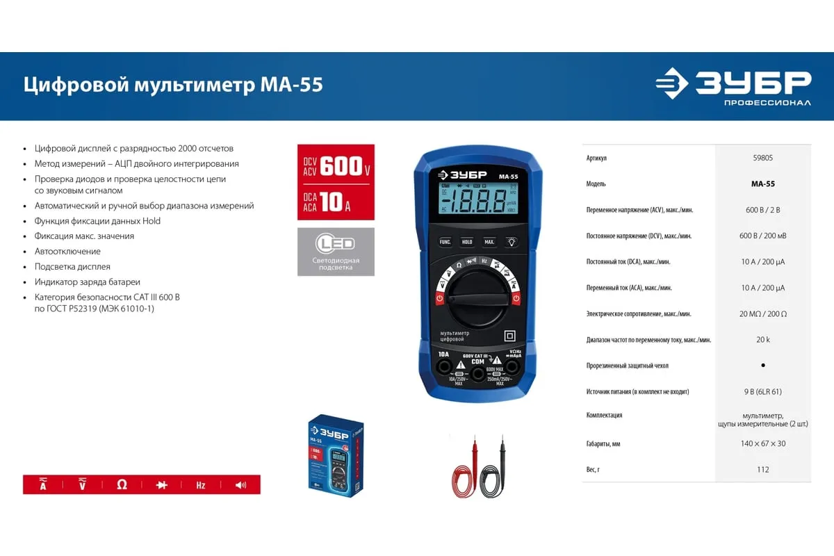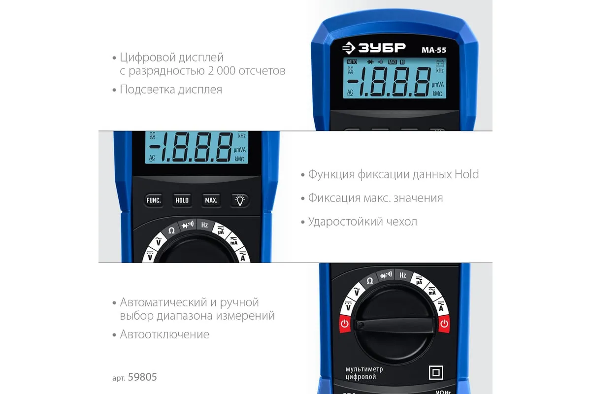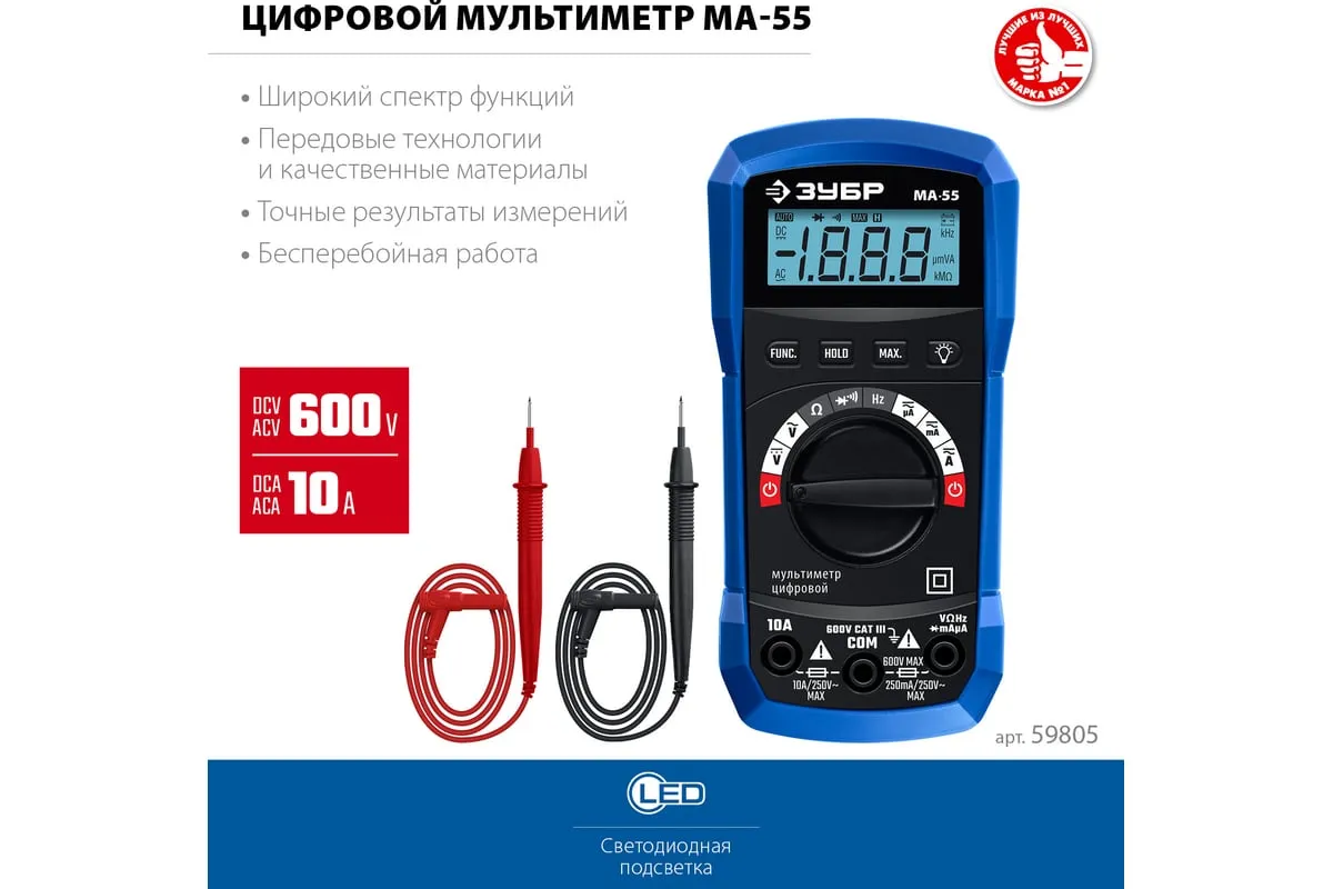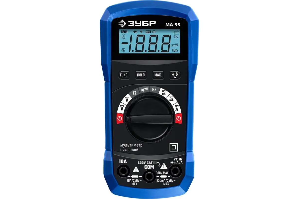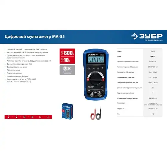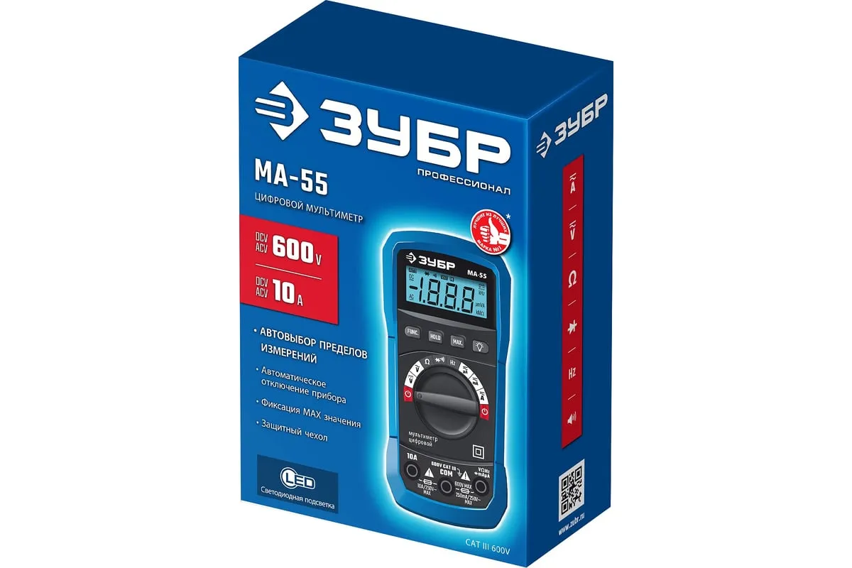 Профессиональный автоматический цифровой мультиметр ЗУБР обеспечивает высокую точность измерений. Применение высококачественных материалов формирует длительный срок службы. Прибор имеет функции измерения переменного и постоянного напряжения, сопротивления, проверки целостности цепей со звуковым сигналом, проверки диодов, измерения переменного и постоянного тока, измерение частоты до 20 кГц.