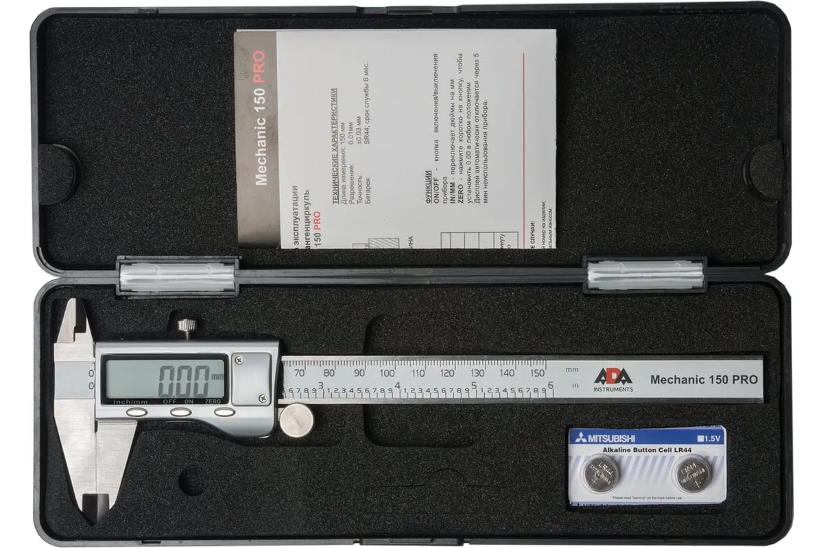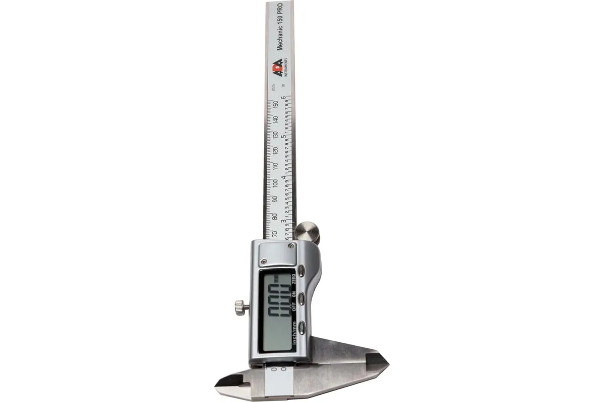 Цифровой штангенциркуль ADA Mechanic 150 PRO А00380 изготовлен из нержавеющей стали. Инструмент имеет ЖК-дисплей, что делает измерительную работу более удобной. Точностью: ±0.03 мм. Разрешение: 0.01 мм. Включение происходит автоматически при сдвиге рамки. Нажатием кнопки inch/mm можно перевести дюймы в миллиметры. Питание: 1 батарейка типа LR44 (время работы 6 месяцев). Подвижная рамка имеет специальное колесико для точной установки. В данной модели предусмотрен глубинометр.