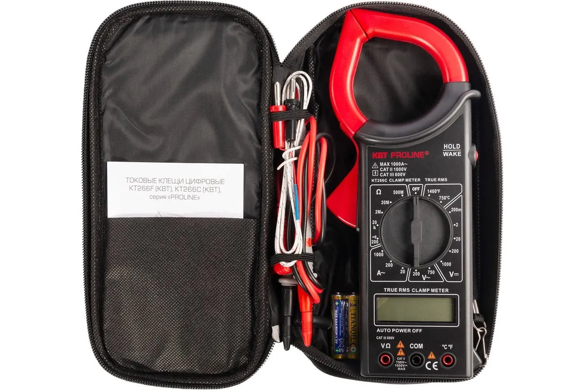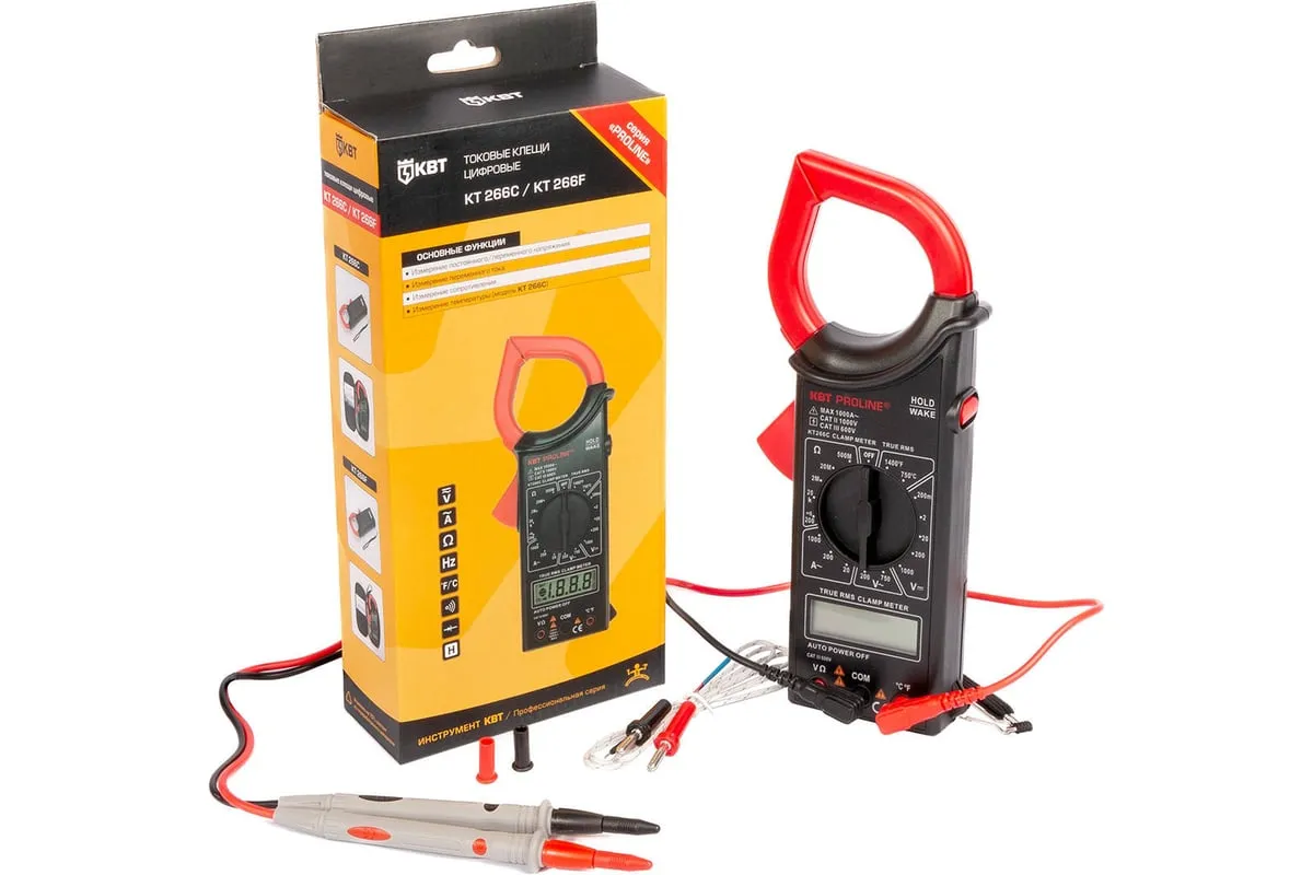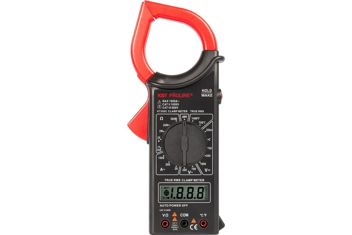 Цифровые токовые клещи КВТ KT 266C PROLINE 79132 измеряет переменный ток, напряжение, сопротивление и температуру.