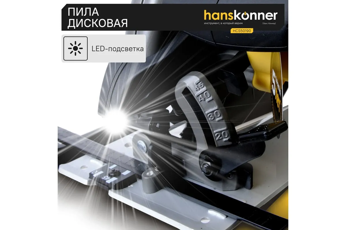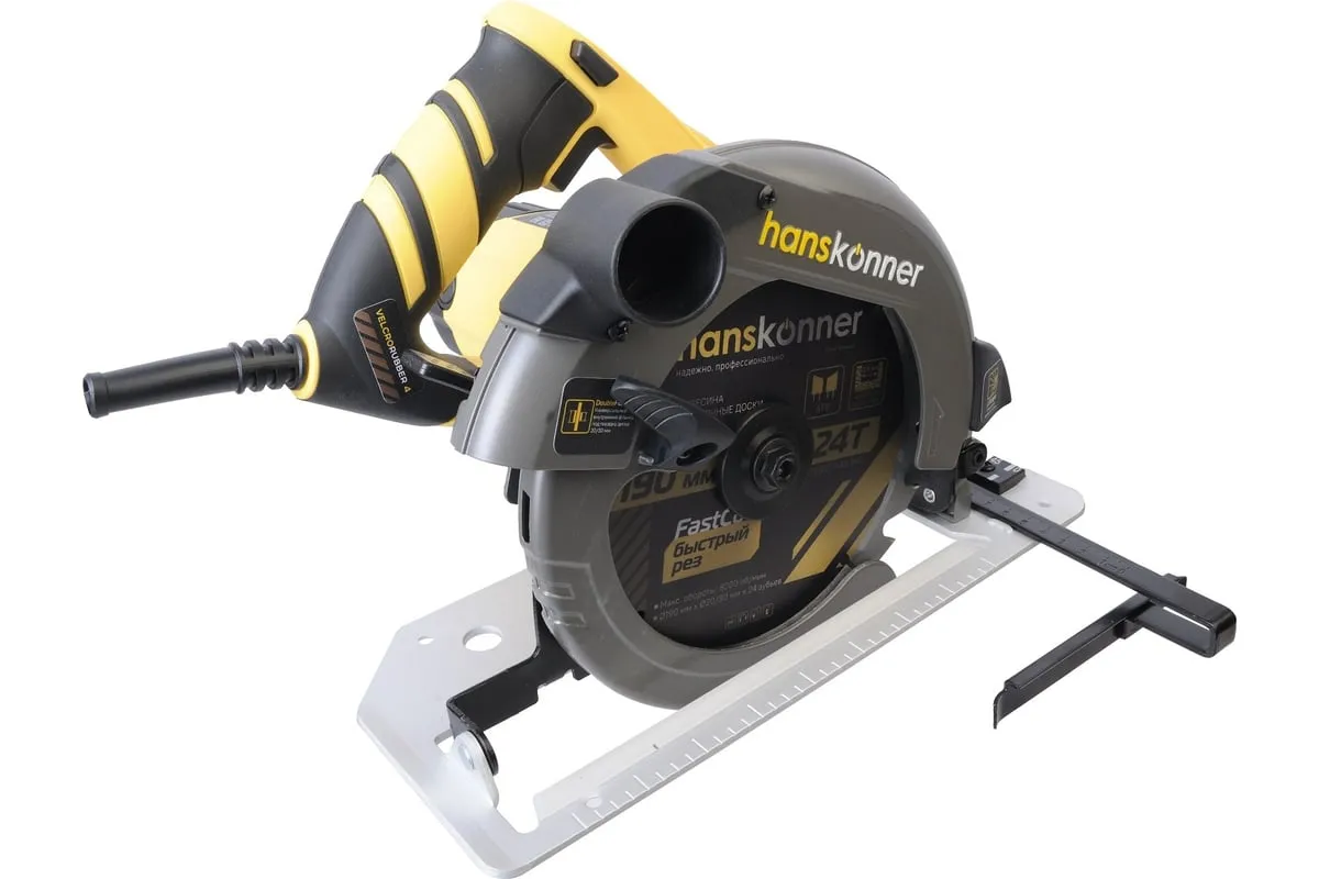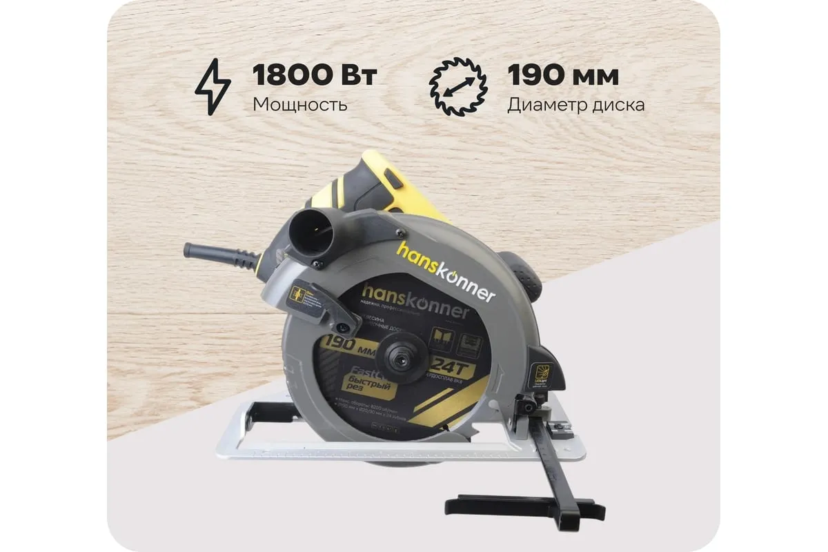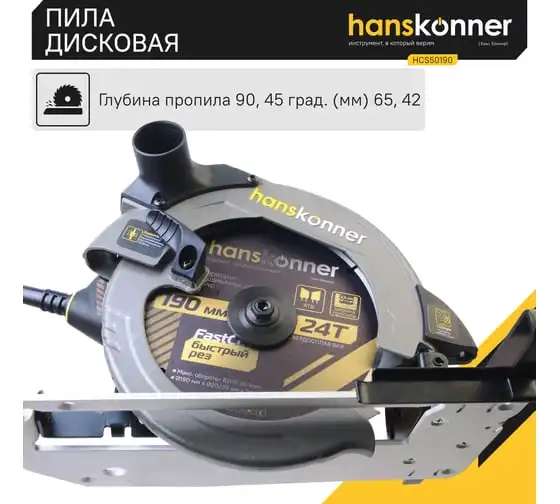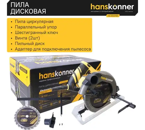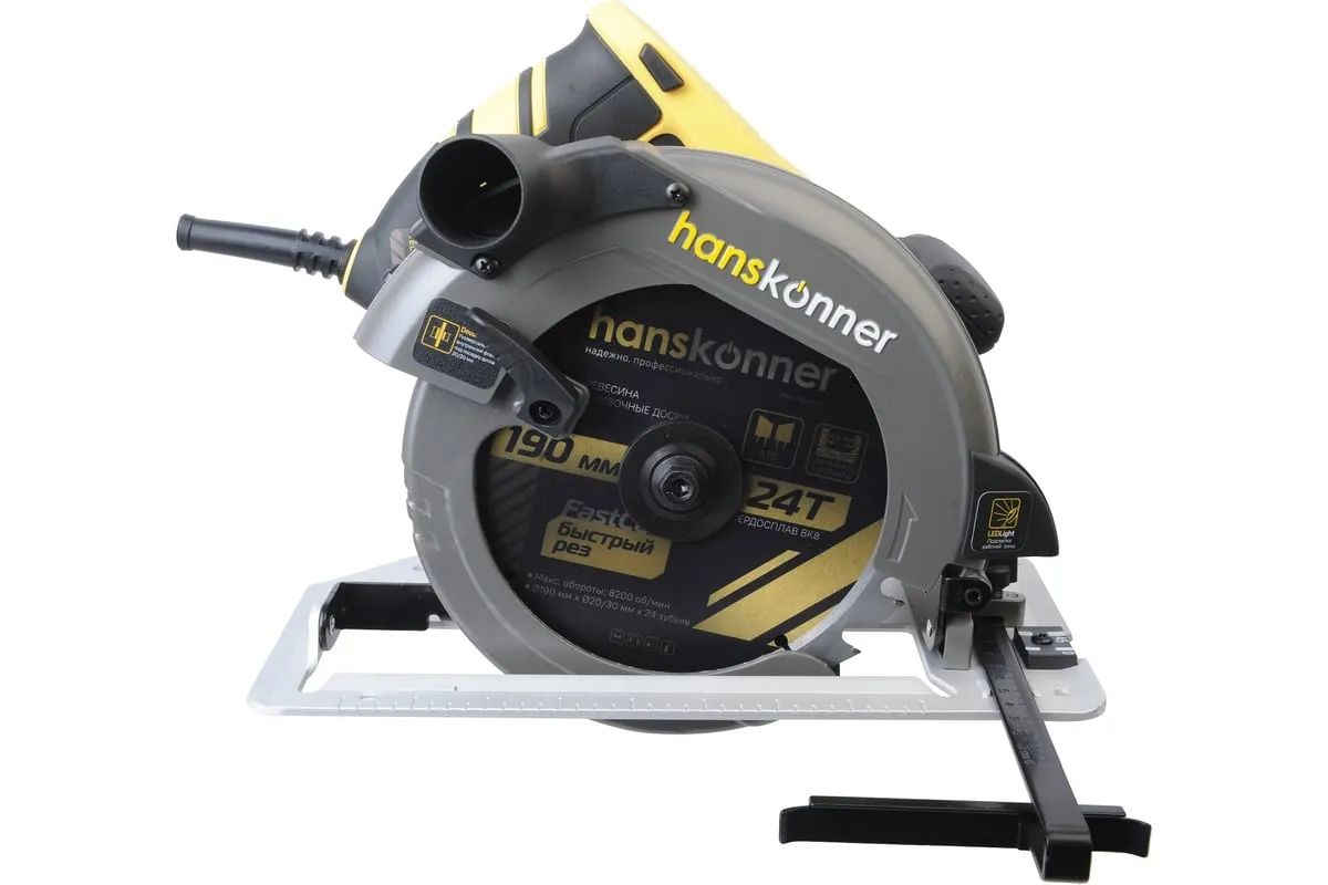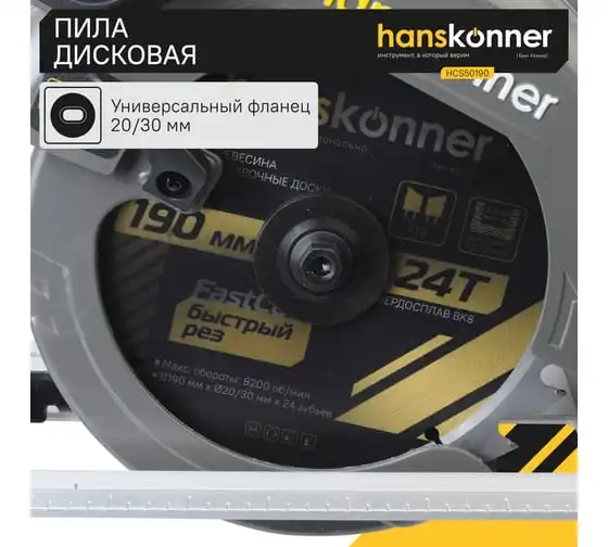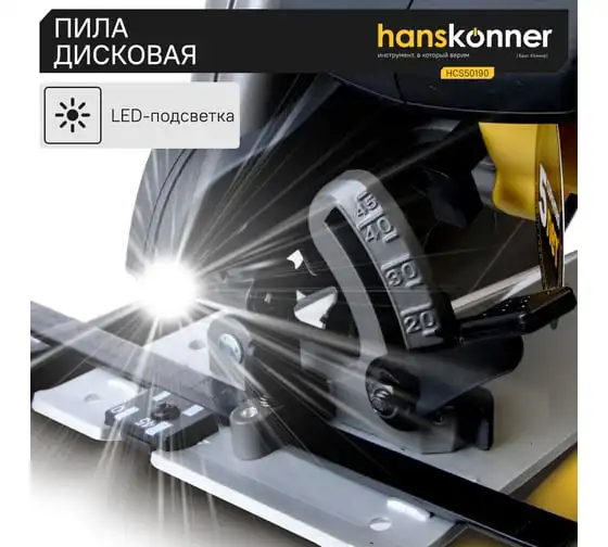 Пила циркулярная Hanskonner HCS50190 - надежный электроинструмент для осуществления прямых пропилов в заготовках из древесины, фанеры и пластмассы. Данная модель отличается прочной литой алюминиевой платформой, что способствует качеству и точности реза. Функция поддержания оборотов под нагрузкой содействует продуктивности работы, а плавный пуск долговечности инструмента. В комплекте идет универсальный фланец DoubleFlange под посадку диска 20/30 мм. Удобно применять рычаг фиксации основания для настройки глубины и угла пиления в одно движение. Также в конструкции циркулярной пилы предусмотрена возможность стационарного использования. При плохом освещении выручает встроенная LED-подсветка.Морозостойкий резиновый сетевой кабель длинной 4 м, позволяет охватит рабочую зону площадью 50 м2.