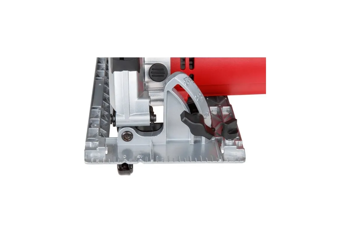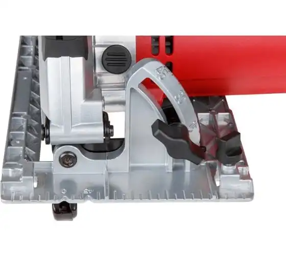Можно регулировать глубину и угол наклона пропила. Модель оснащена широкой алюминиевой платформой и прорезиненной рукояткой. Количество зубьев: 24 шт.