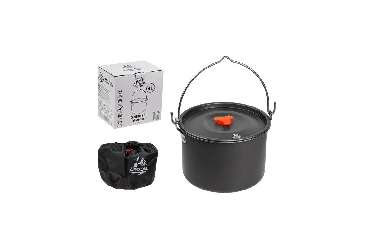 Котелок туристический расчитан на 4 л, изготовлен из пищевого алюминия и обладает высокой прочностью и долговечностью. Посуда из пищевого алюминия больше всего подходит для приготовления пищи на плитах, кострах и горелках. Котелок имеет удобную ручку для подвешивания над костром и переноски.