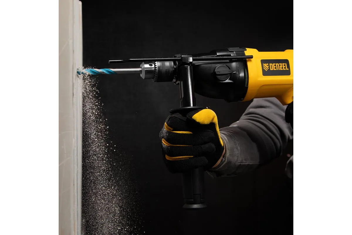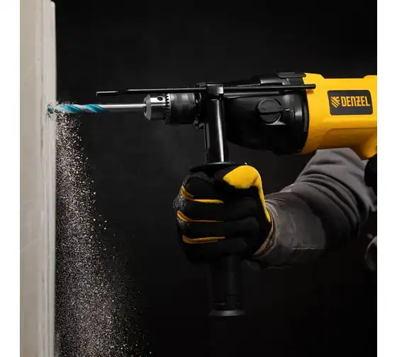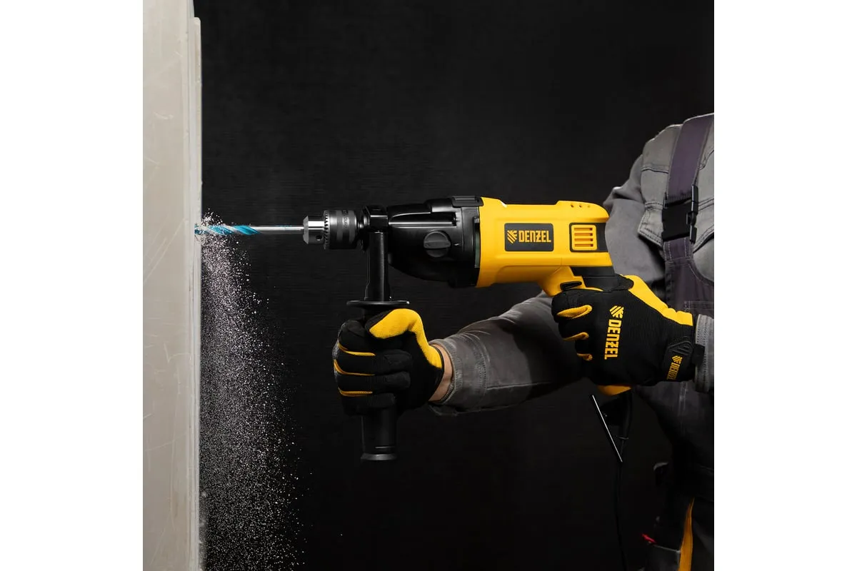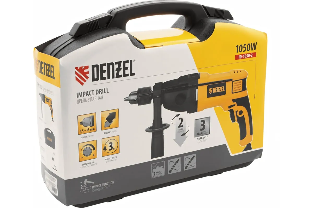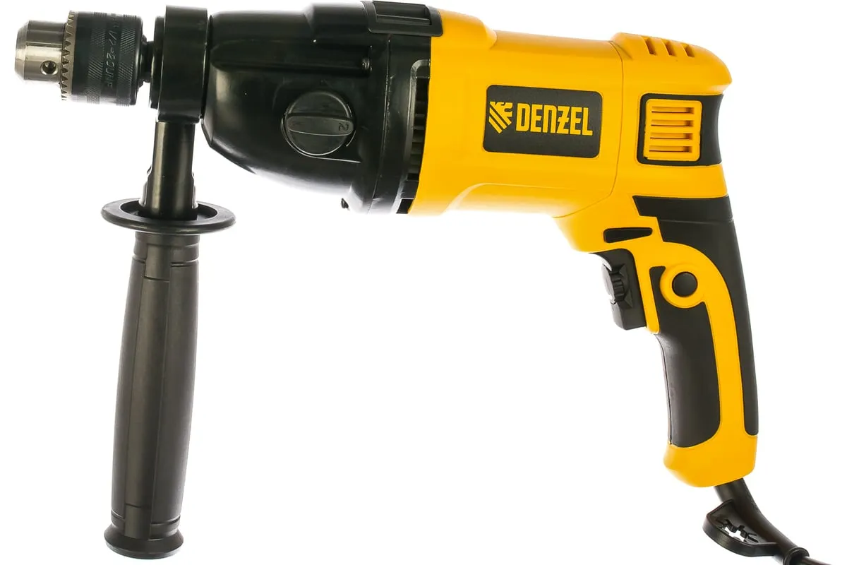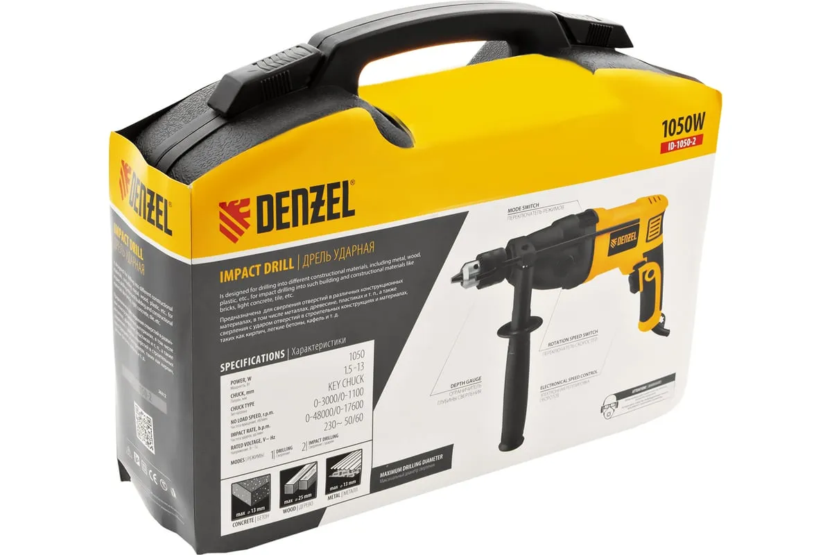 Ударная дрель DENZEL ID-1050-2 26312 работает в двух режимах: сверление и ударное сверление. Пригодится в процессе проведения ремонтно-отделочных операций.