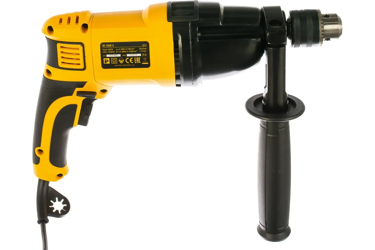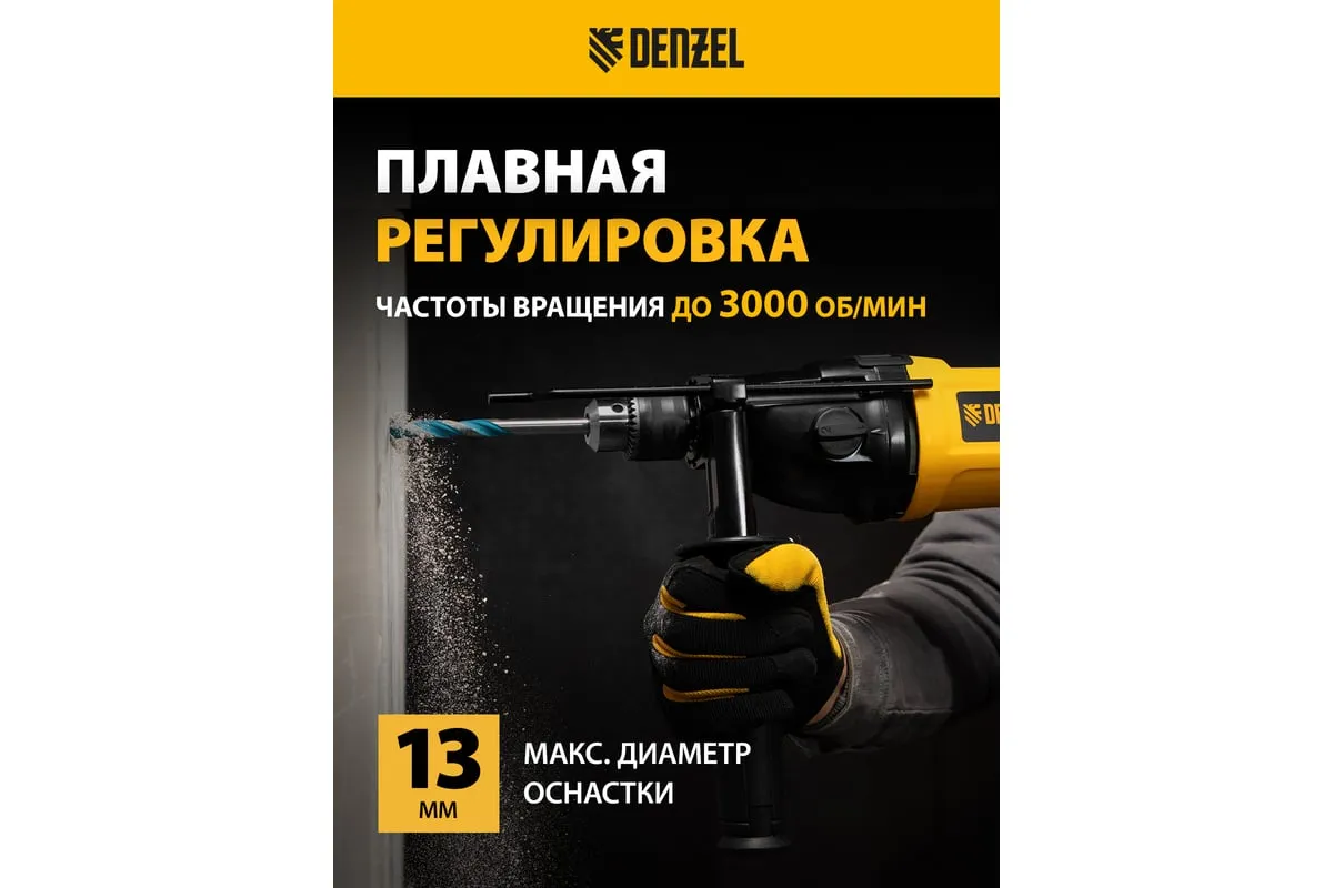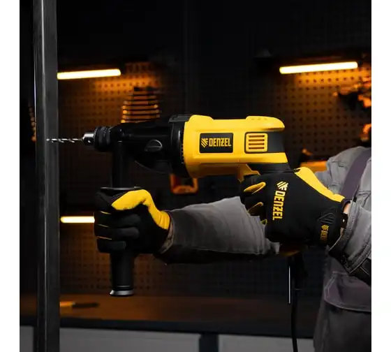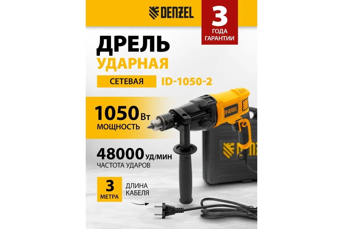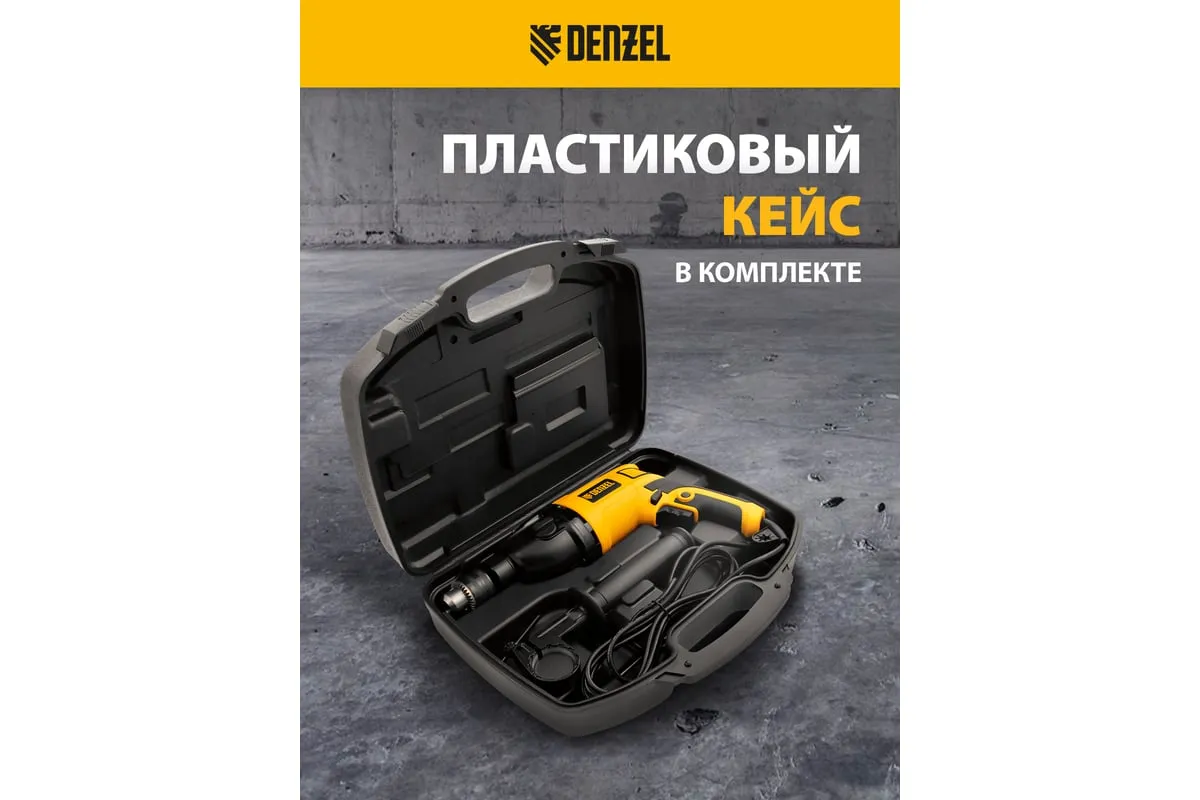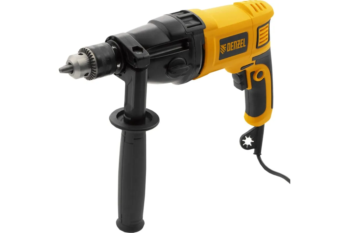 Ударная дрель DENZEL ID-1050-2 26312 работает в двух режимах: сверление и ударное сверление. Пригодится в процессе проведения ремонтно-отделочных операций.