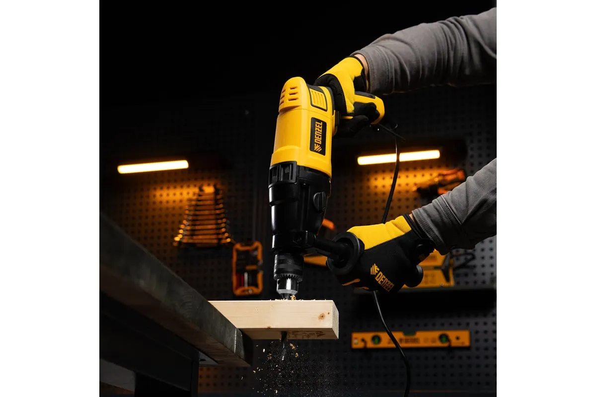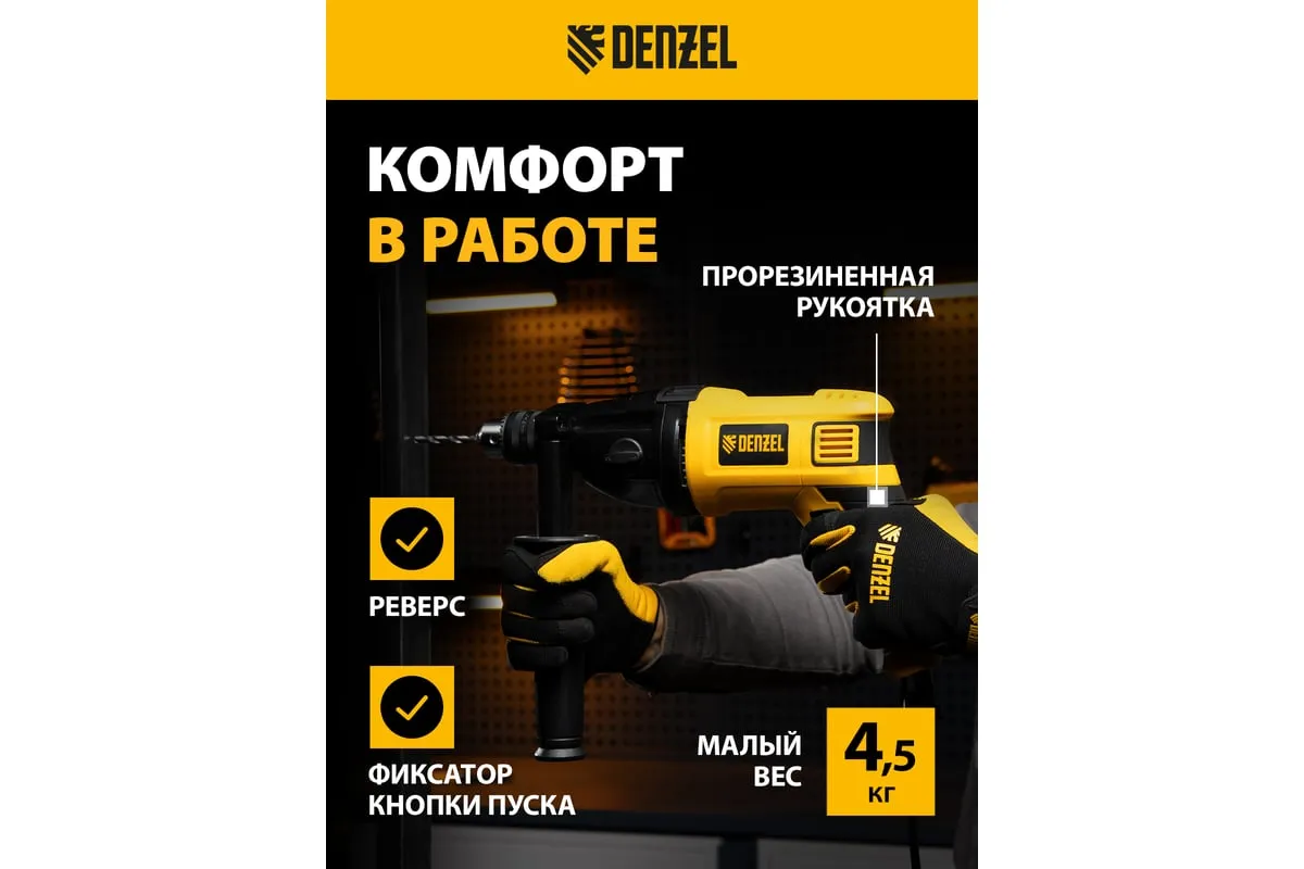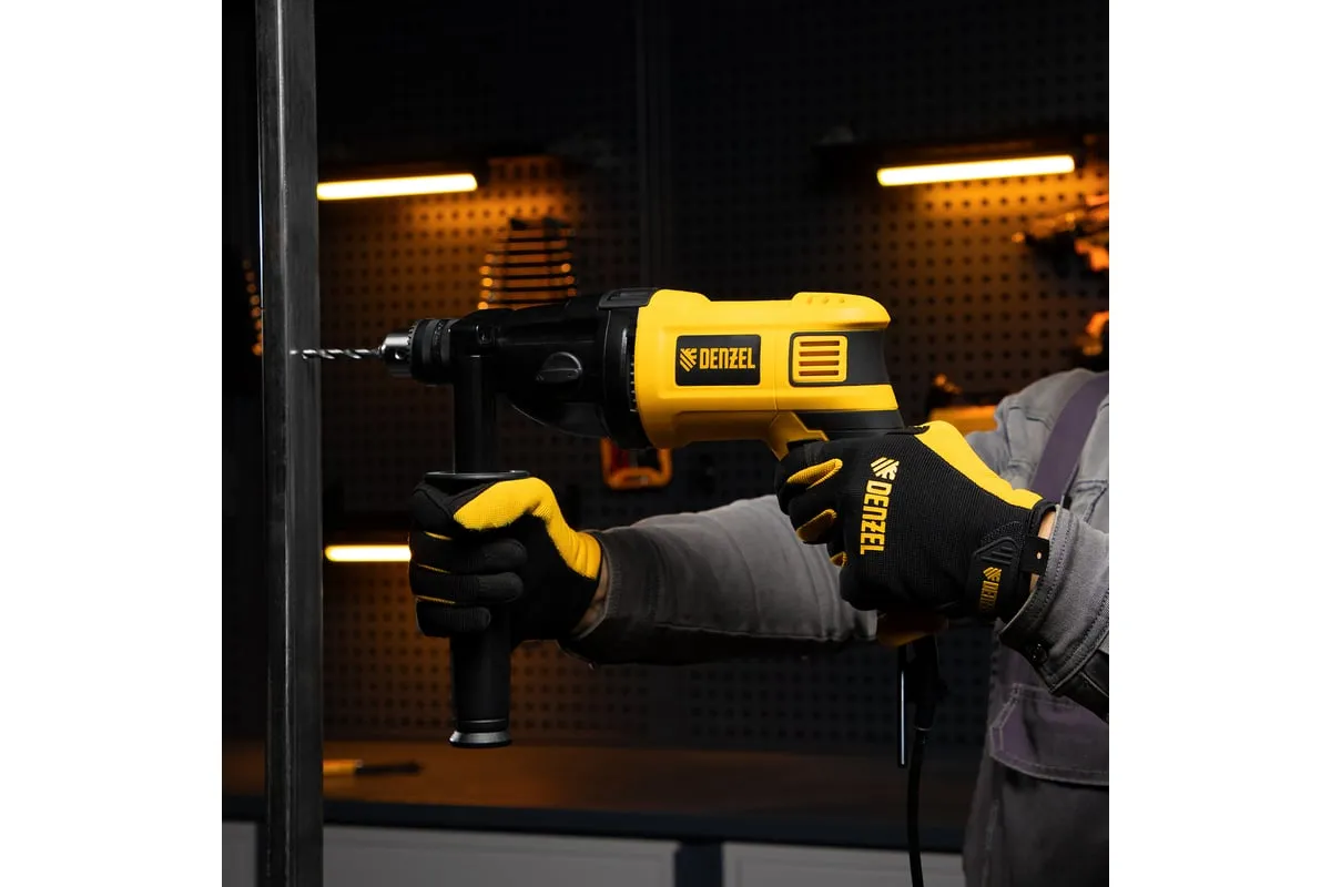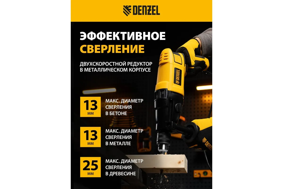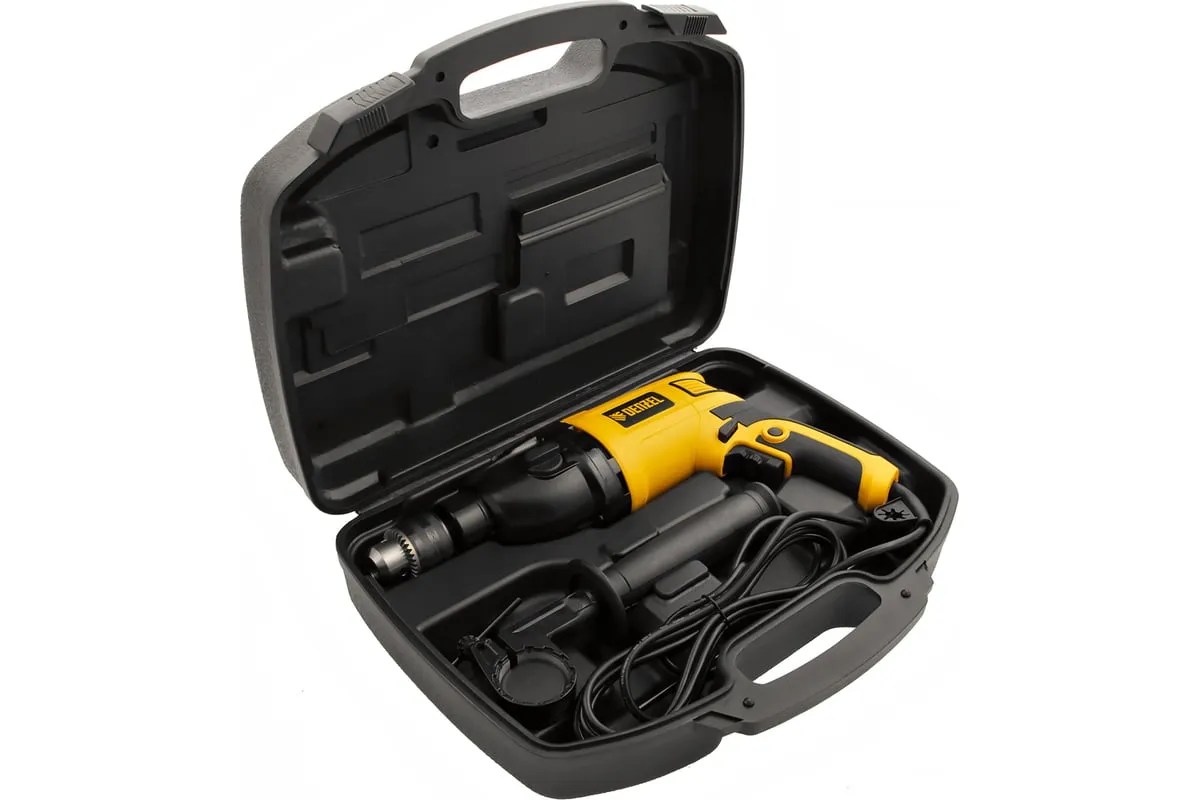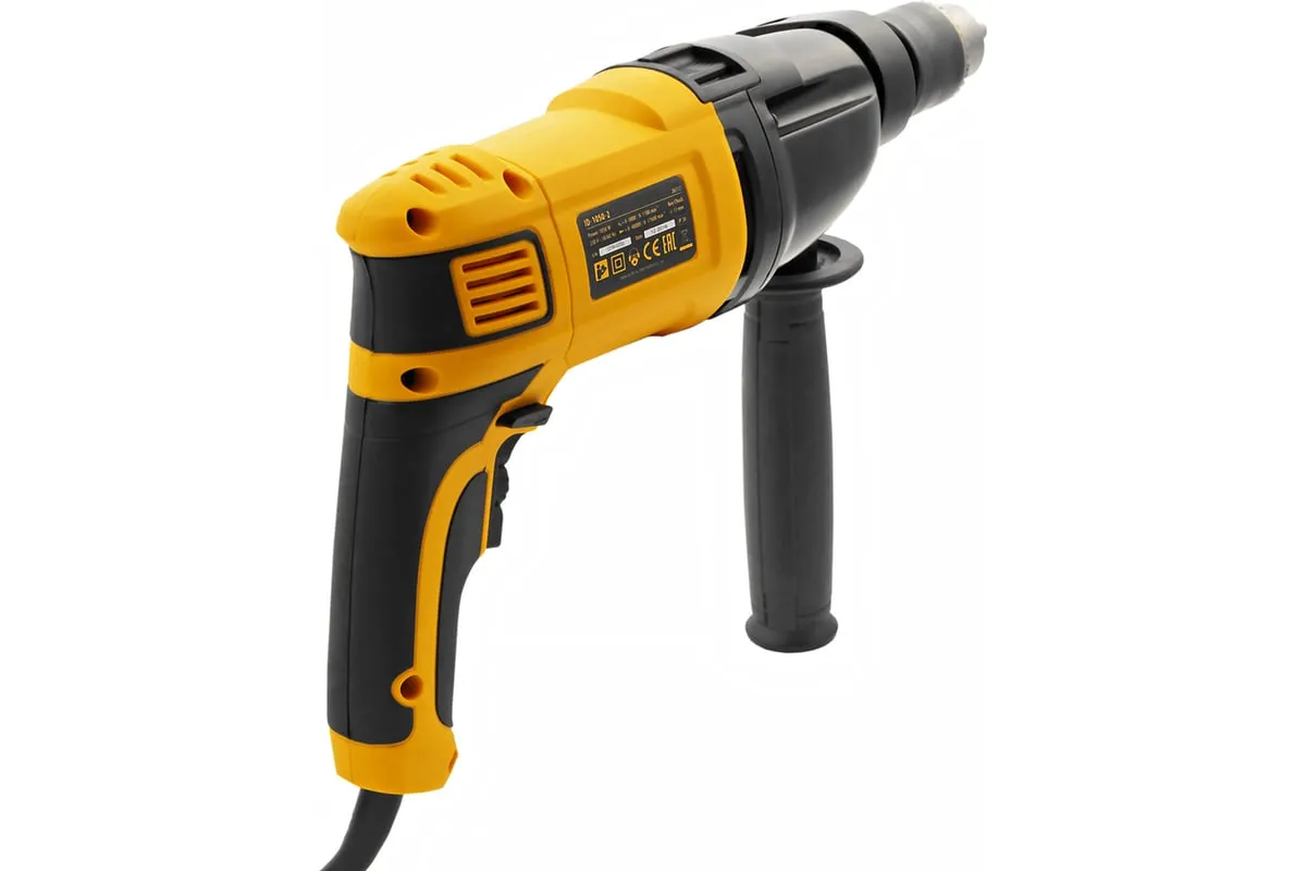 Ударная дрель DENZEL ID-1050-2 26312 работает в двух режимах: сверление и ударное сверление. Пригодится в процессе проведения ремонтно-отделочных операций.