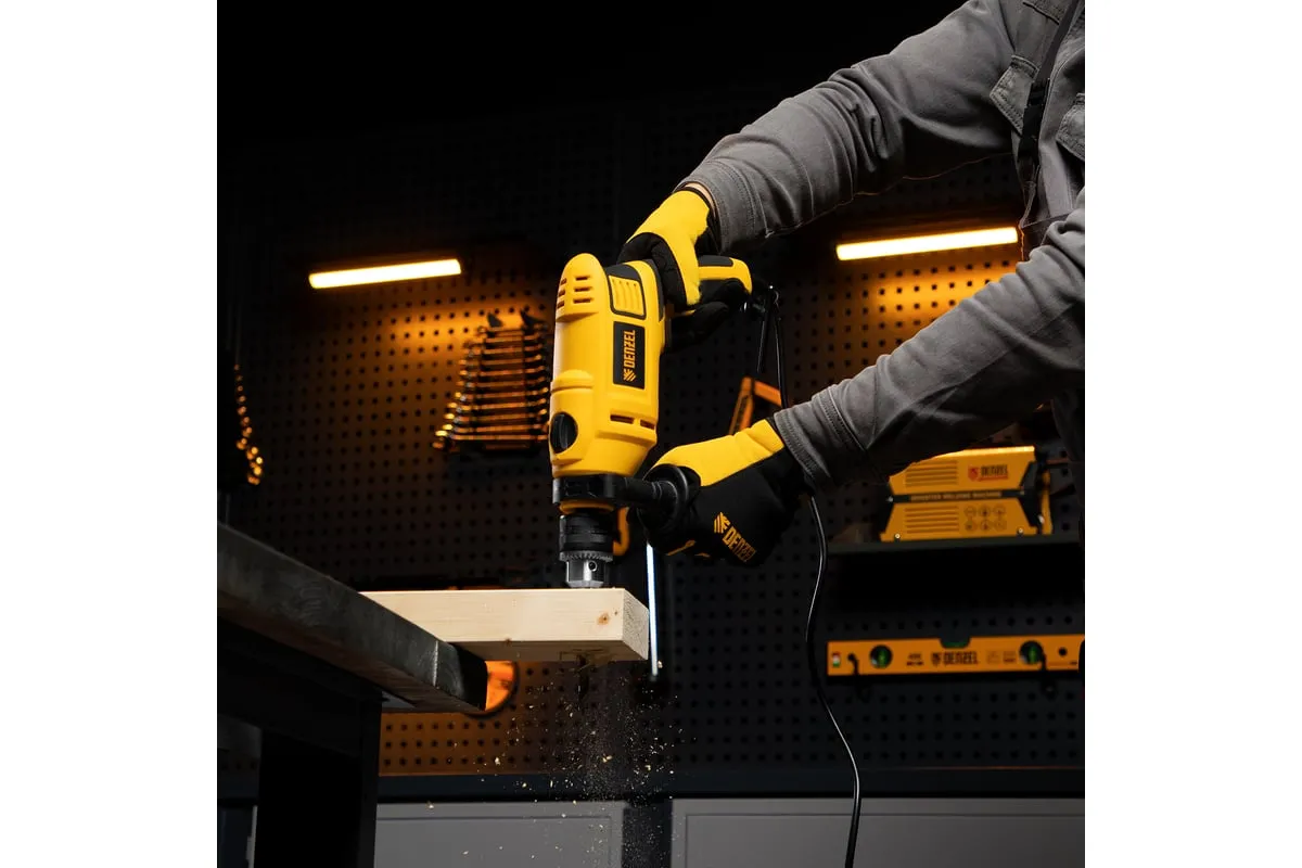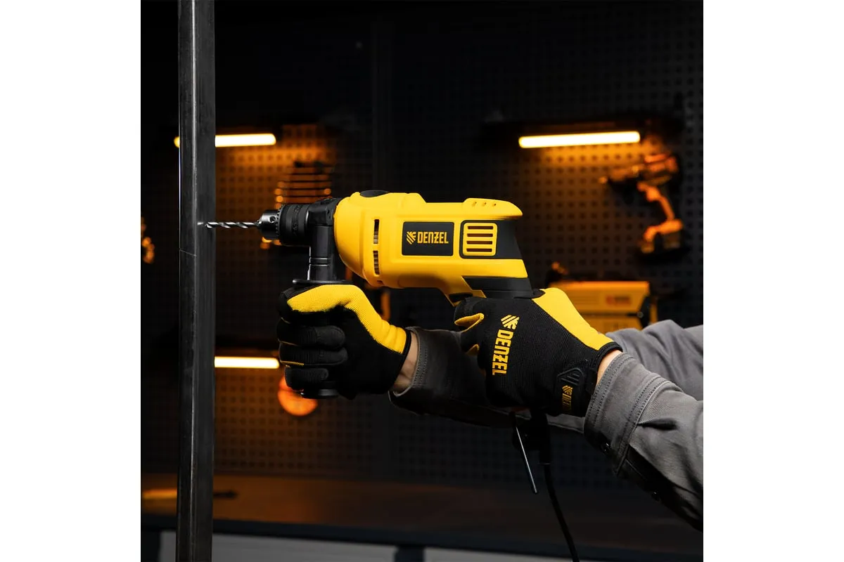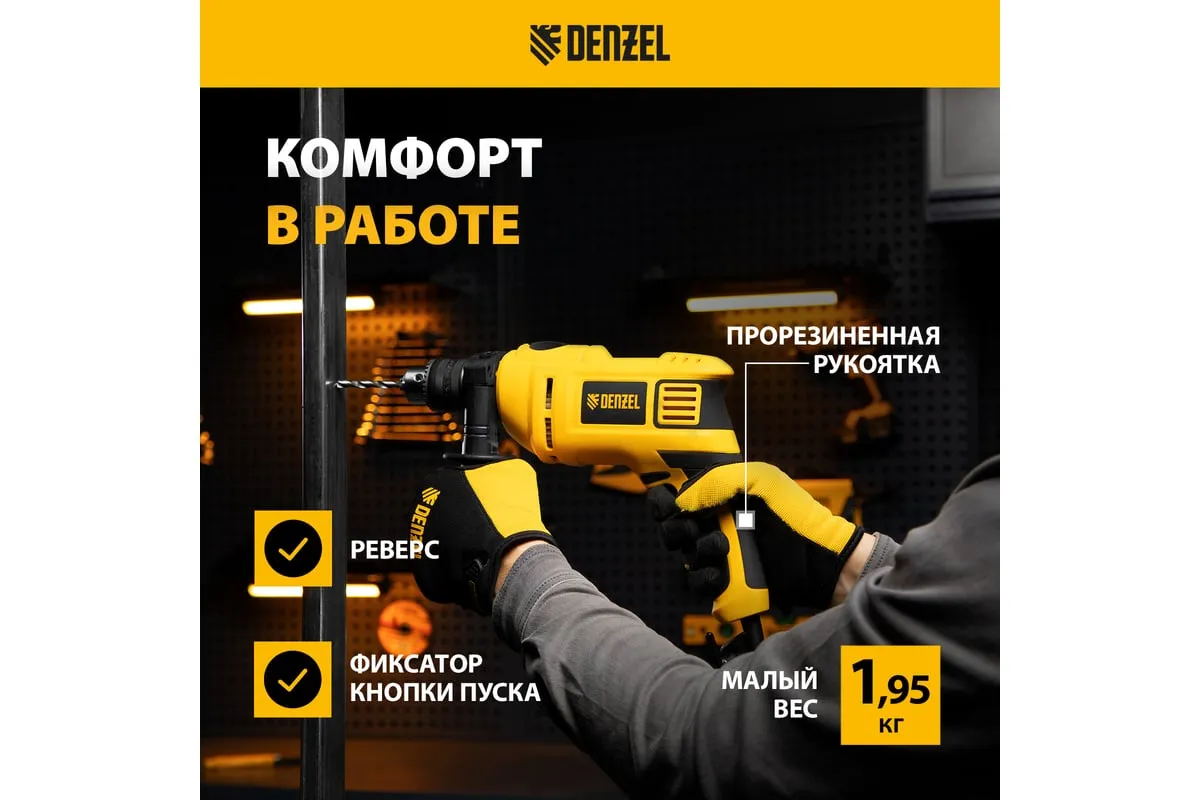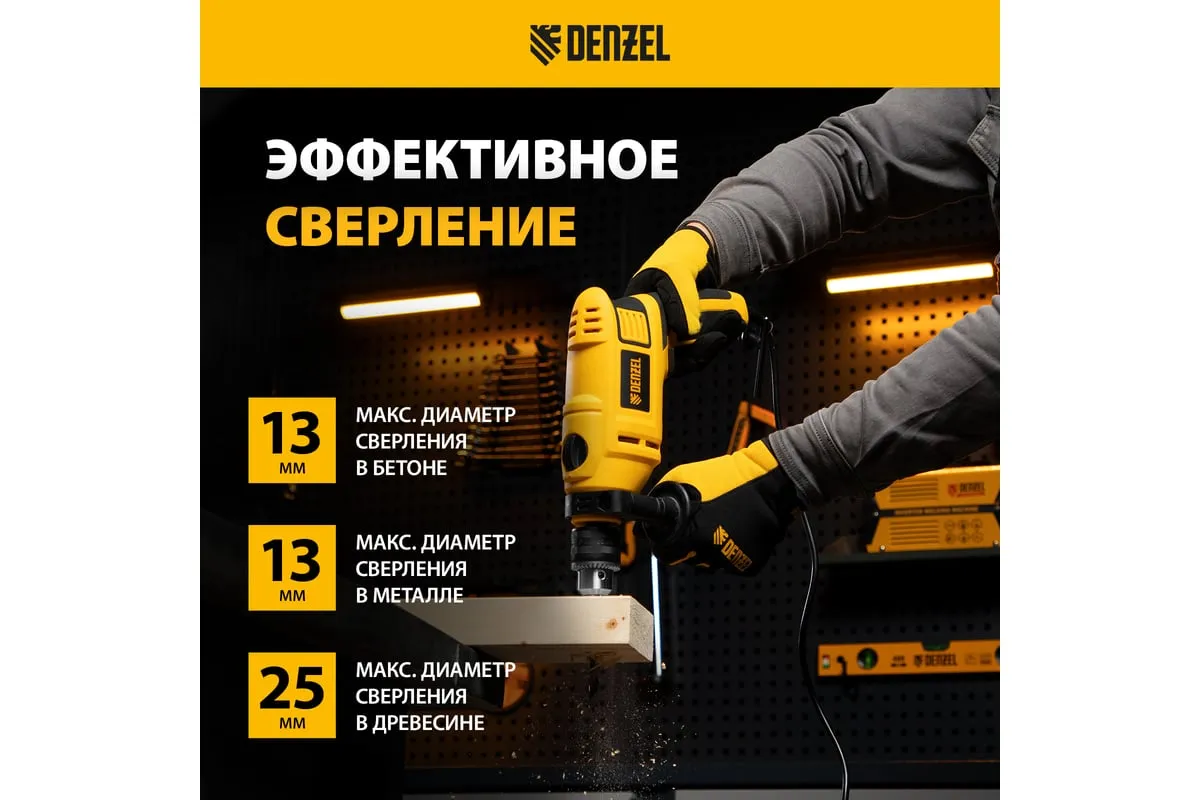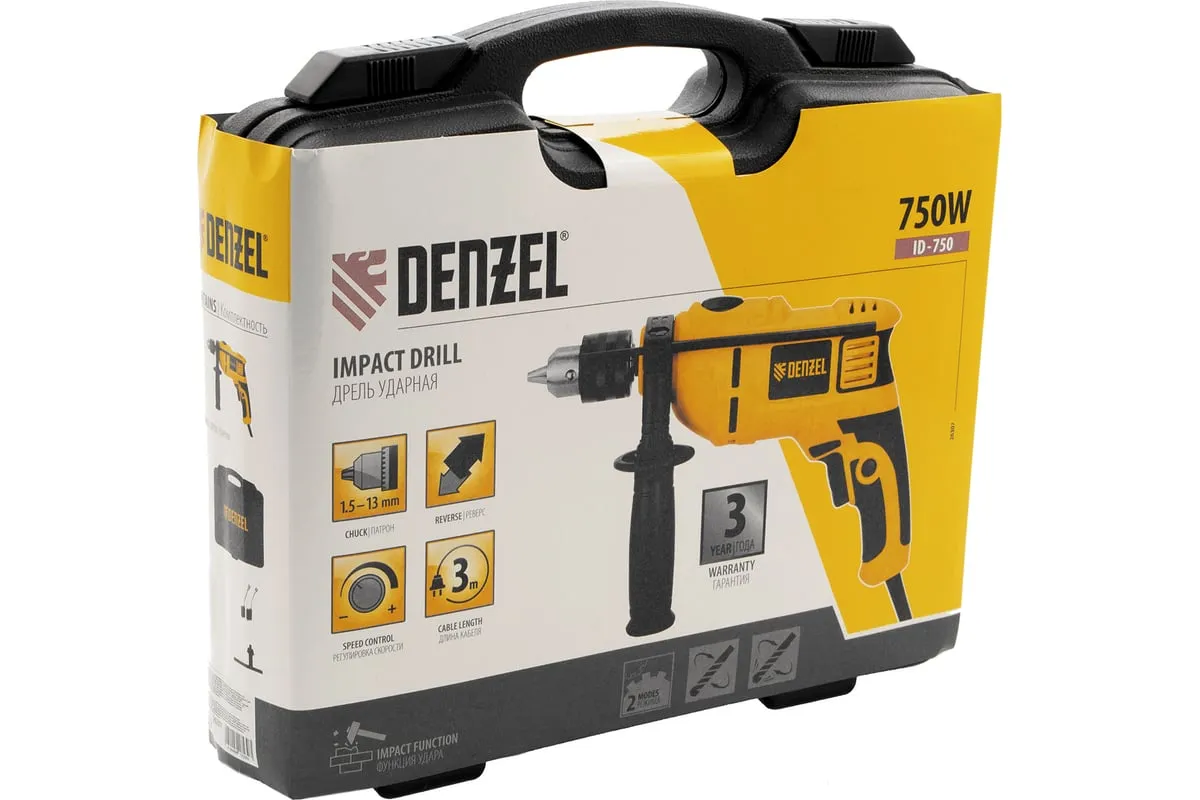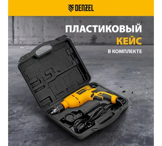 Ударная дрель DENZEL ID-750 26307 универсальна в эксплуатации. Предназначена для сверления в древесине, металле, кирпичной кладке и легком бетоне.