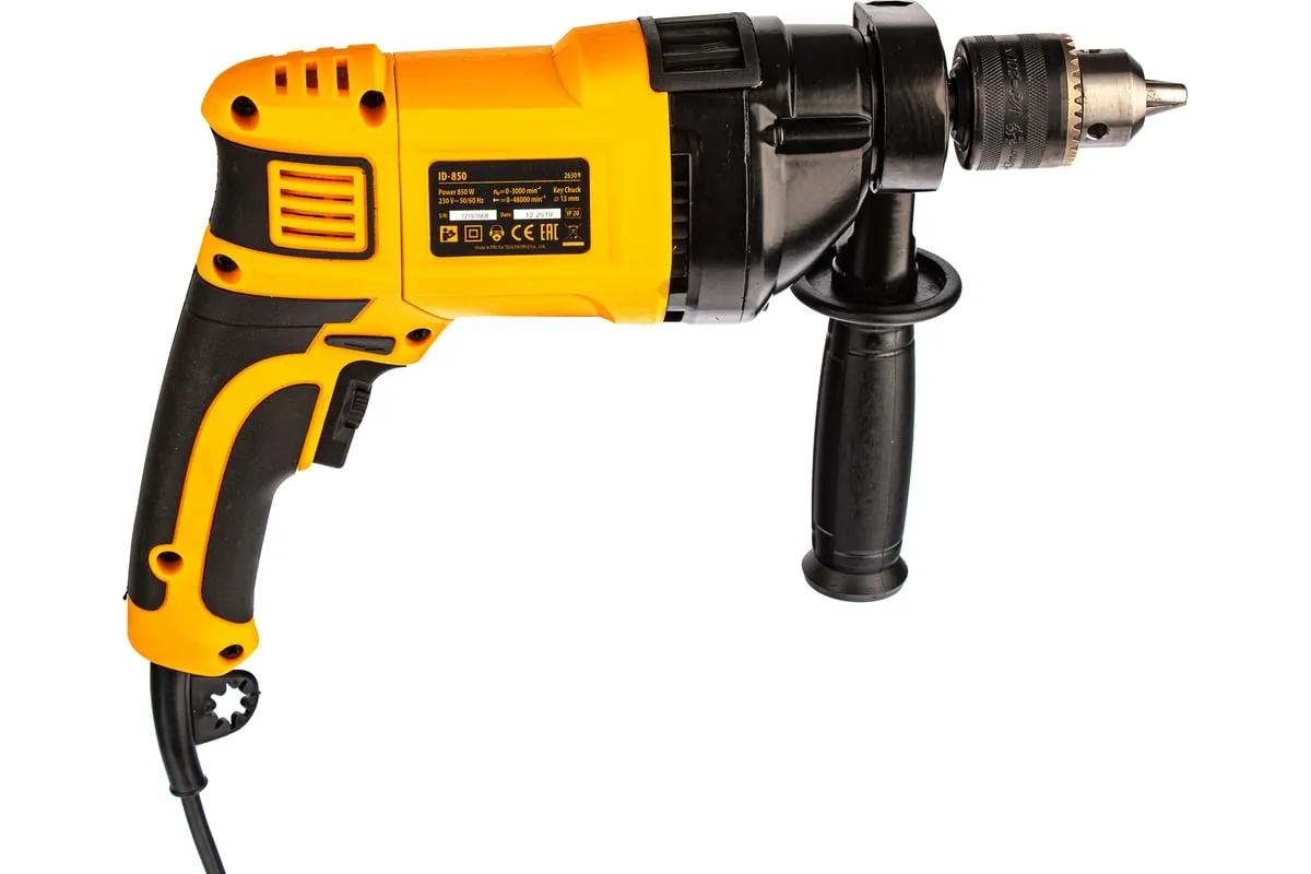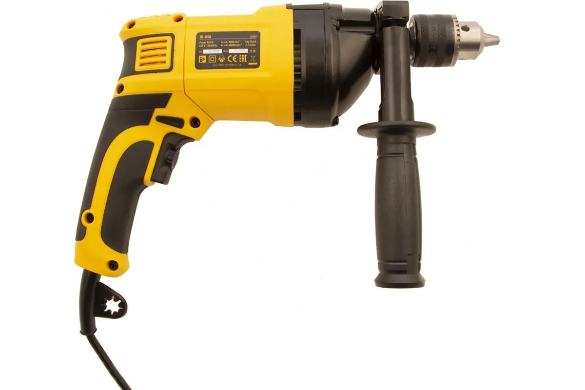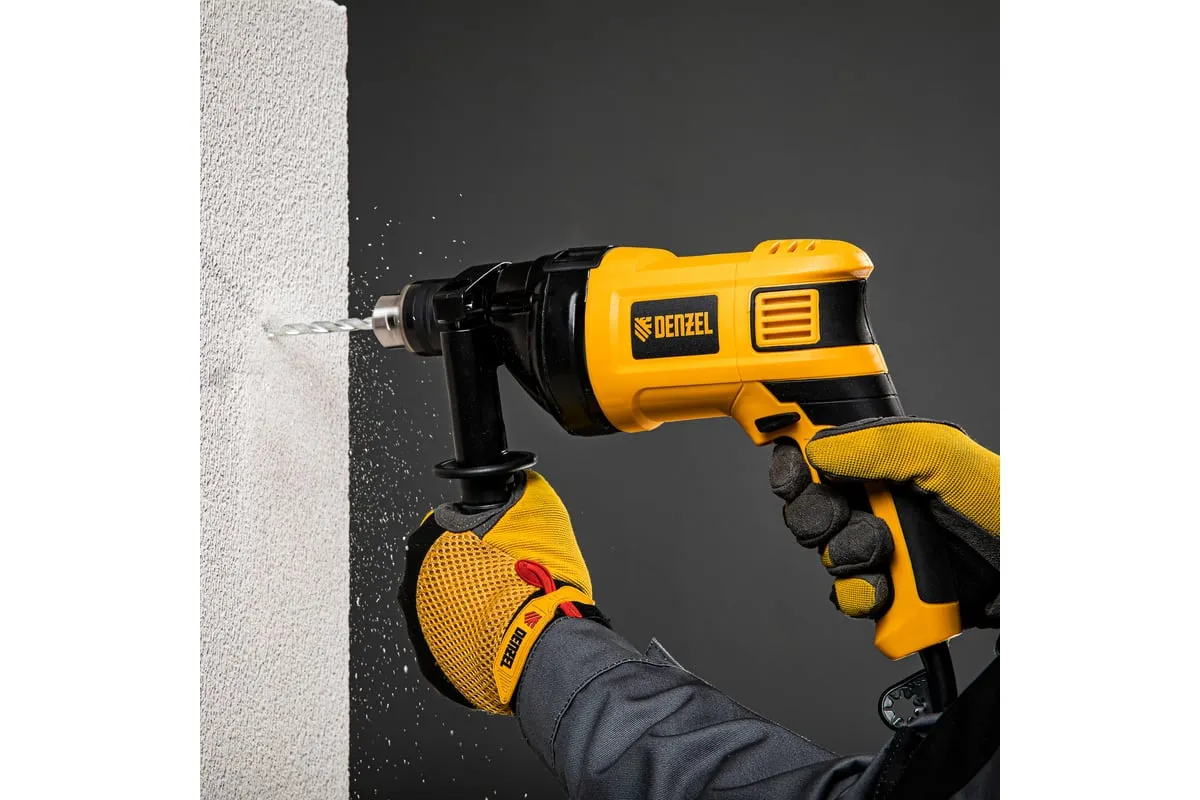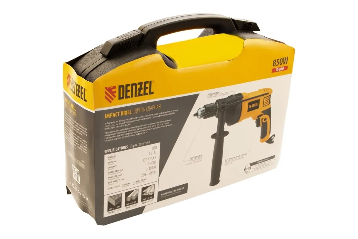 Ударная дрель DENZEL ID-850 26309 используется для сверления в различных стройматериалах: дереве, металле, кирпиче, легком бетоне. Питается от сети 220 В.