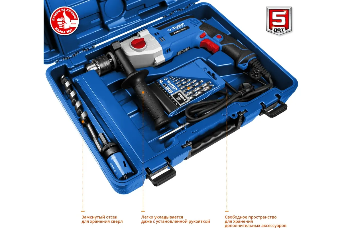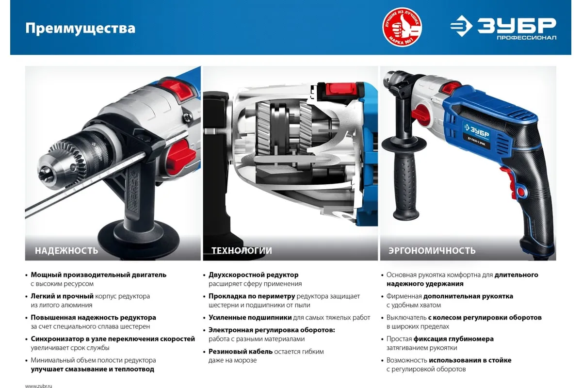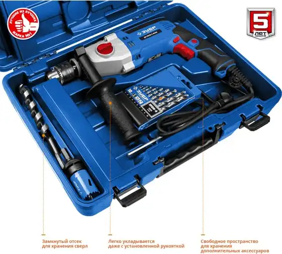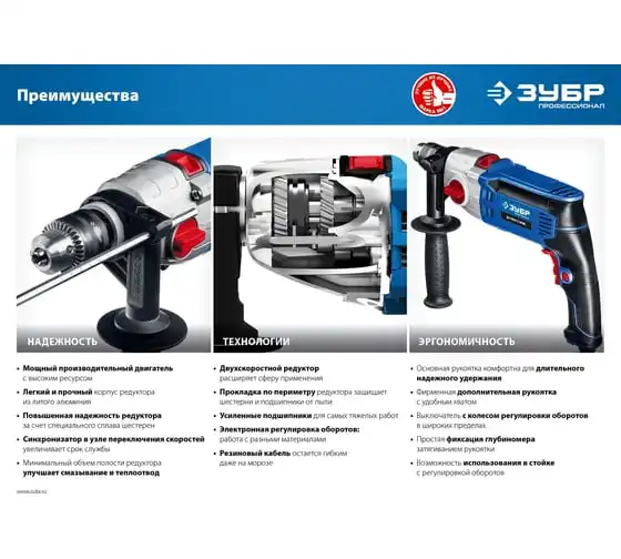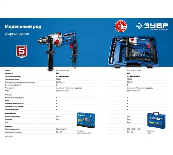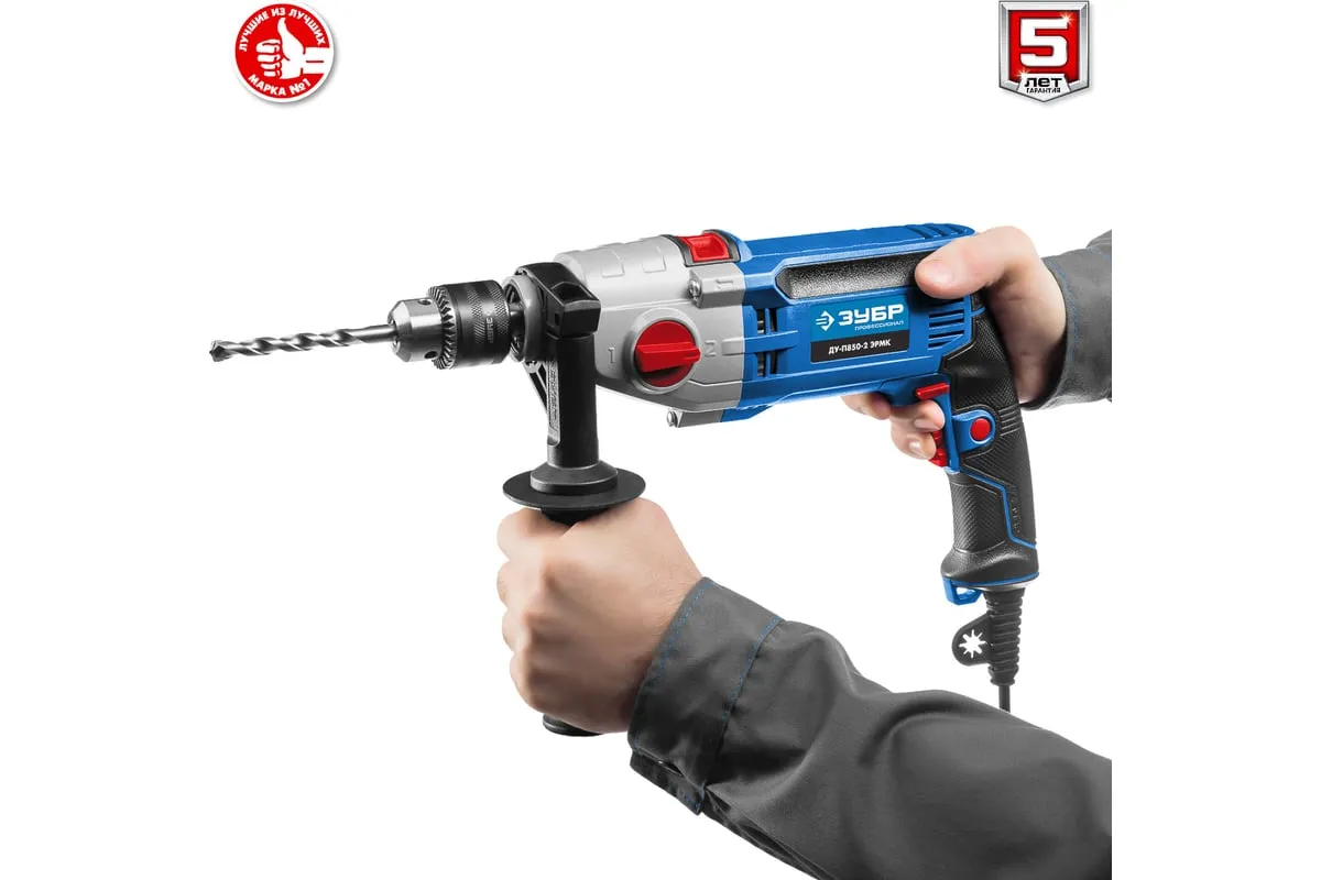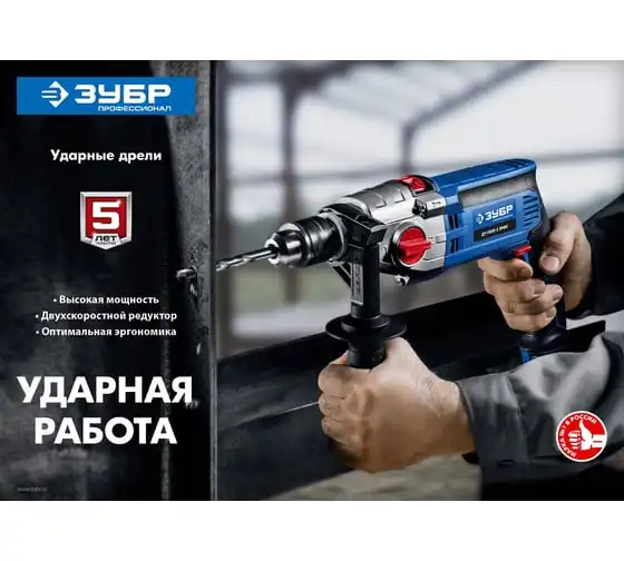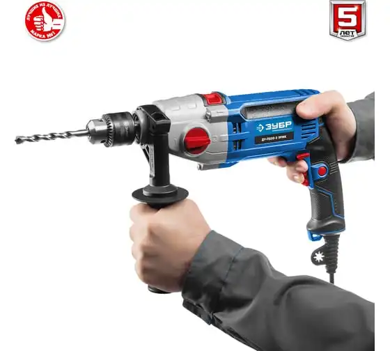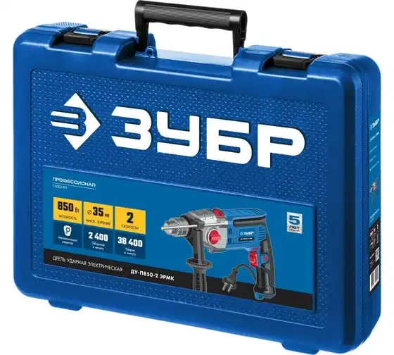 Ударная дрель Зубр ПРОФЕССИОНАЛ ДУ-П850-2 ЭРМК надежна и эффективна в эксплуатации. Подходит как для сверления отверстий, так и монтажа резьбовых соединений (при наличии соответствующей оснастки). Имеет мощный двигатель и ударный механизм. Корпус редуктора выполнен из литого под давлением алюминия, что обеспечиваетвысокую прочностьилучший теплоотвод. Муфта в механизме переключения скоростейпредотвращает повреждение шестеренпри переключении. Плавная регулировка оборотов в широком диапазонепозволяет подобрать оптимальный рабочий режим для каждого материала. Реверс помогаетбезопасно извлечь заклинившее сверло.