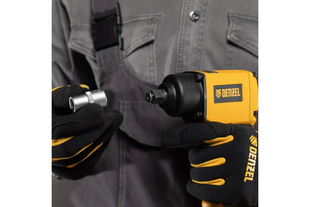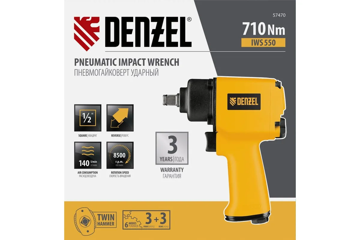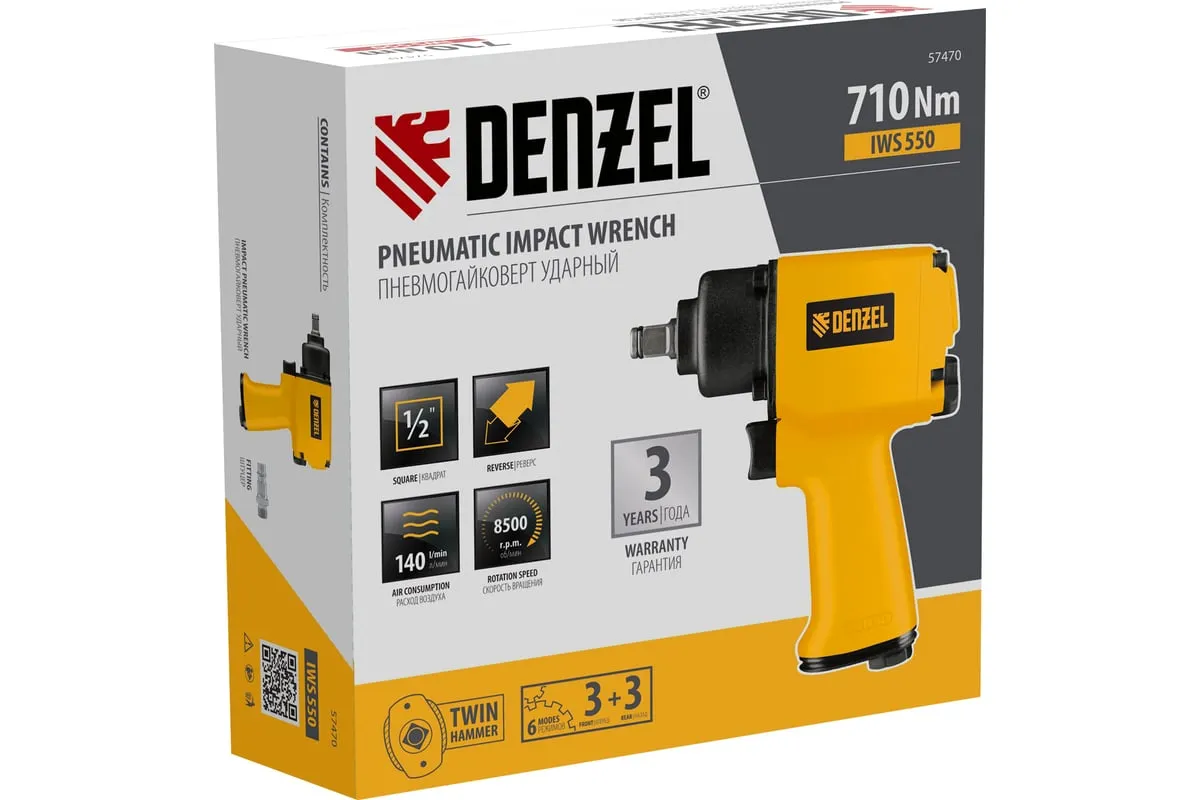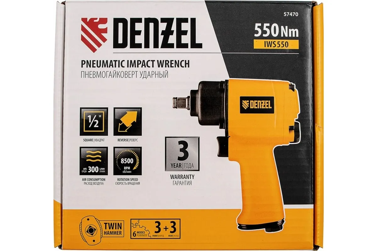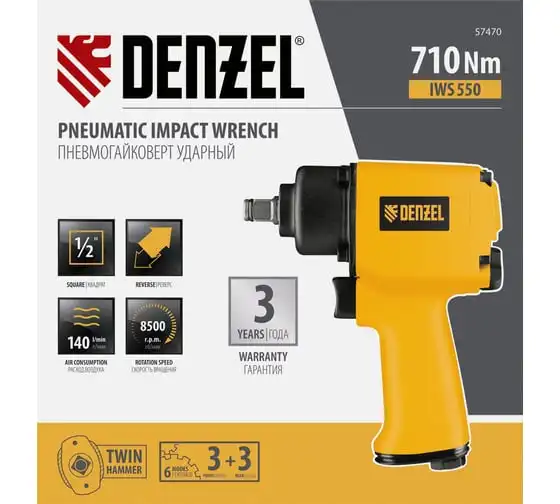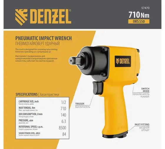 Гайковерт пневматический ударный Denzel IWS550 Compact 57470, 710 Нм, с патроном 1/2 дюйма, развивает скорость 8500 об/мин, достаточную для быстрого закручивания/откручивания гаек и болтов.