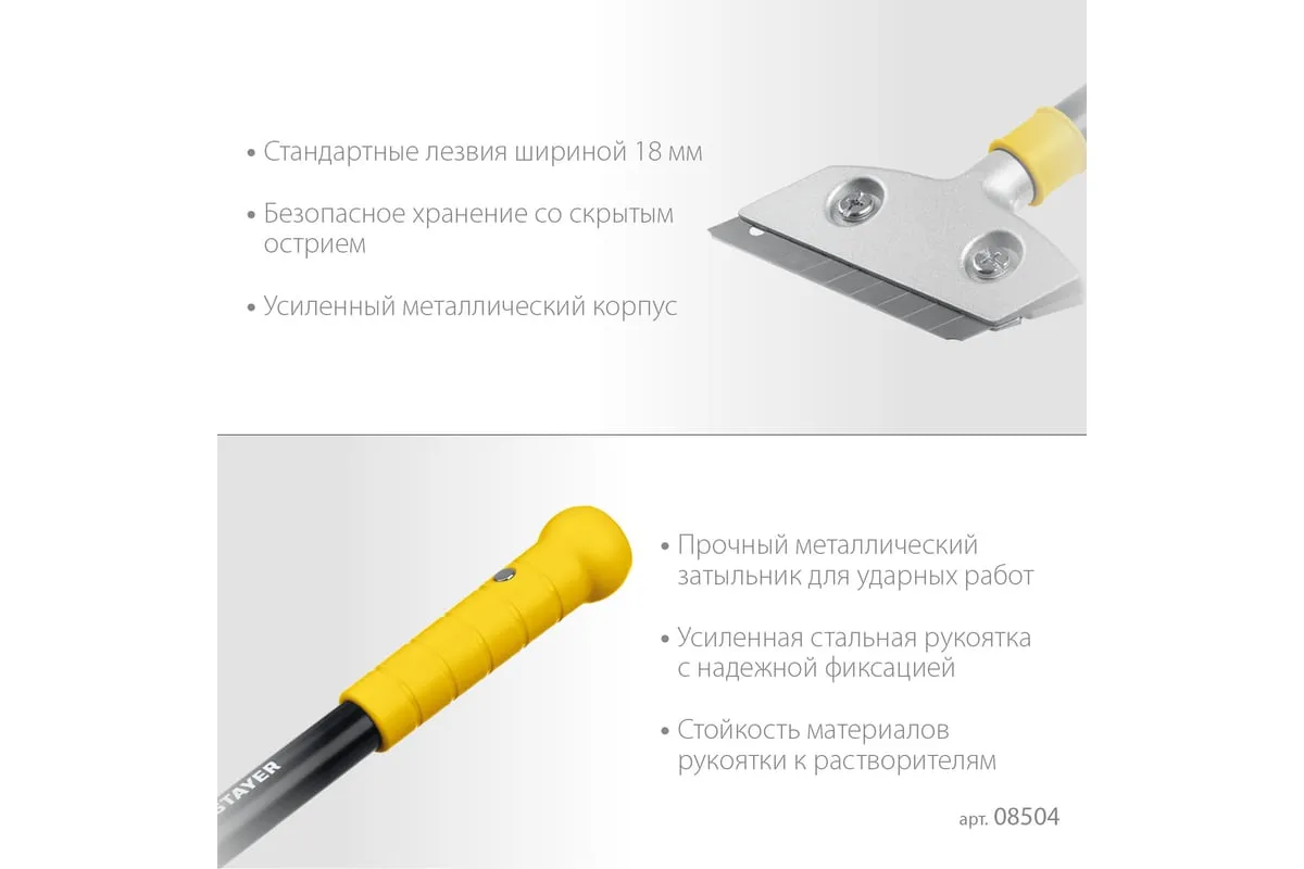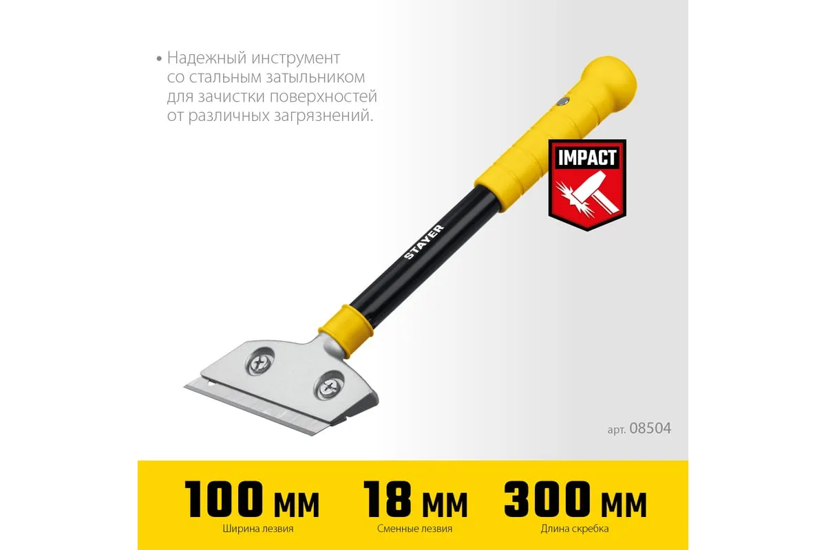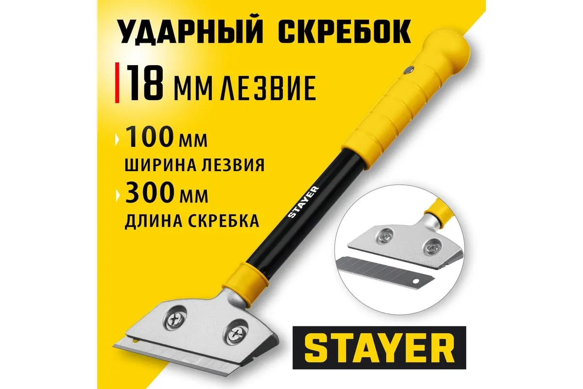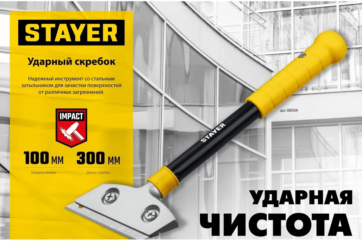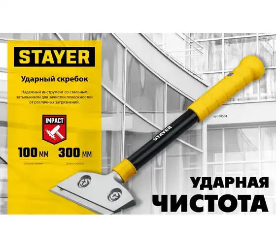 Ударный скребок со стальным затыльником используется для зачистки поверхностей от различных загрязнений. Применяется для очистки гладких поверхностей из кафеля, стекла, керамики от различных загрязнений.