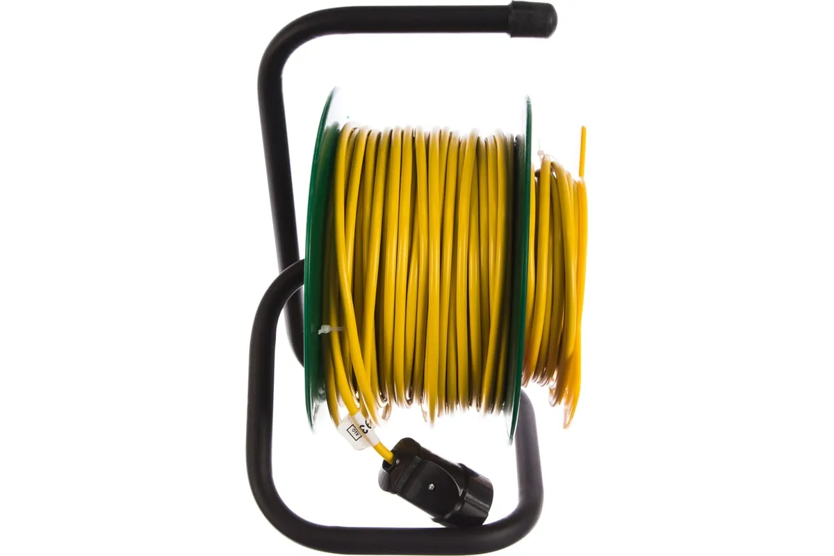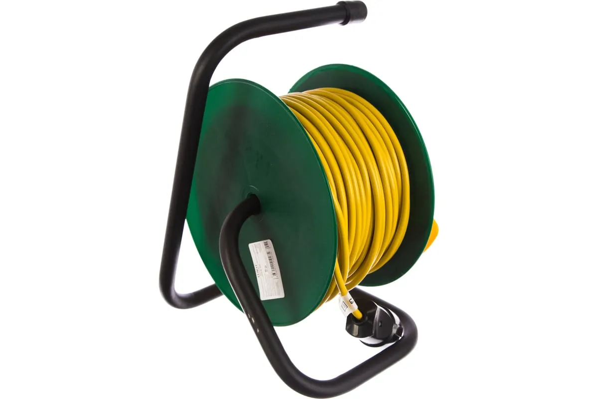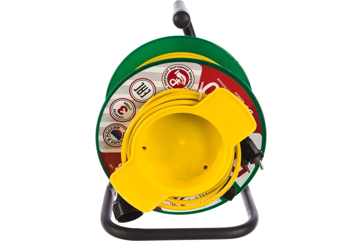 Удлинитель на катушке ТМ Союз 1 розетка 50м 481S-2205 предназначен для работы с электрическими приборами, находящимися на удалении от стационарной розетки. Изделие состоит из провода ПВС 2х1 длиной 50 метров, который размещен на пластиковой катушке. Удлинитель оснащен ручкой для сматывания провода после работы и рукояткой для удержания удлинителя и его транспортировки. Катушка расположена на стальной стойке.