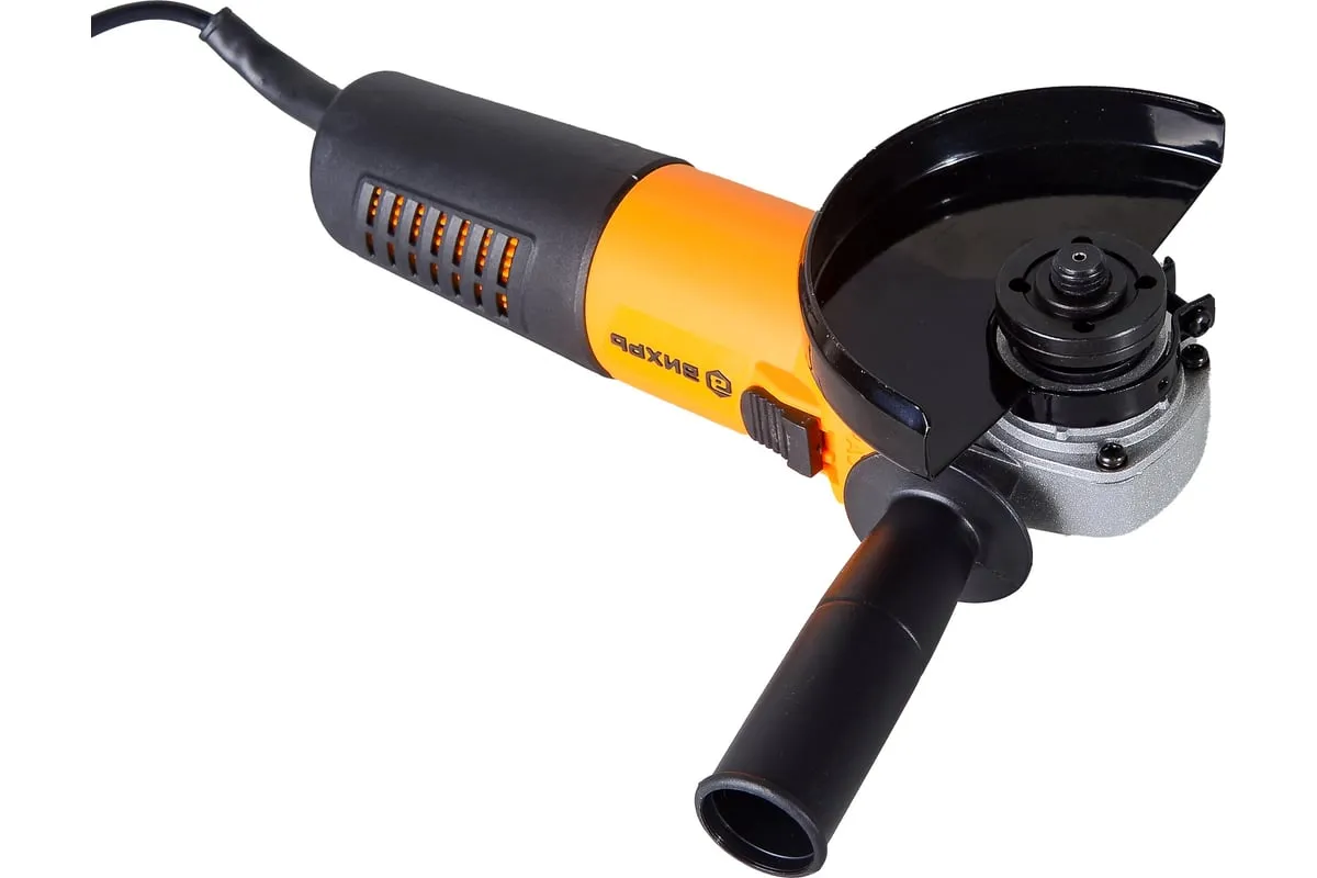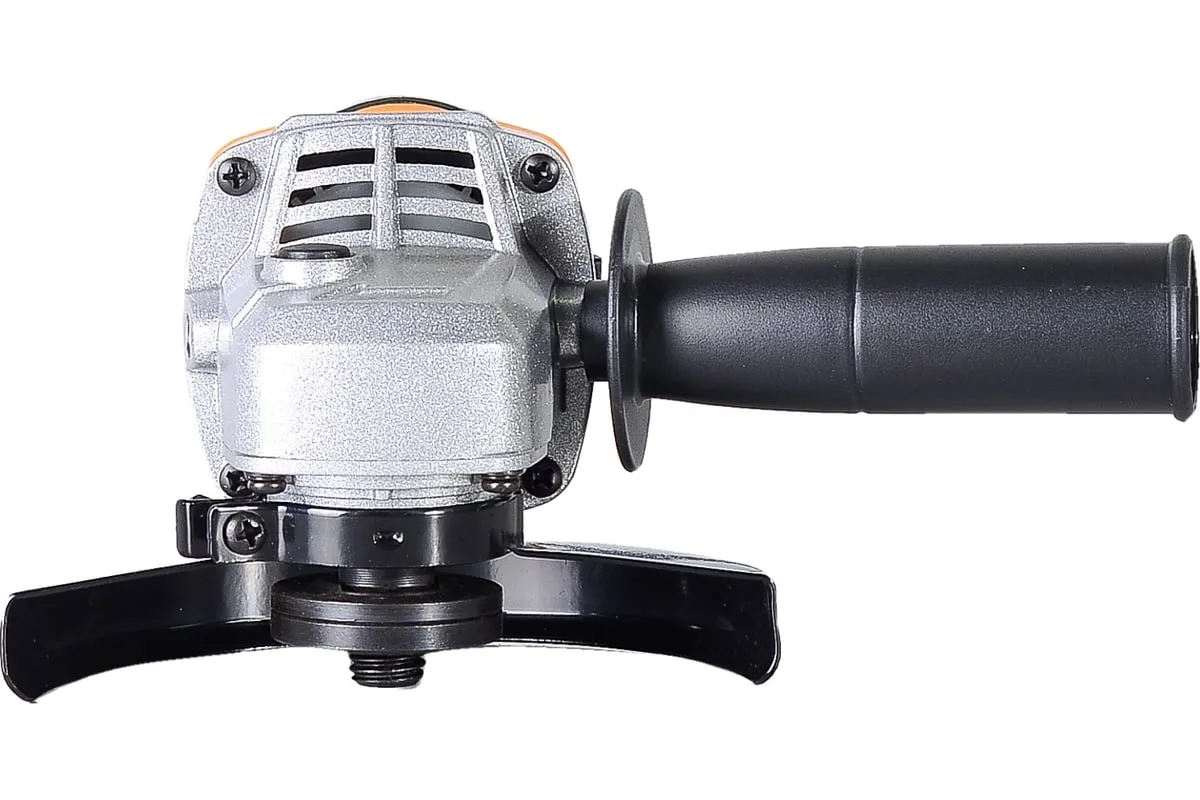 В корпусе УШМ предусмотрены вентиляционные отверстия. Через них происходит обдув электродвигателя, мощность которого составляет 800 Вт, в результате чего удается предупредить его перегрев и продлить срок службы. Рабочий элемент электроинструмента вращается с частотой до 11 000 об./мин. И защитный кожух, и рукоять могут менять положение, что позволяет удобно располагать УШМ при выполнении различных задач.