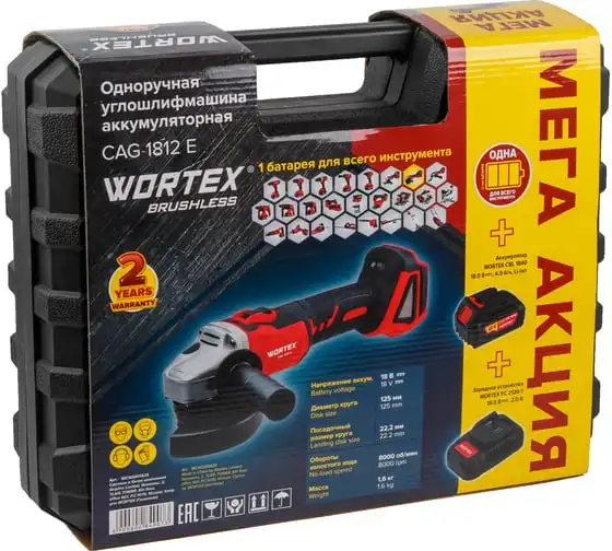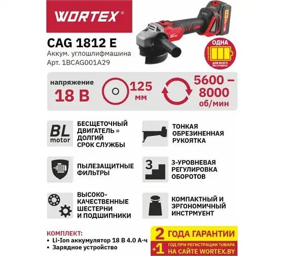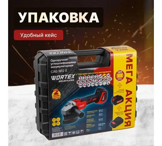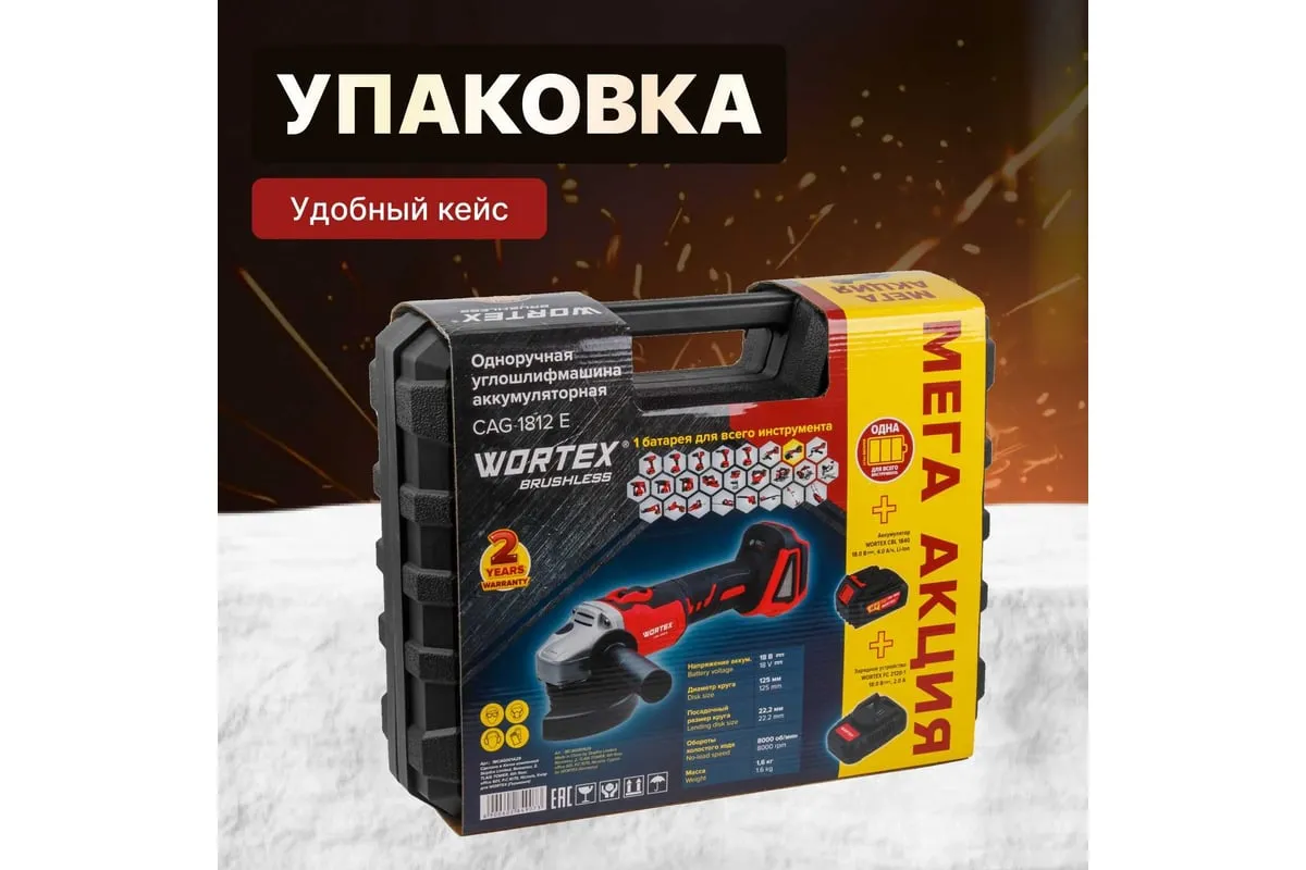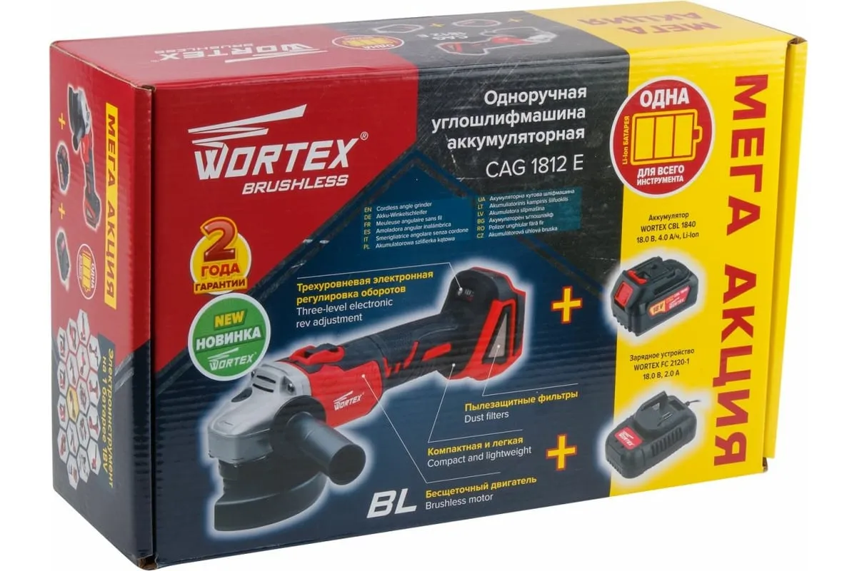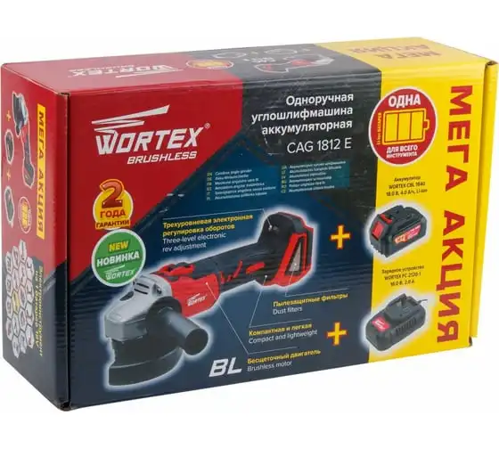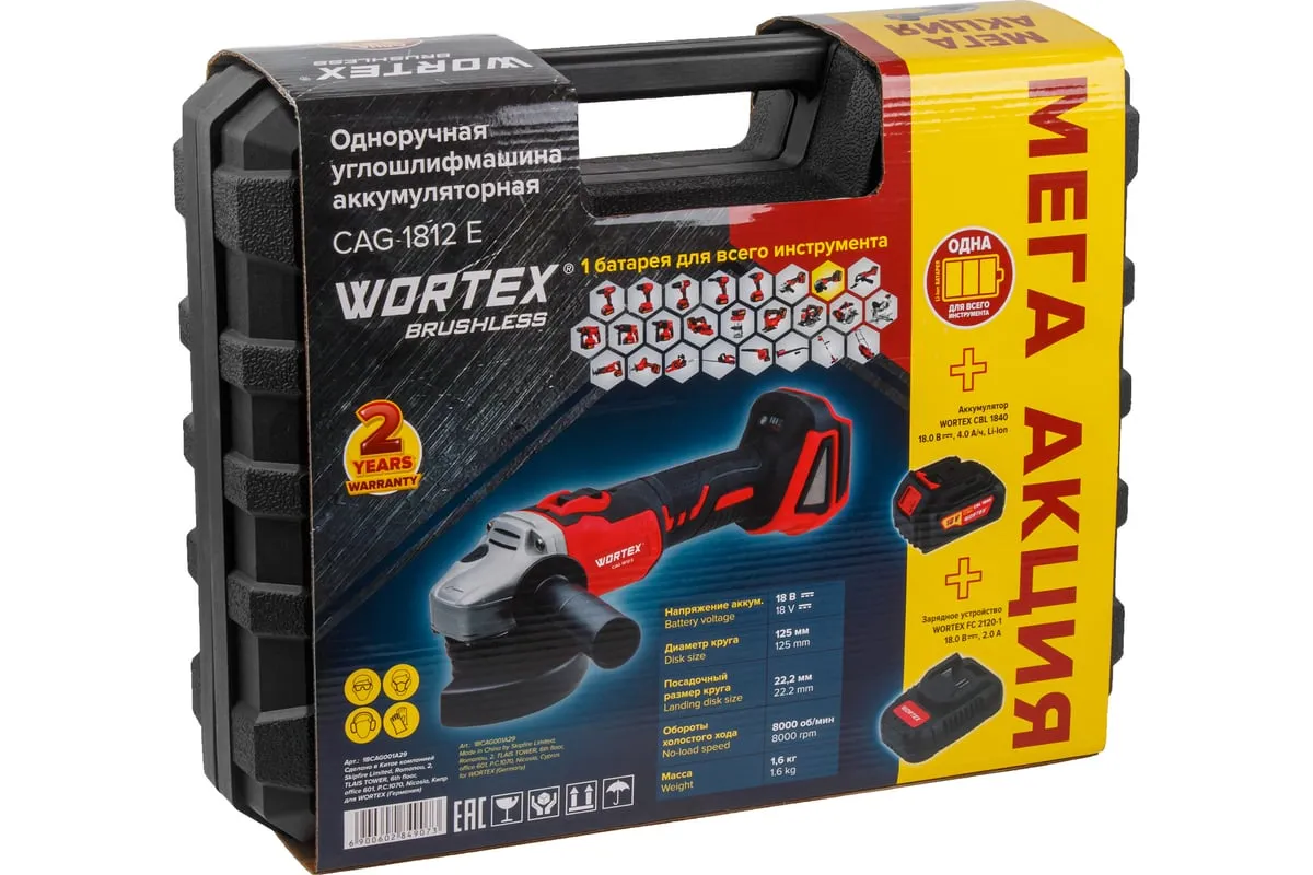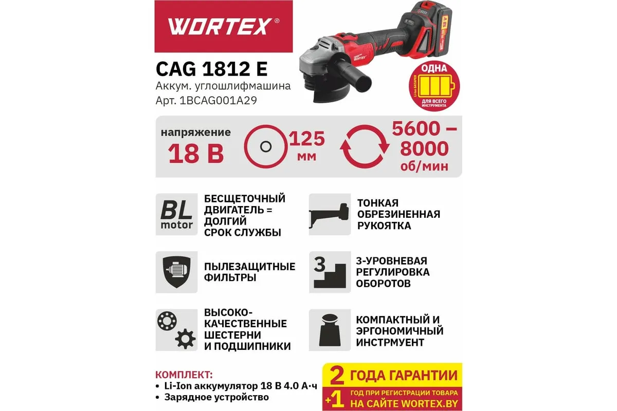 Угловая аккумуляторная шлифмашина WORTEX CAG 1812 E ALL1 1BCAG001A29 – бесщеточная аккумуляторная углошлифмашина с тонкой обрезиненной рукояткой отличается мощным двигателем, сочетающимся с небольшим весом и компактным размером, возможностью использования в местах без электроснабжения.