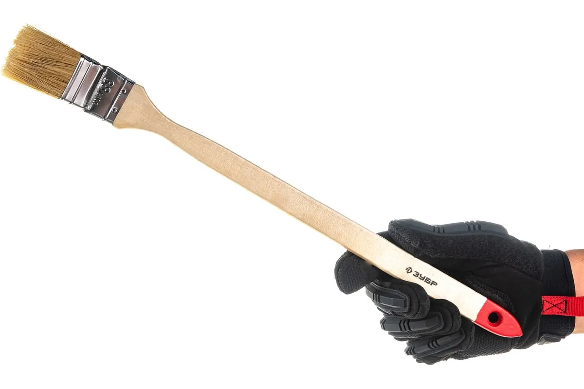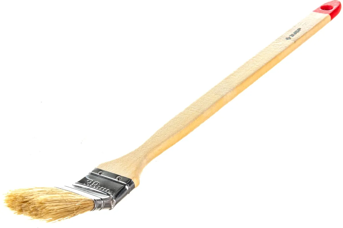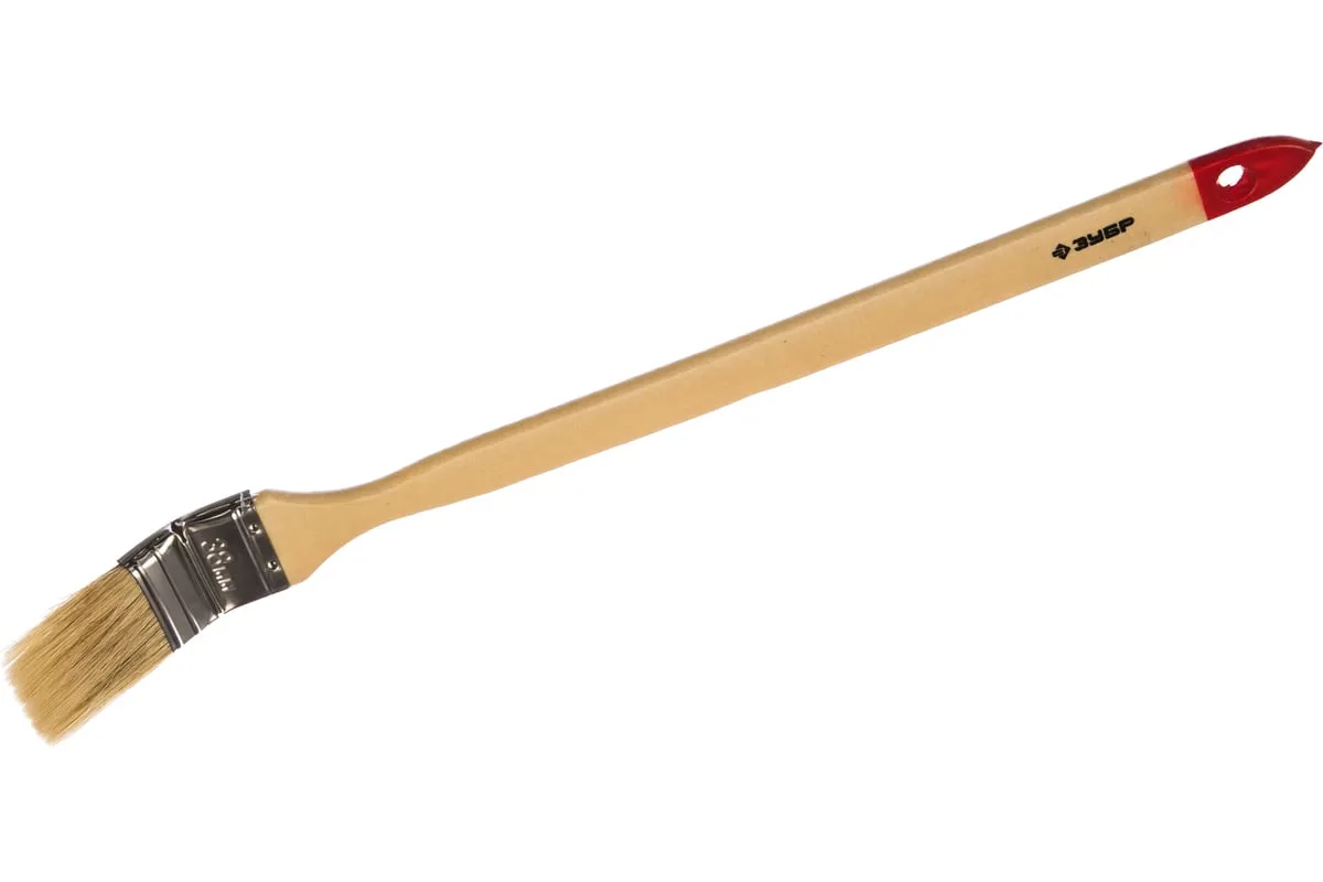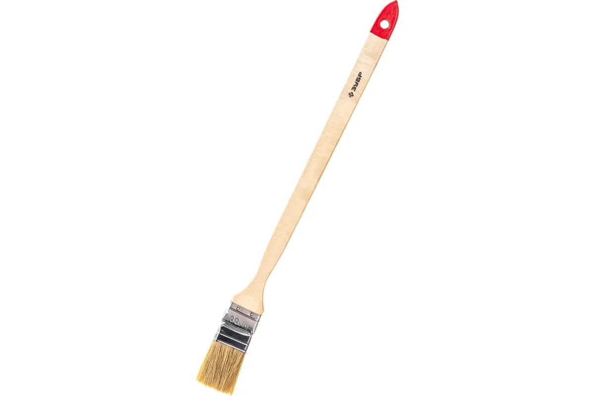 Угловая кисть ЗУБР УНИВЕРСАЛ-МАСТЕР 01041-038 используется при нанесении лакокрасочных материалов в труднодоступных местах, например за батареями отопления. Длинная деревянная рукоятка обеспечивает удобную работу кистью.