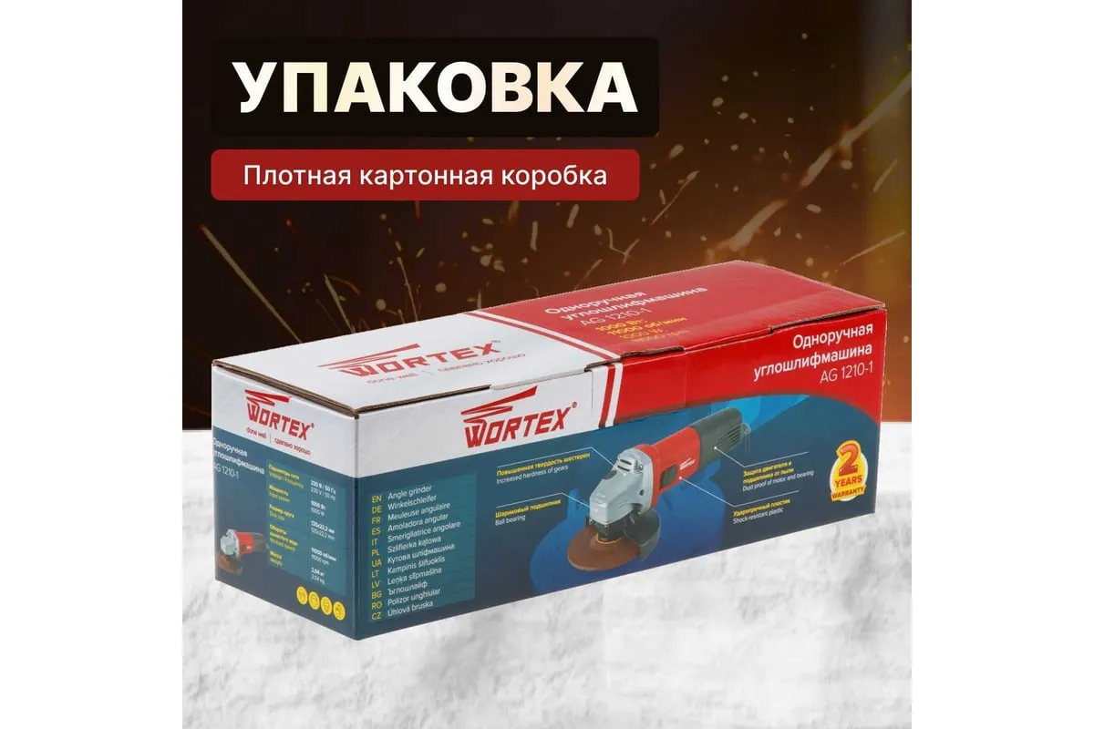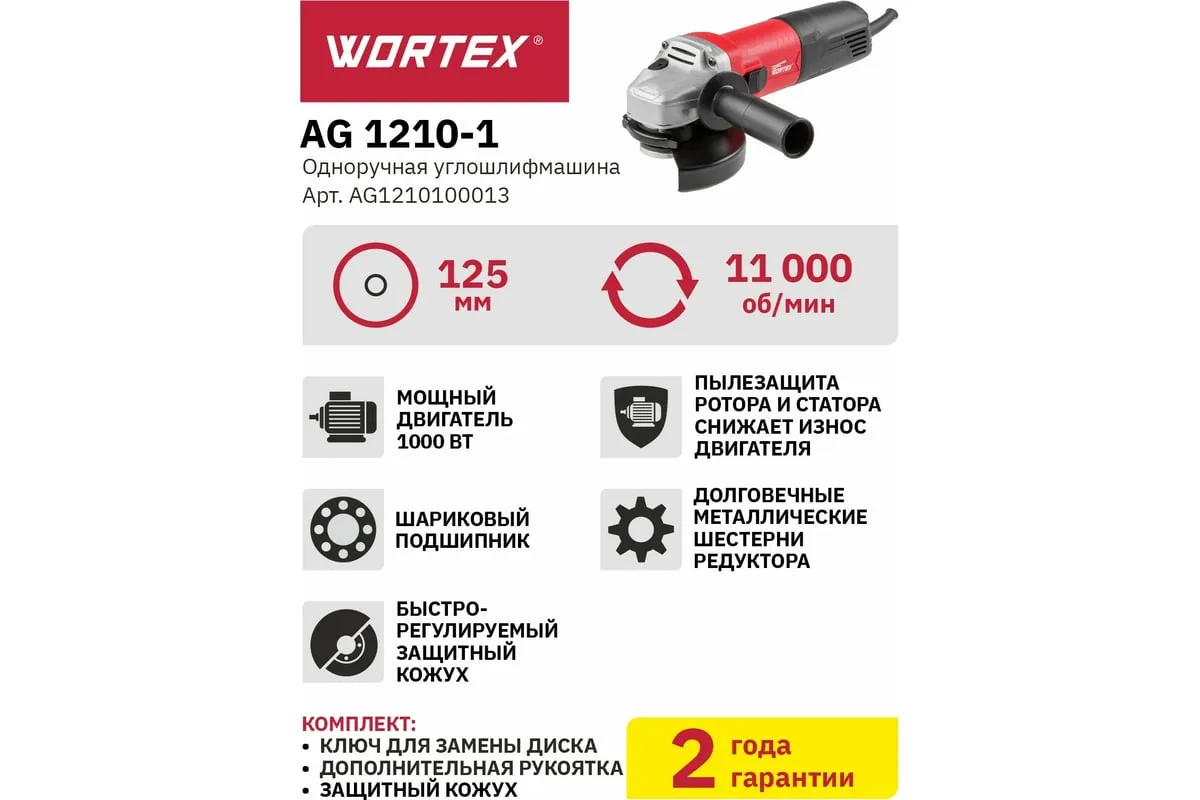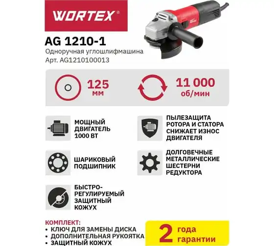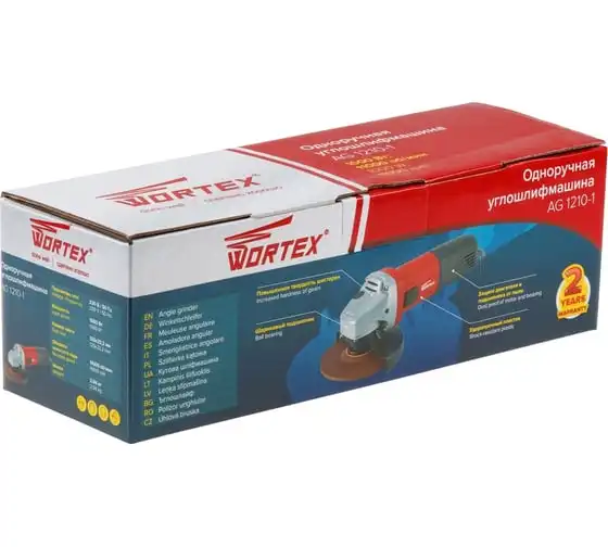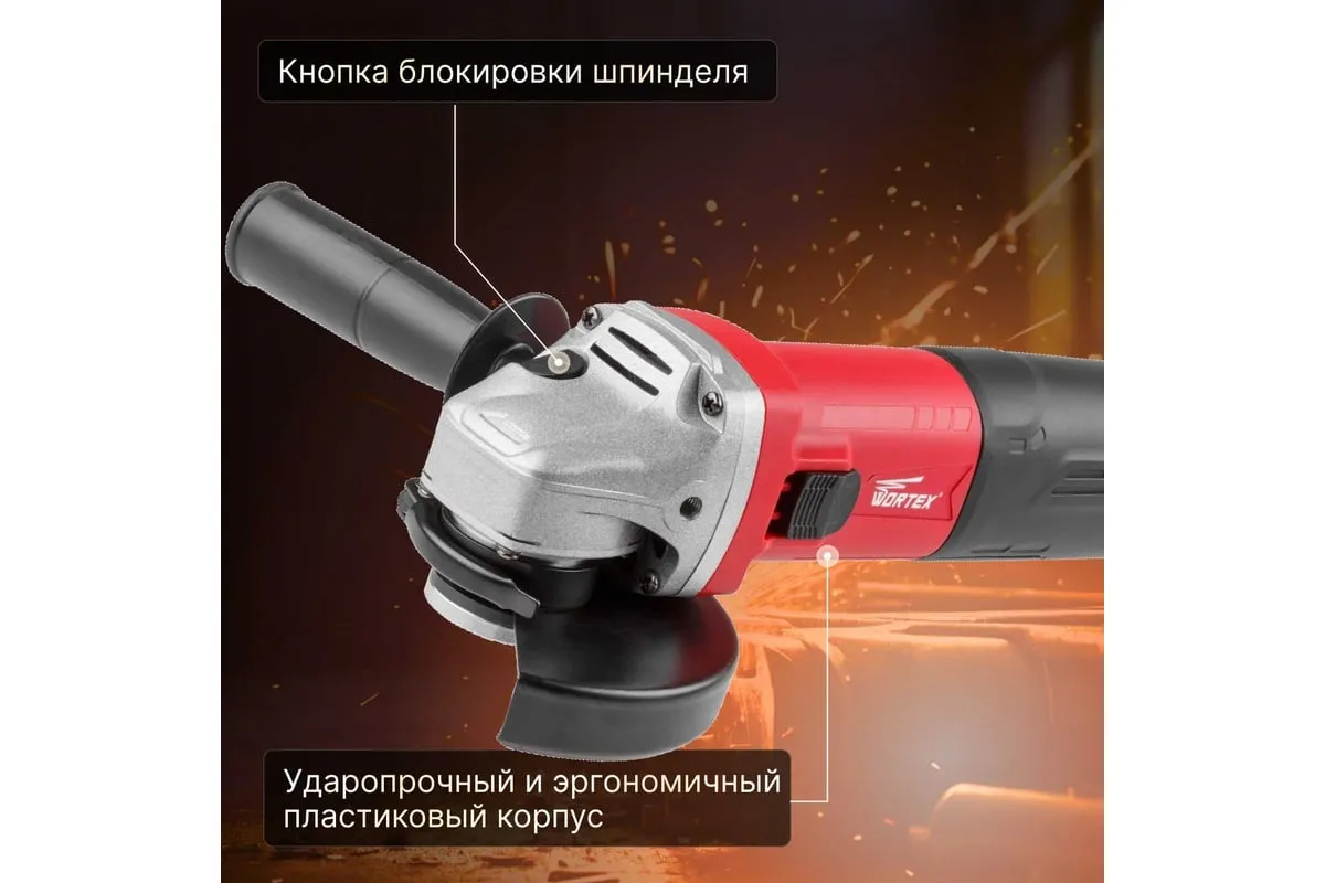 Угловая шлифмашина WORTEX AG 1210-1 AG1210100013 имеет бронированный ротор и статор, повышенную твердость шестерен, ударопрочный корпус, шариковый подшипник и пылезащиту.