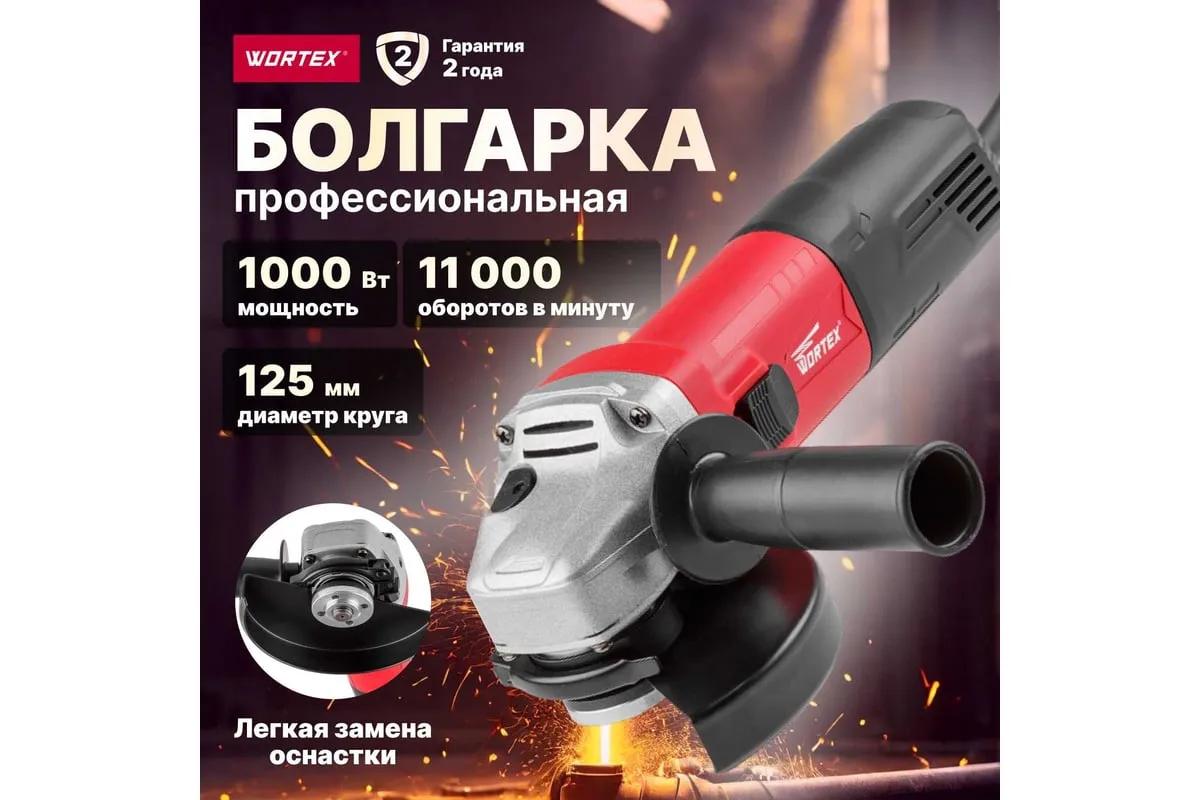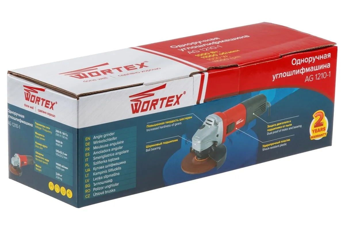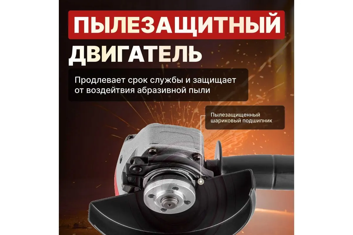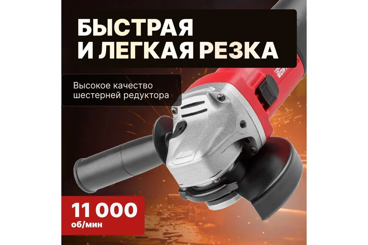 Угловая шлифмашина WORTEX AG 1210-1 AG1210100013 имеет бронированный ротор и статор, повышенную твердость шестерен, ударопрочный корпус, шариковый подшипник и пылезащиту.