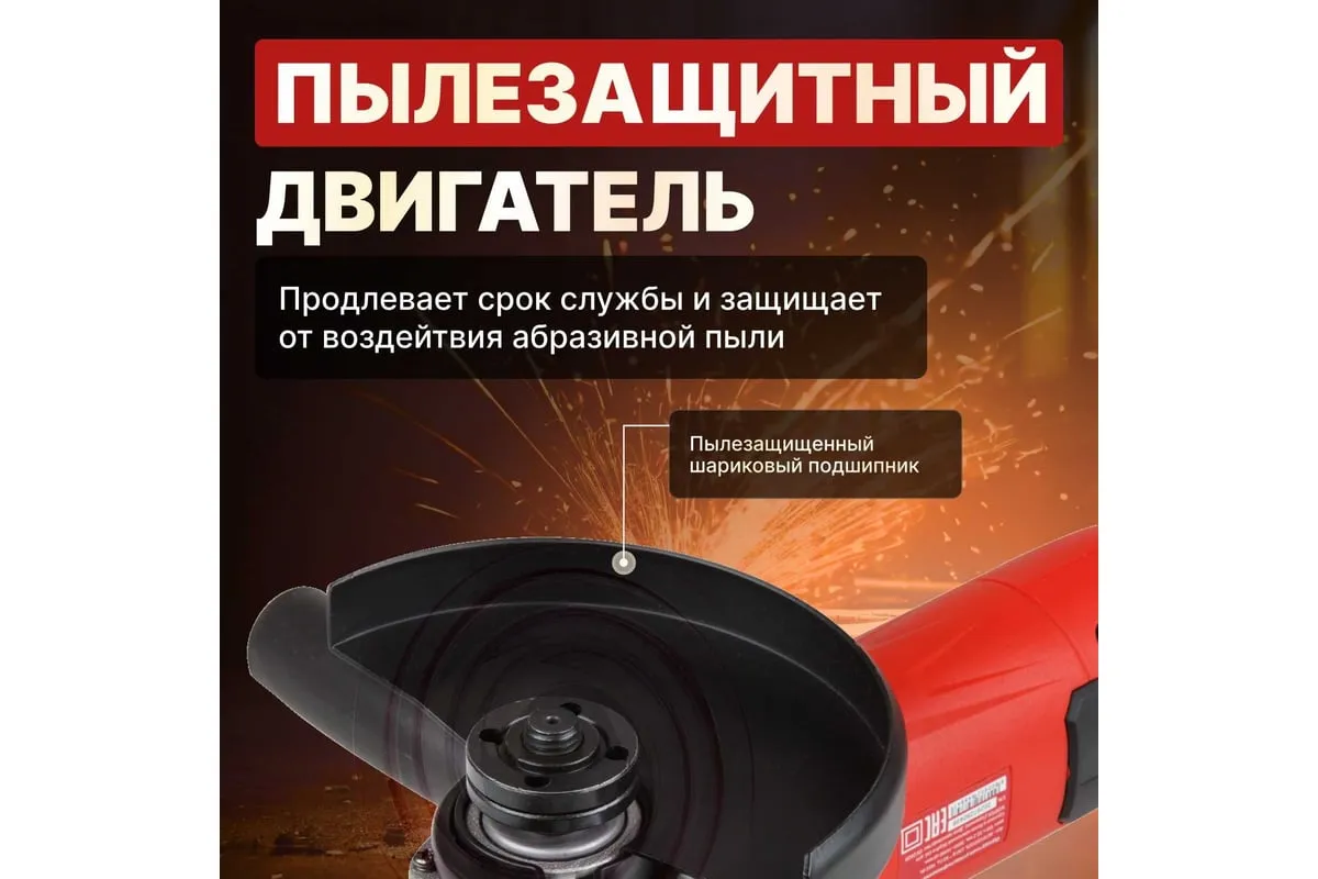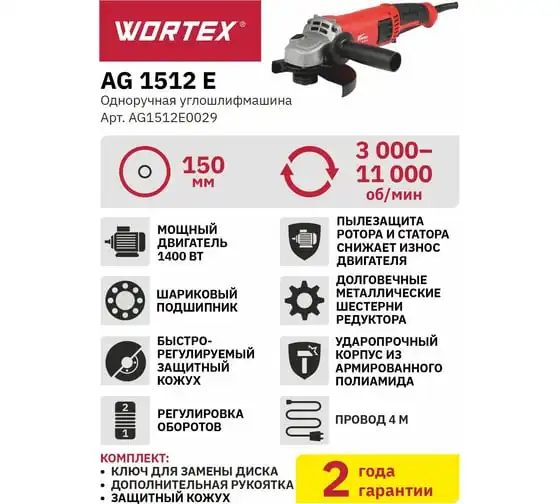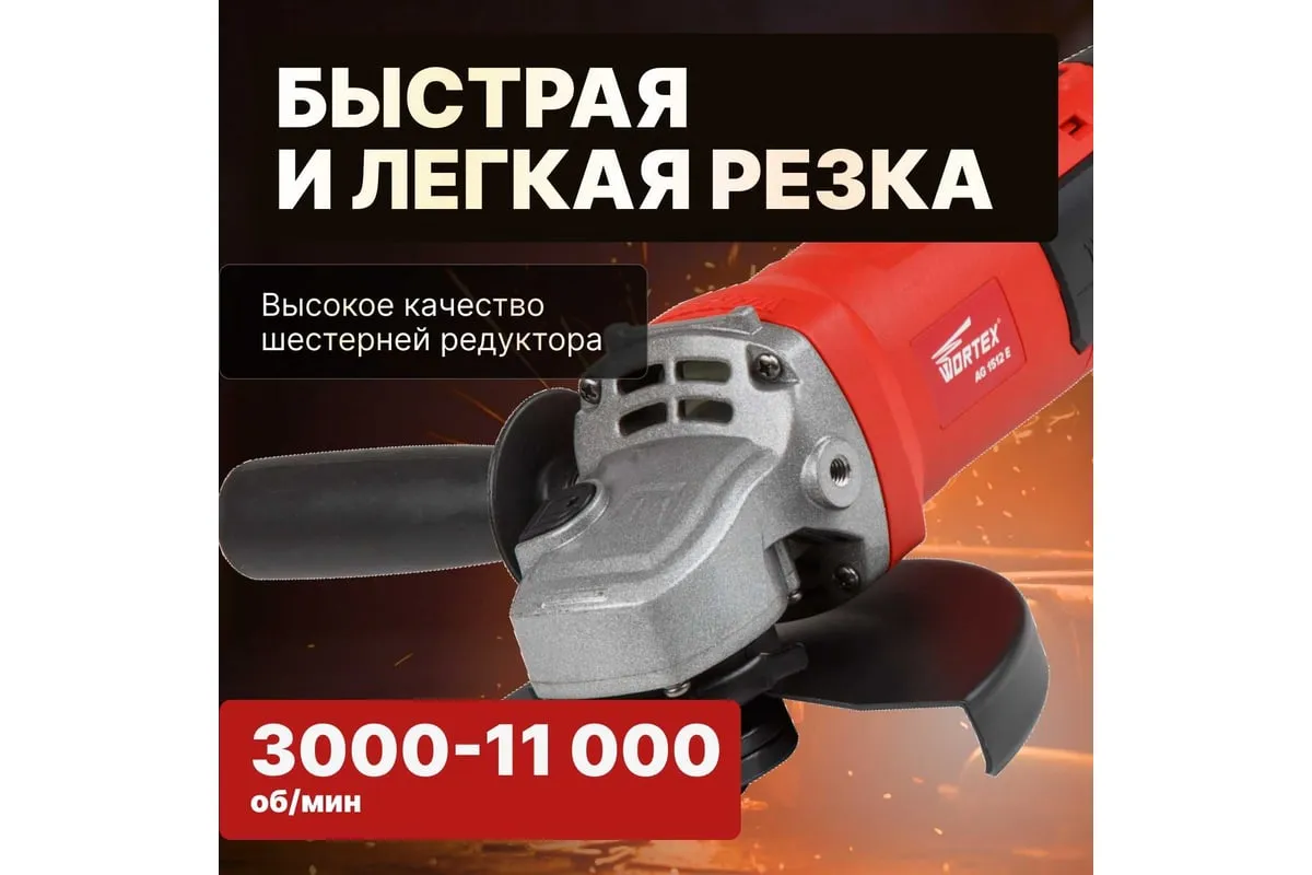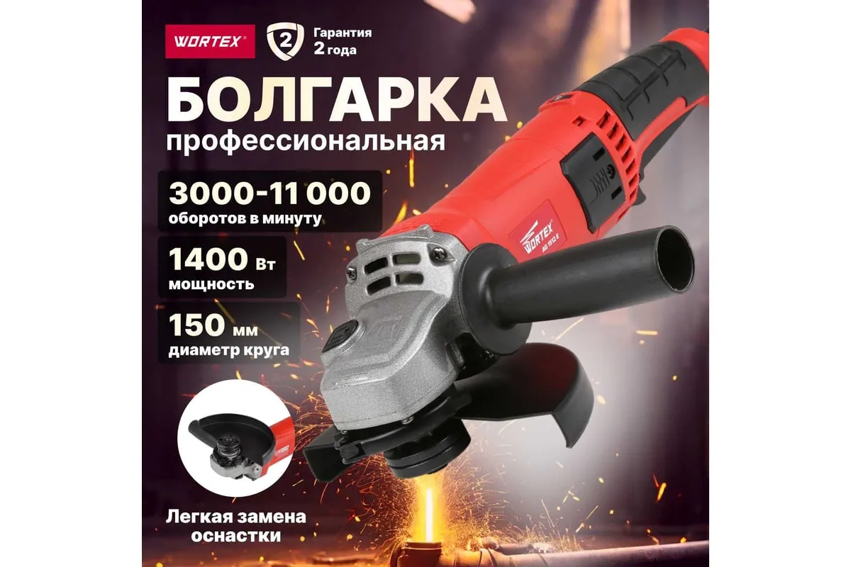Угловая шлифмашина WORTEX AG 1512 E AG1512E0029 оснащена мощным двигателем 1400 Вт.