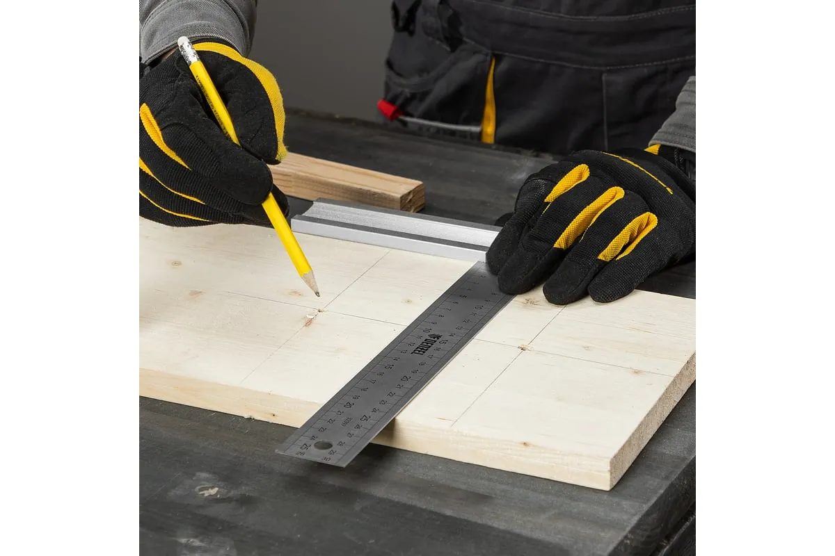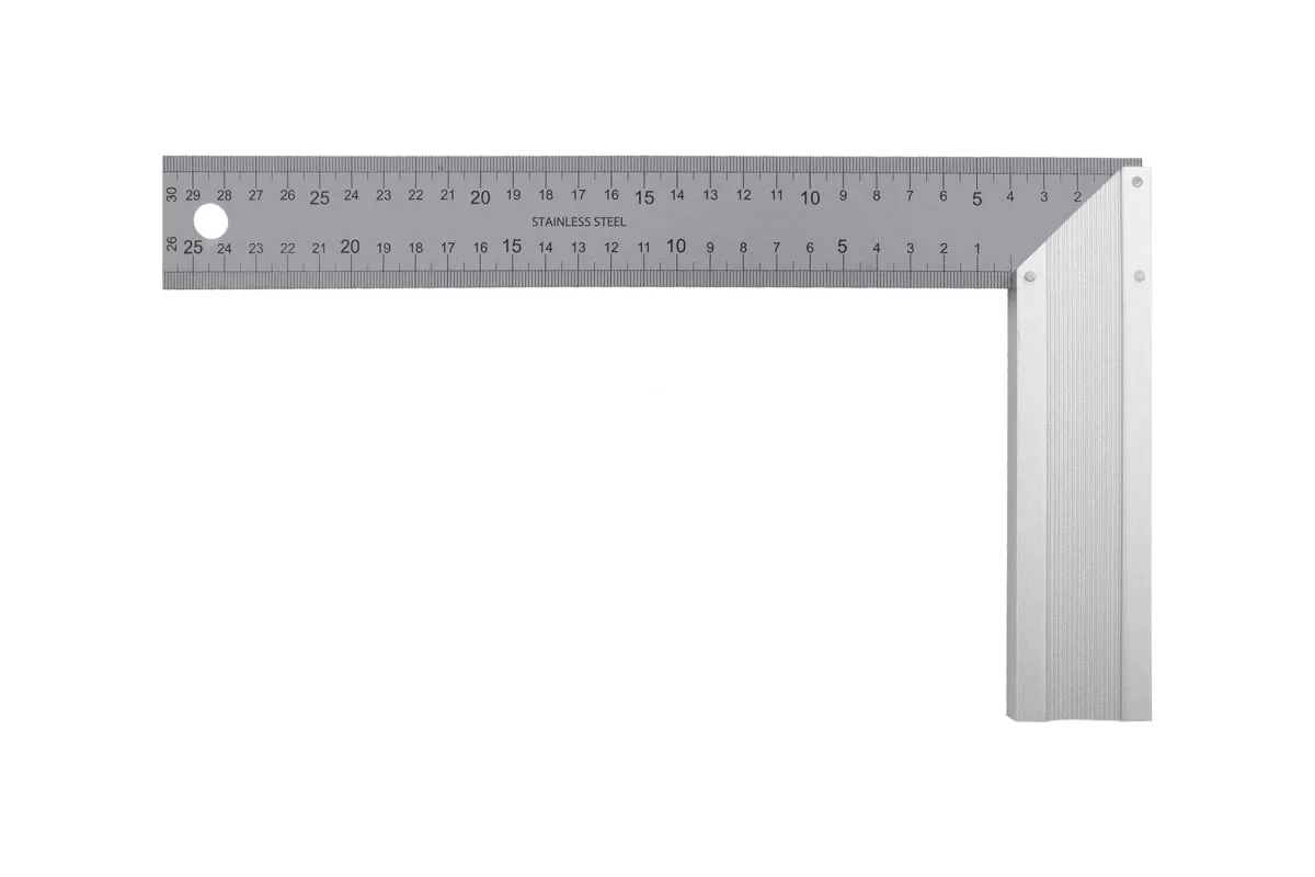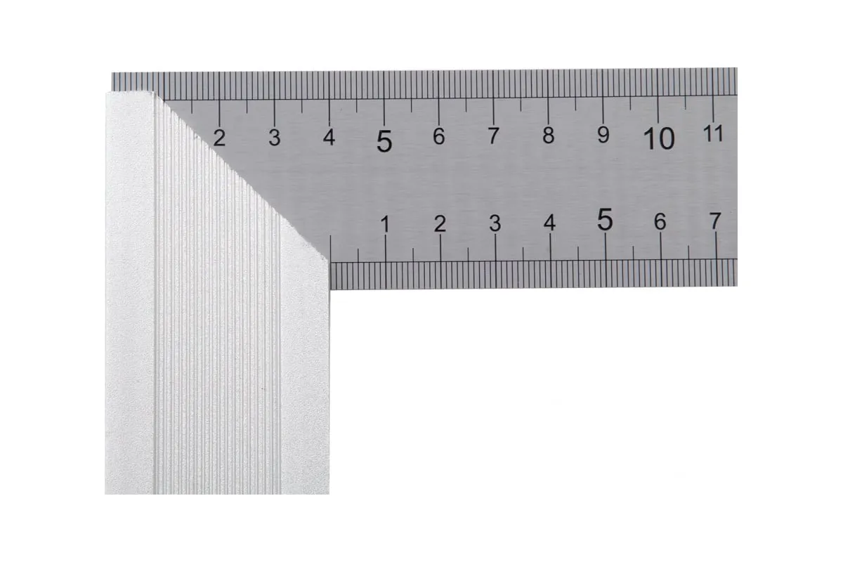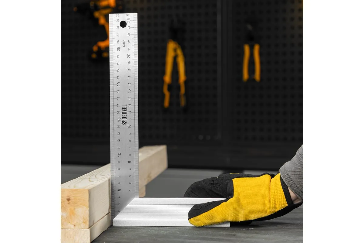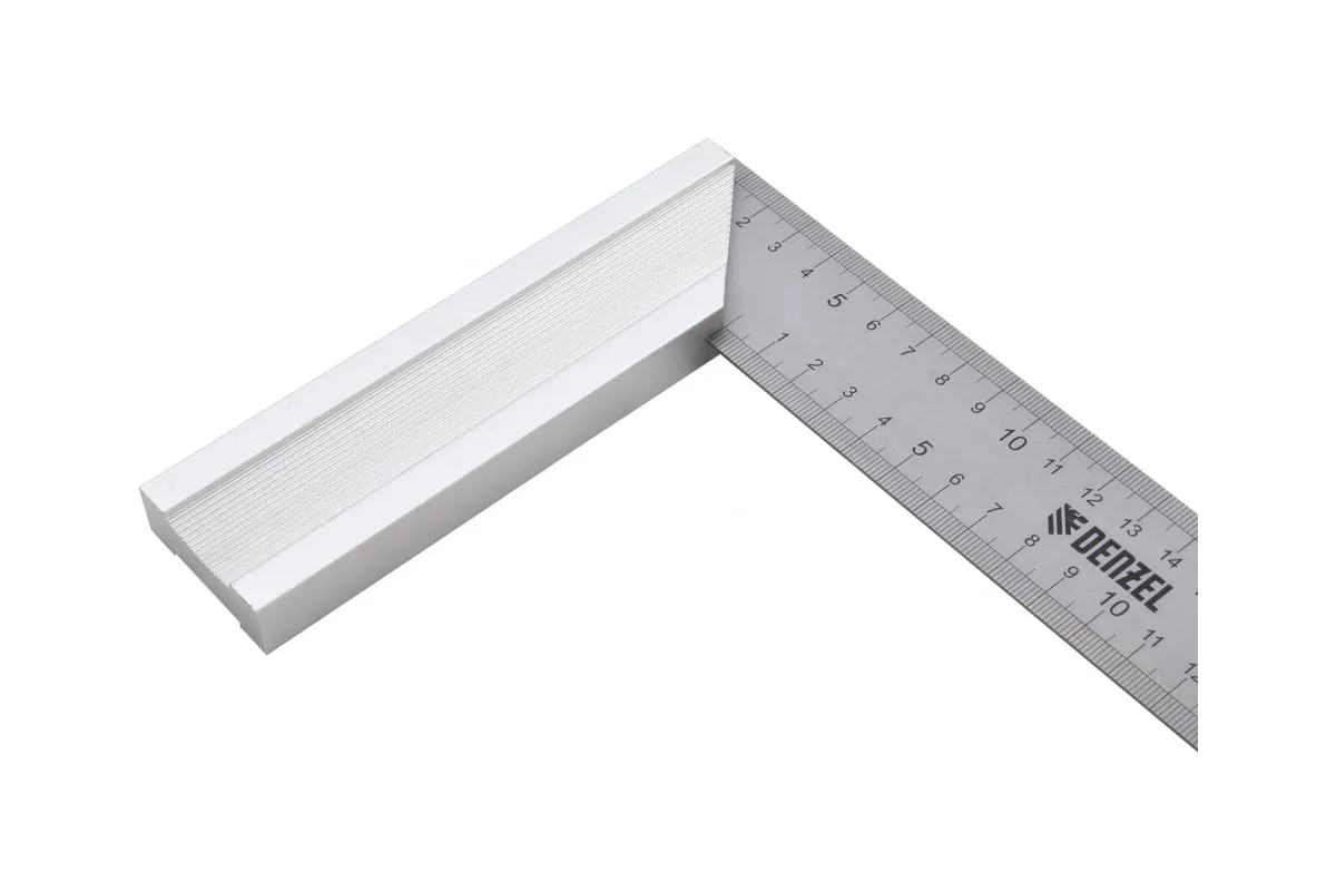 Стальной угольник Denzel 32397 длиной 300 мм, с градуировкой, алюминиевым основанием и полотном из нержавеющей стали, используется для построения и контроля углов. Будет полезен для выполнения столярных и строительных работ.