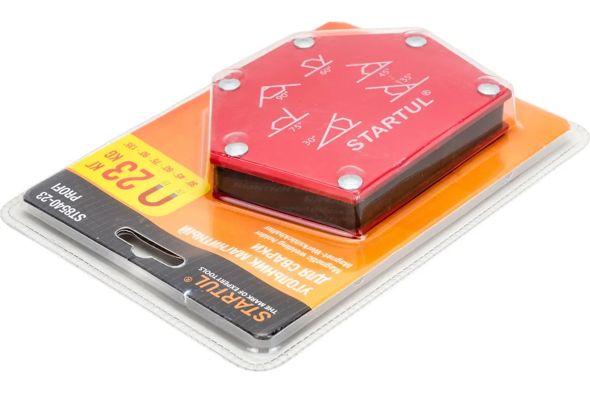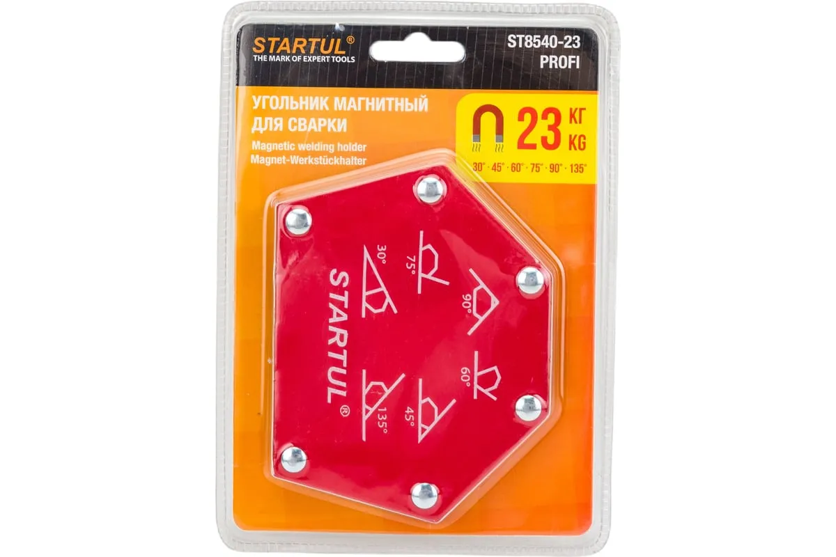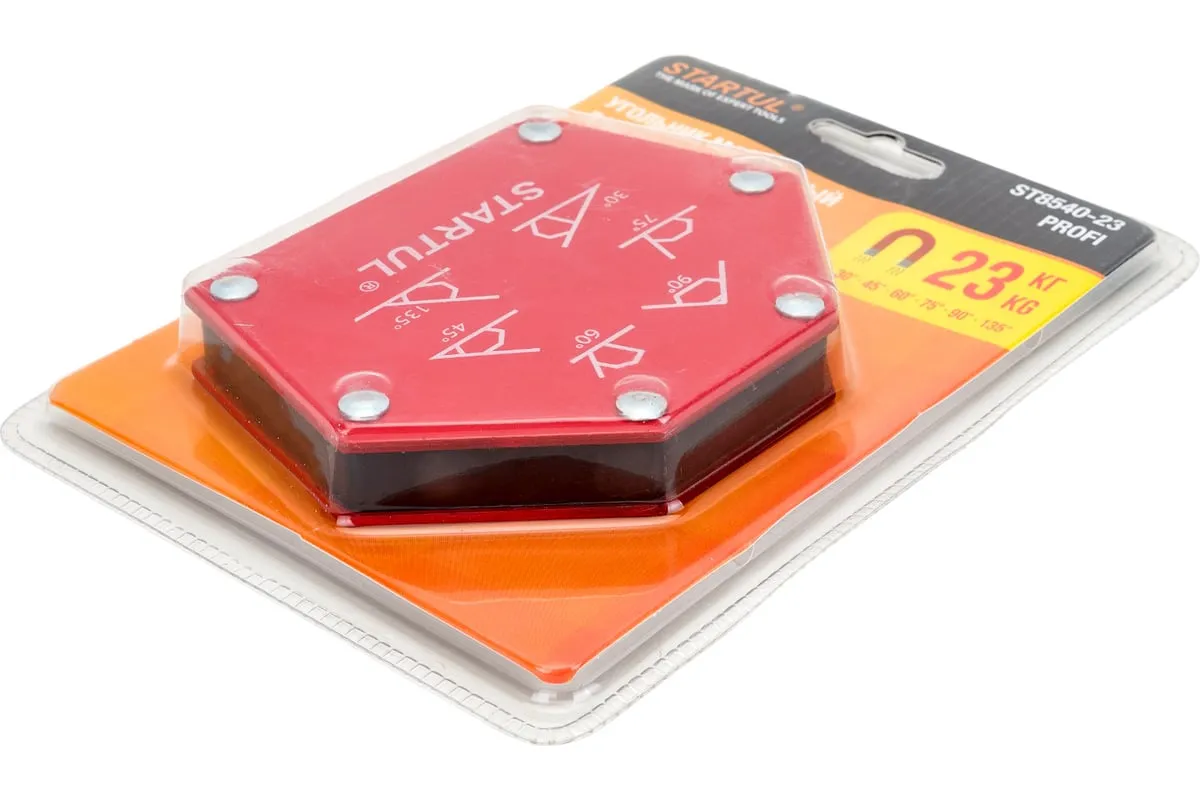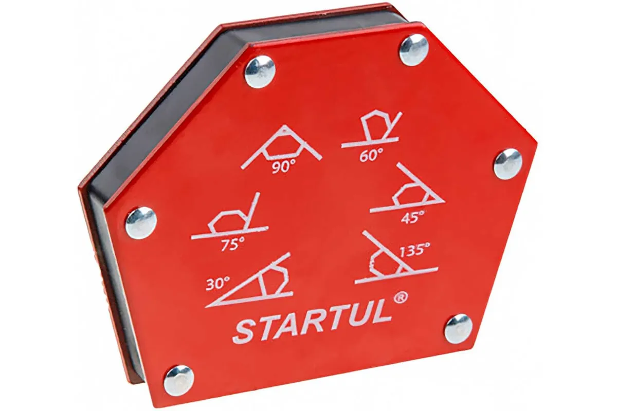 Угольник магнитный для сварки 23 кг STARTUL ST8540-23 предназначен для фиксации металлических деталей при сварке, пайке, сборке конструкций. Возможные углы: 30°, 45°, 60°, 75°, 90°, 135°.