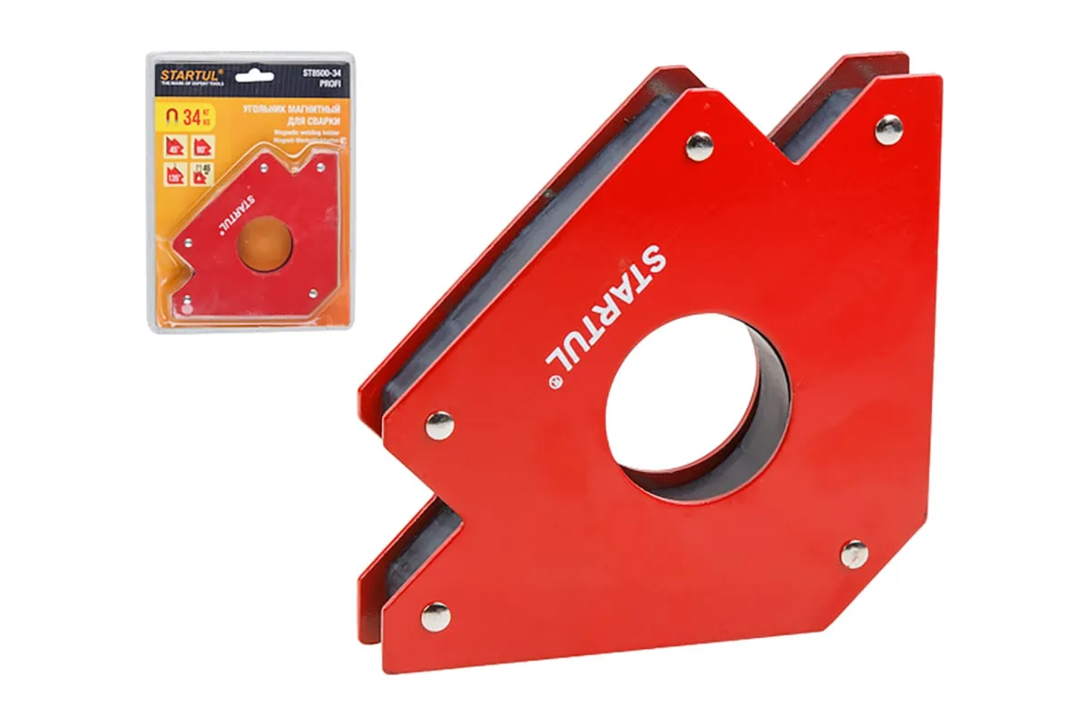 Угольник магнитный для сварки 34 кг STARTUL ST8500-34 предназначен для фиксации металлических деталей при сварке, пайке, сборке конструкций. Возможные углы: 45°, 90°, 135°.