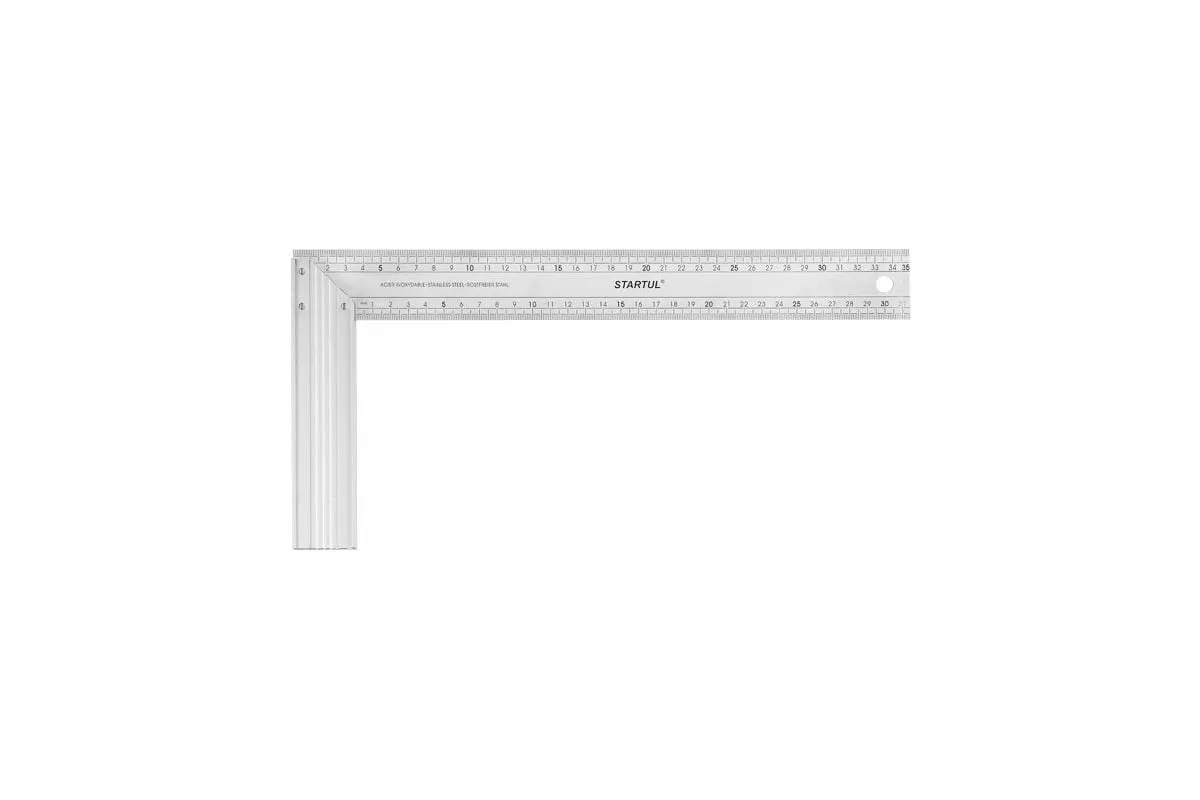 Угольник STARTUL 350 мм ST3525-035 предназначен для разметки и проверки прямых углов, а также для проверки угла 45 градусов при обработке и сборке изделий. Рукоятка выполнена из алюминия. Измерительный профиль изготовлен из качественной нержавеющей стали, что обеспечивает надежность и долговечность. Метод нанесения шкалы - травление. Толщина измерительного профиля 0,8 мм.