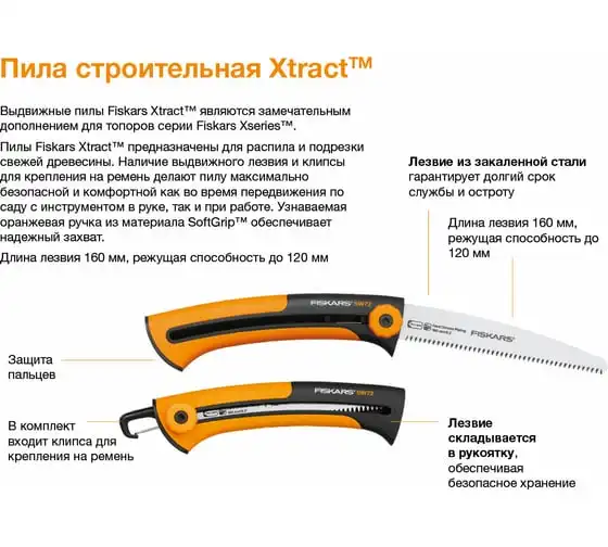 Удобная, полностью выдвижная универсальная пила Xtract Fiskars 1000612 (123860) идеальна как для различных плотницких работ, так и для работ в саду. Она одинаково хорошо справляется с распилом досок и реек, а также с сучьями и ветками в саду. Удобная, приятная на ощупь рукоять из полиамида исключает возможность получения травмы во время работы. Складная конструкция существенно продлевает срок службы лезвия, ведь внутри рукояти ему просто не обо что затупиться. Размер и вес делают ее нетребовательной к хранению и транспортировке.