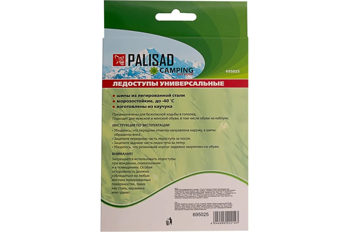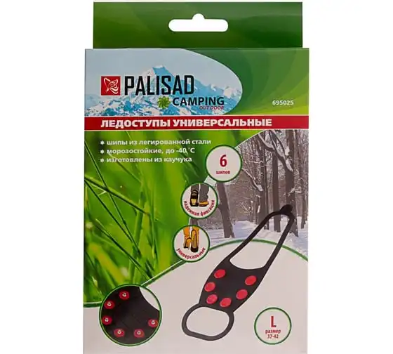 Универсальные ледоступы PALISAD Camping р. L (37-42) 695025 предназначены для безопасного передвижения по обледеневшим дорогам. В передней части каждой накладки имеется 6 элементов с заостренными зубцами, которые обеспечиваютнадежное сцепление с поверхностью. С ледоступами можно гулять, ходить в магазин и ездить на работу,не опасаясь падения.