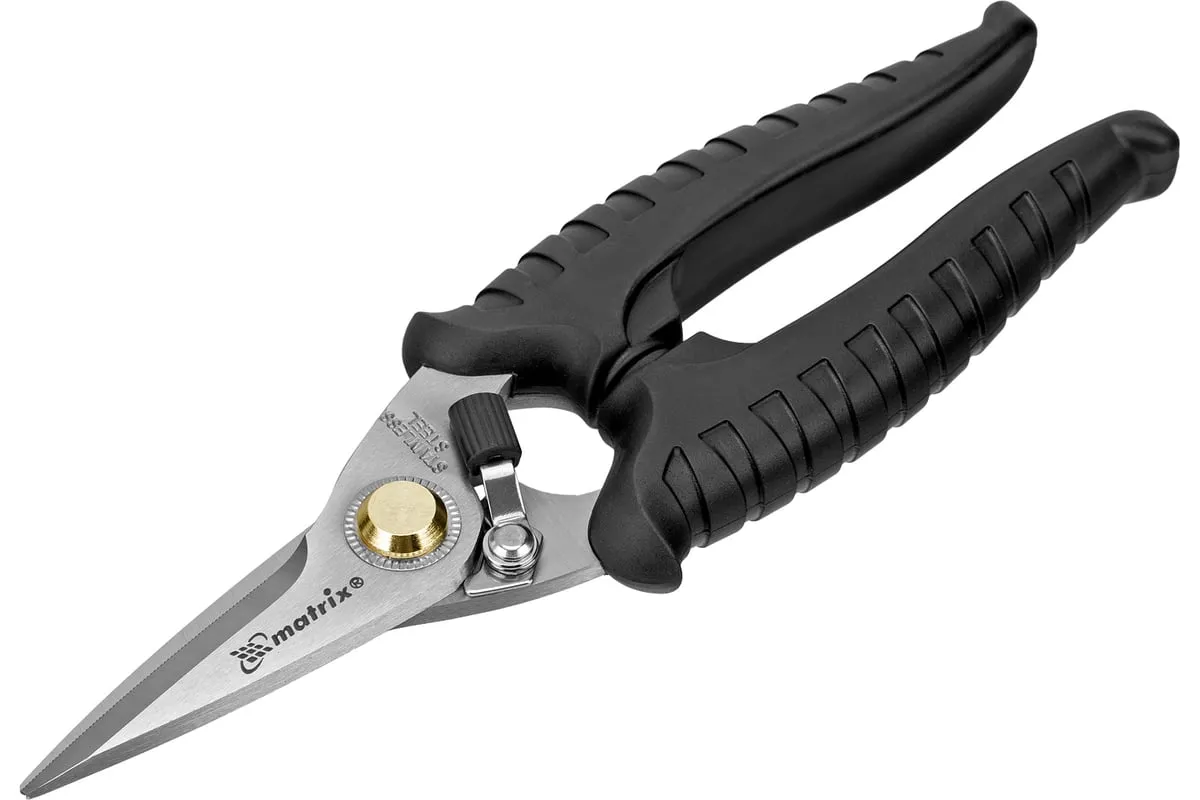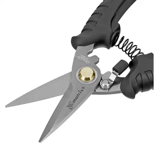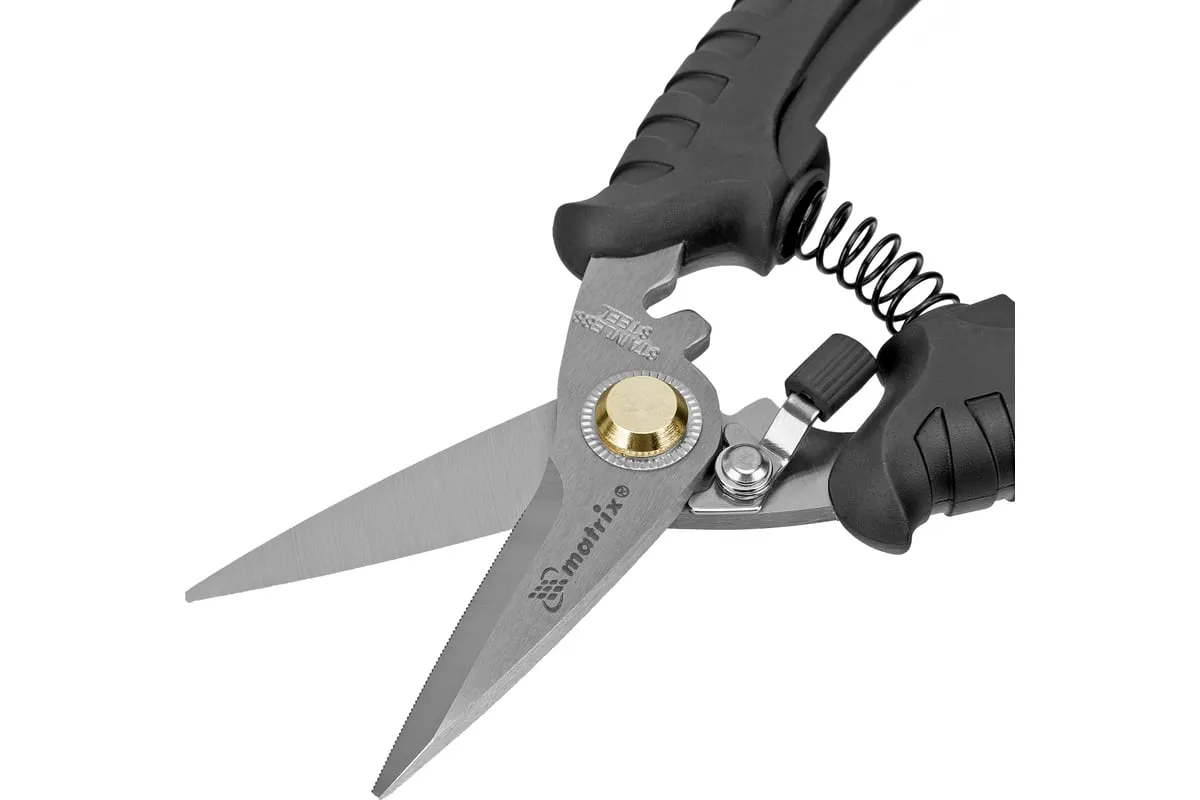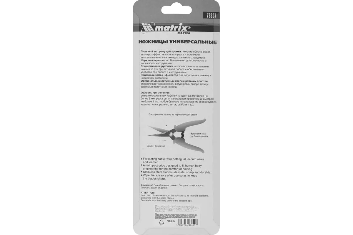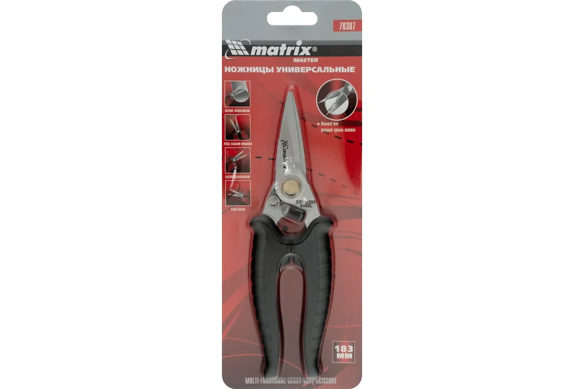 Универсальные ножницы Matrix 78307 длиной 183 мм — инструмент для разрезания тонкого металла и мягких материалов. Лезвия ножниц зазубрены, поэтому разрезаемый материал не выскальзывает из них. Инструмент подходит для выполнения разнообразных бытовых работ. На даче он поможет разрезать стальную сетку толщиной до 1 мм, в походе — ветки или рыбу, во время мелкого ремонта или занятий творчеством — провода, кожу, резину, картон, бумажную лозу и другие материалы.