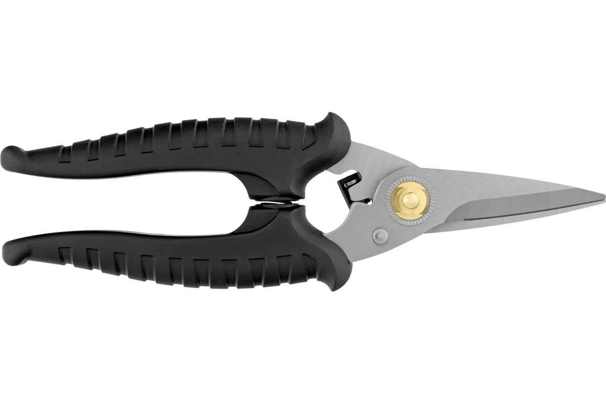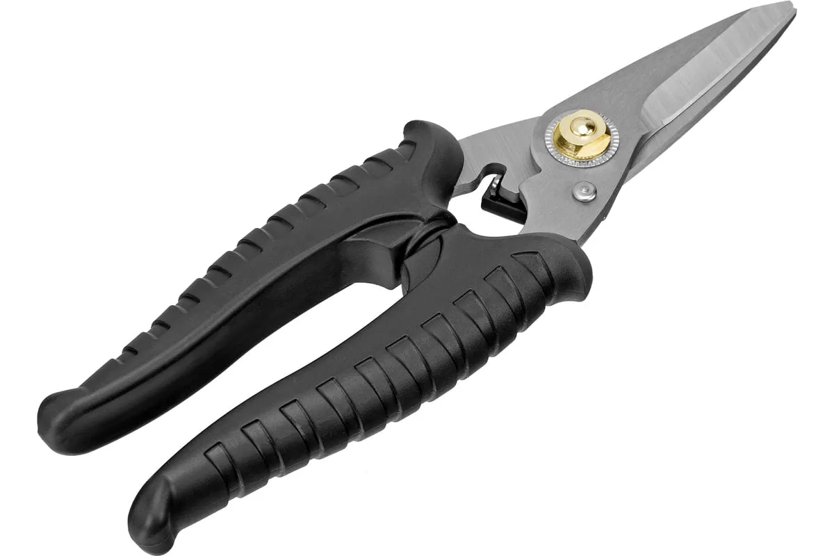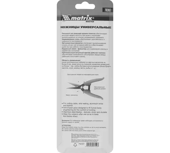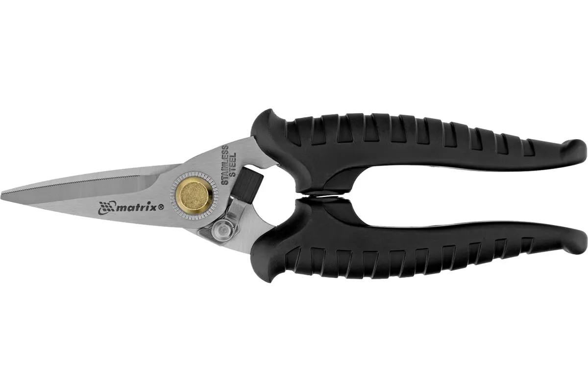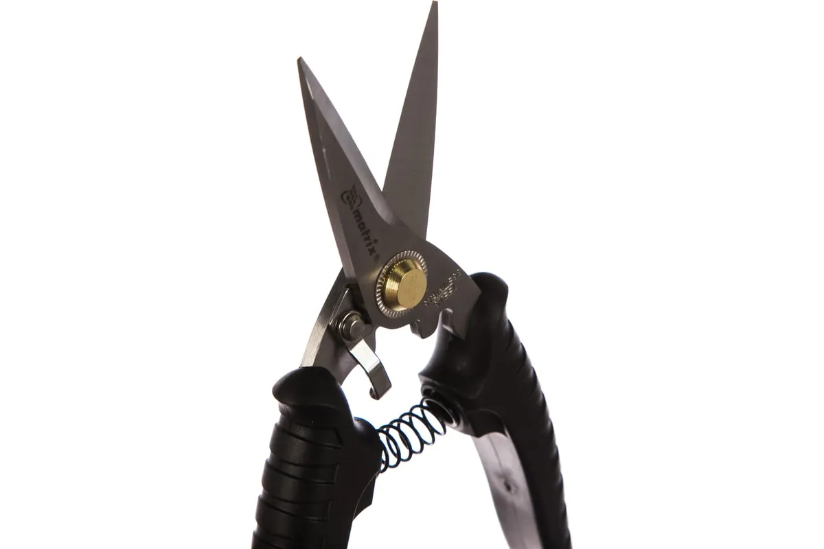 Универсальные ножницы Matrix 78307 длиной 183 мм — инструмент для разрезания тонкого металла и мягких материалов. Лезвия ножниц зазубрены, поэтому разрезаемый материал не выскальзывает из них. Инструмент подходит для выполнения разнообразных бытовых работ. На даче он поможет разрезать стальную сетку толщиной до 1 мм, в походе — ветки или рыбу, во время мелкого ремонта или занятий творчеством — провода, кожу, резину, картон, бумажную лозу и другие материалы.