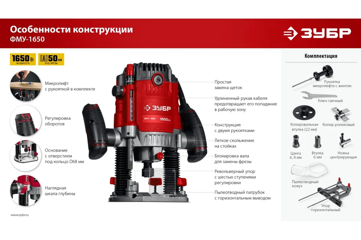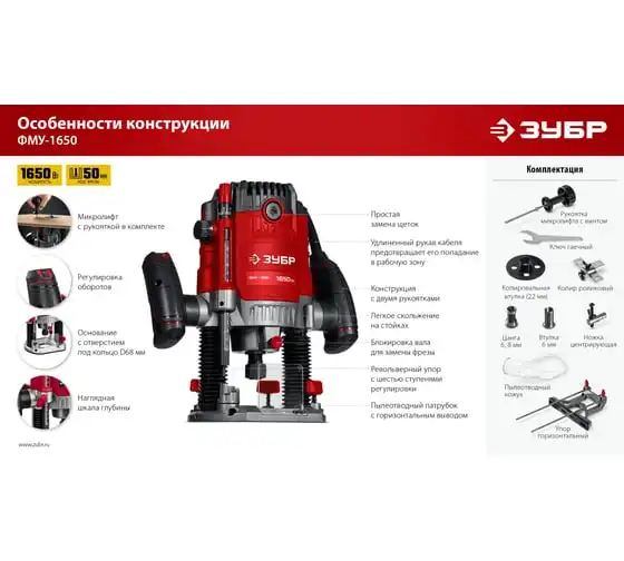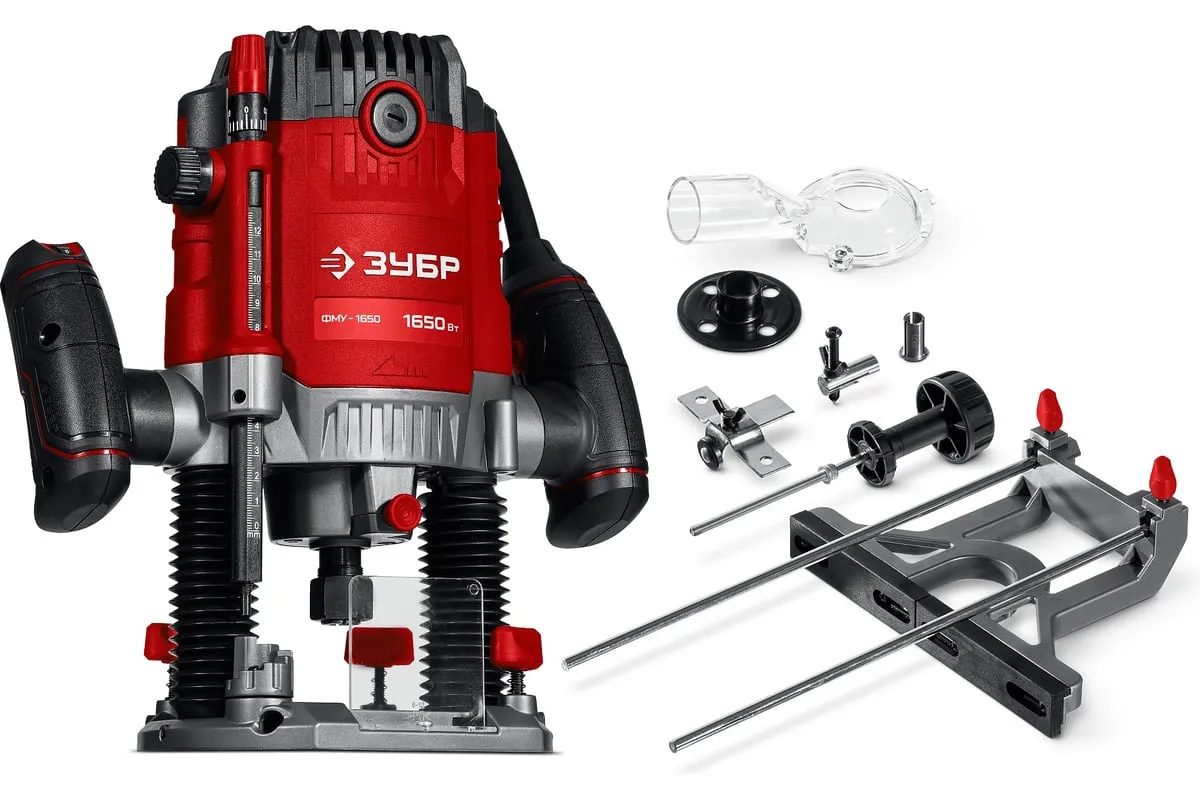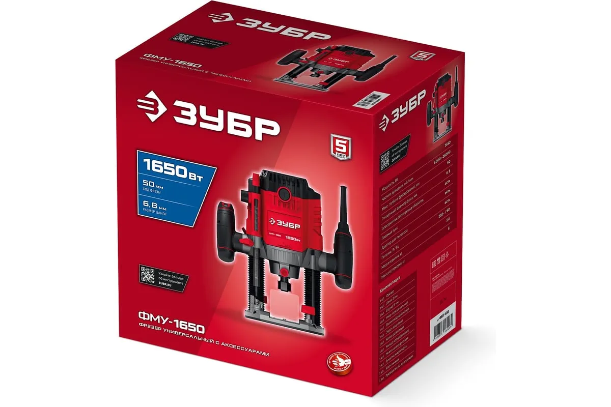 Фрезер ЗУБР – многофункциональное изделие для различных видов фрезерования (в т.ч. фигурного, по шаблону, по радиусу) различными типами фрез заготовок из дерева, древесно-стружечных плит и пластмасс, а при установке соответствующегосменного инструмента – металла. Неоспоримыми преимуществами ЗУБР 1650 Вт, 50 мм, универсальный фрезер ФМУ-1650 являются: