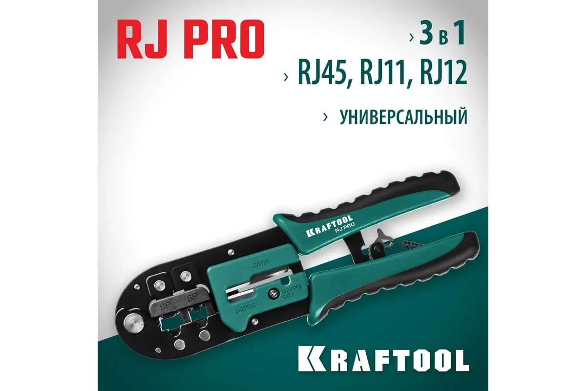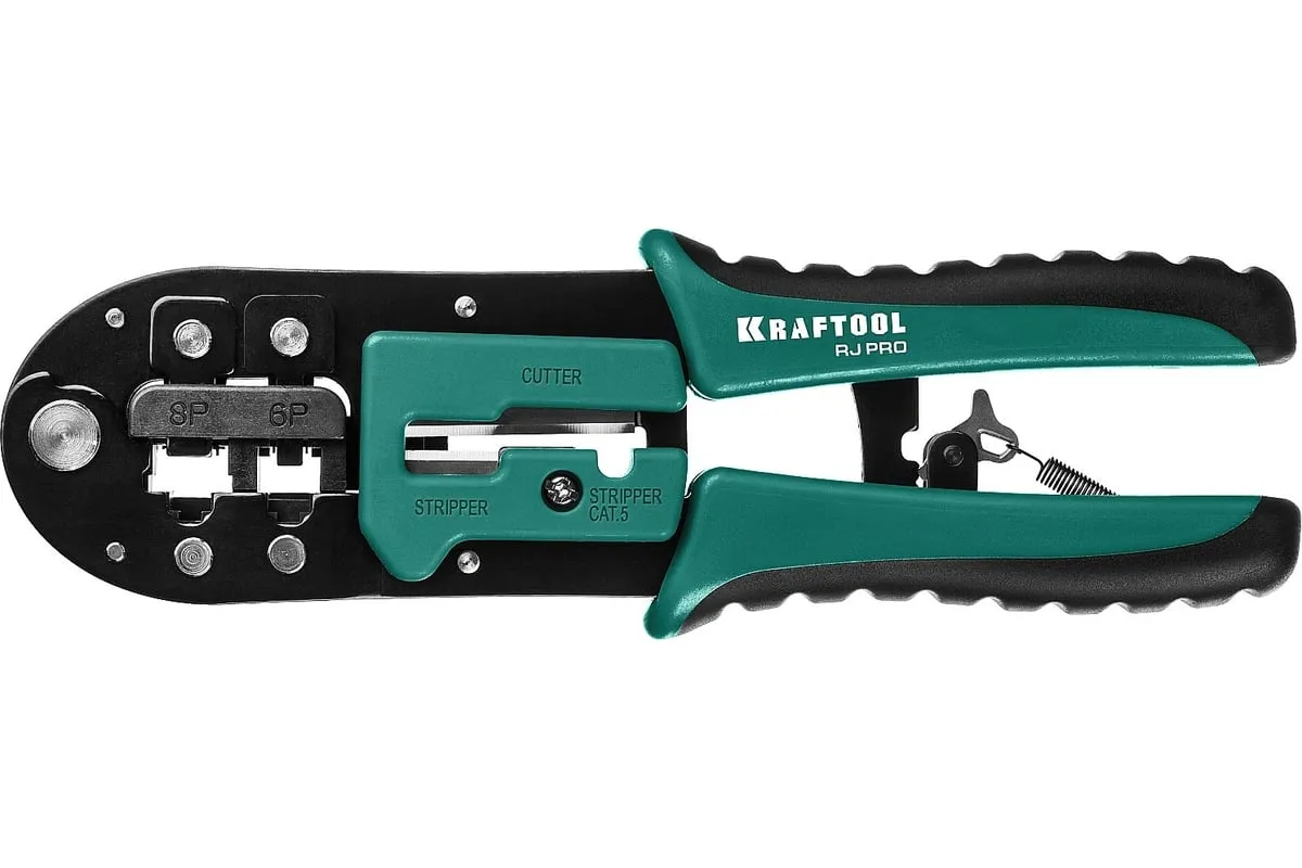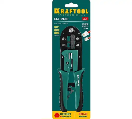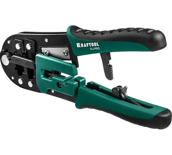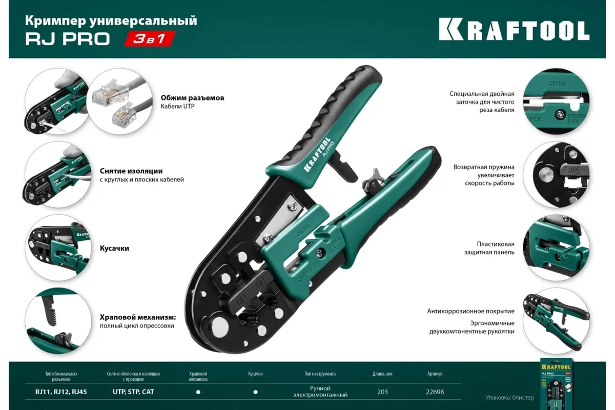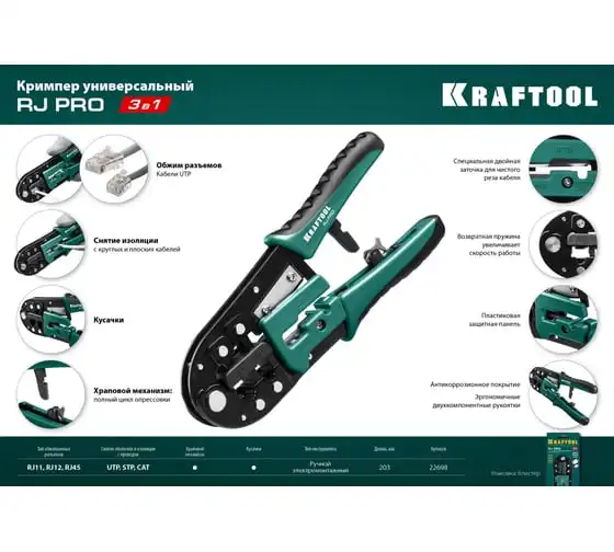 Универсальный кримпер KRAFTOOL RJ-Pro RJ45, RJ11/RJ12 22698 изготовлен из высококачественной инструментальной стали с закалкой рабочих поверхностей, предназначен для профессионального применения. Обладает повышенным ресурсом, обеспечивает наивысшее качество электромонтажных работ. Возвратная пружина увеличивает скорость работы. Специальная двойная заточка для чистого реза кабеля.
