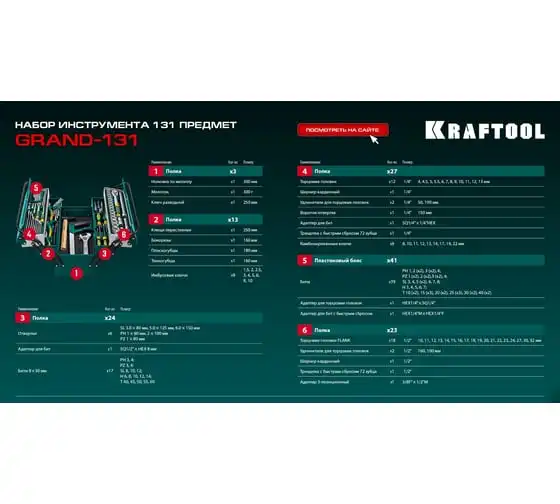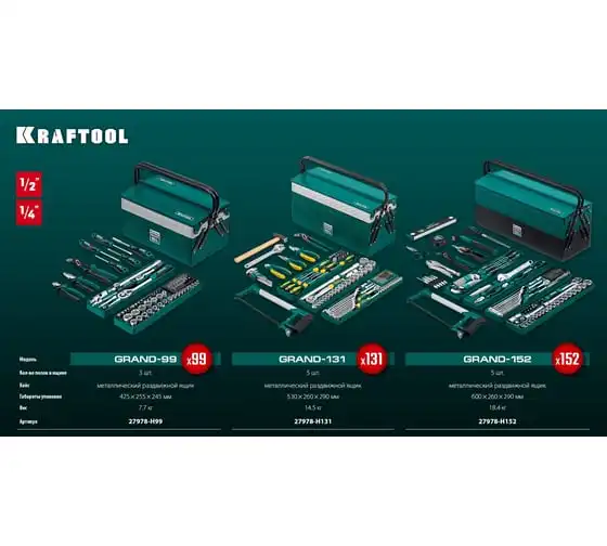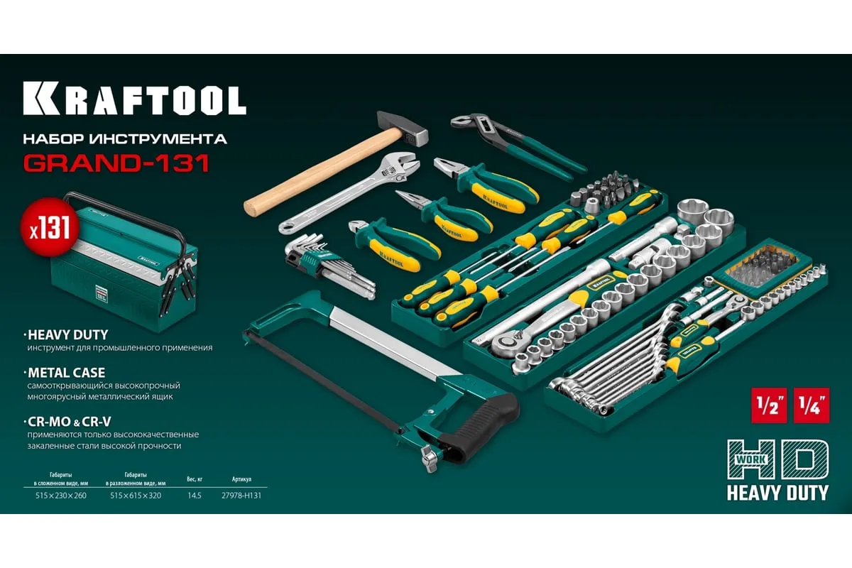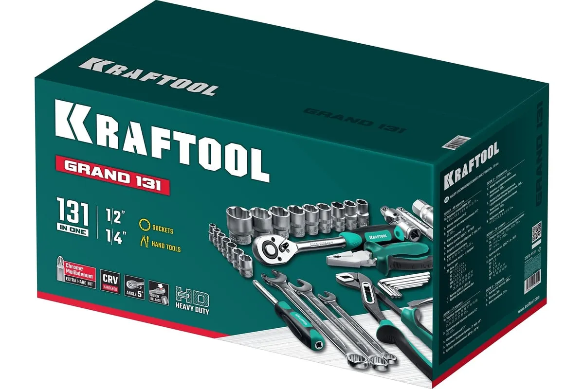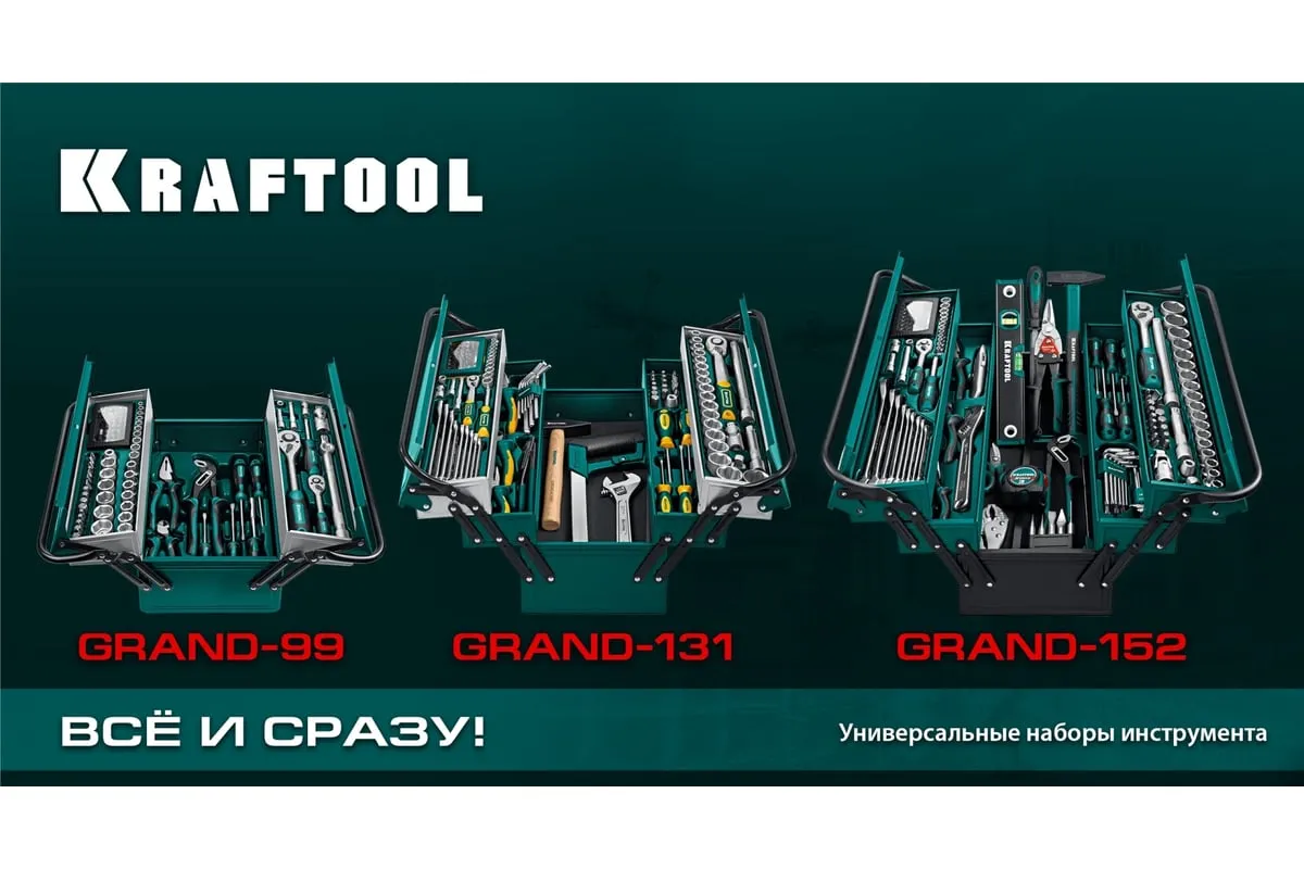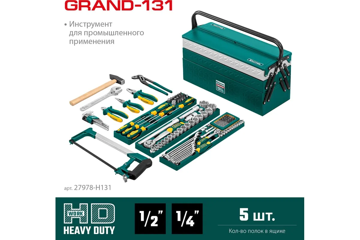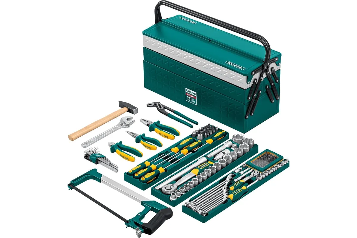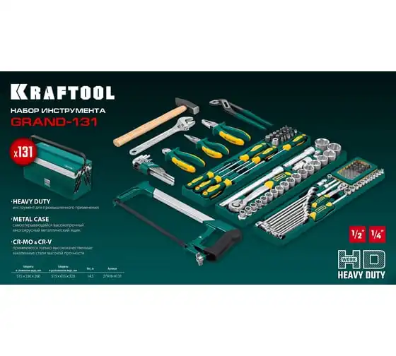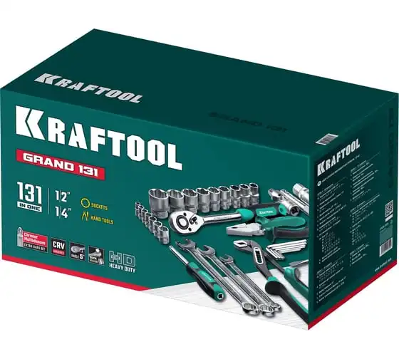 Универсальный набор инструмента KRAFTOOL Grand-131, 131 предмет 27978-H131 - это профессиональный комплект инструмента для проведения различных монтажных и слесарных работ. Он состоит из 131 инструмента. Набор снабжен профилем SUPER-LOCK для переноса пятен контактов с углов граней крепежа к их центру.