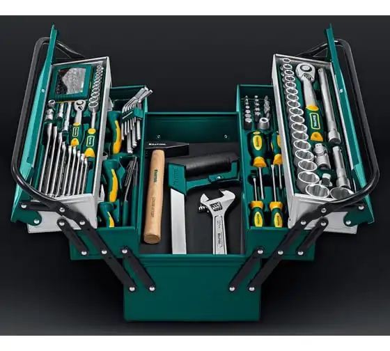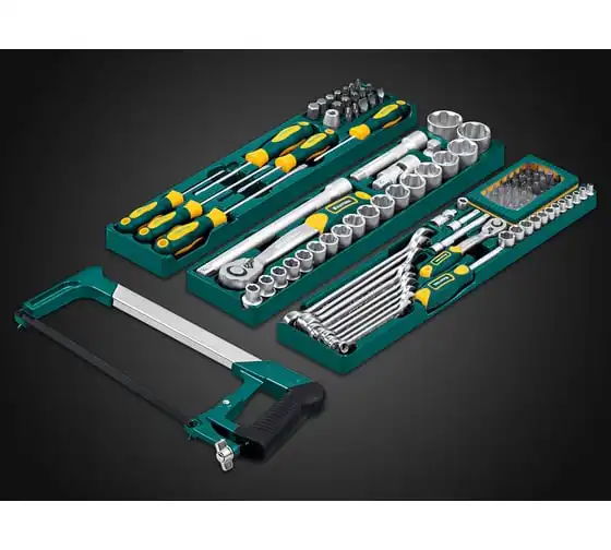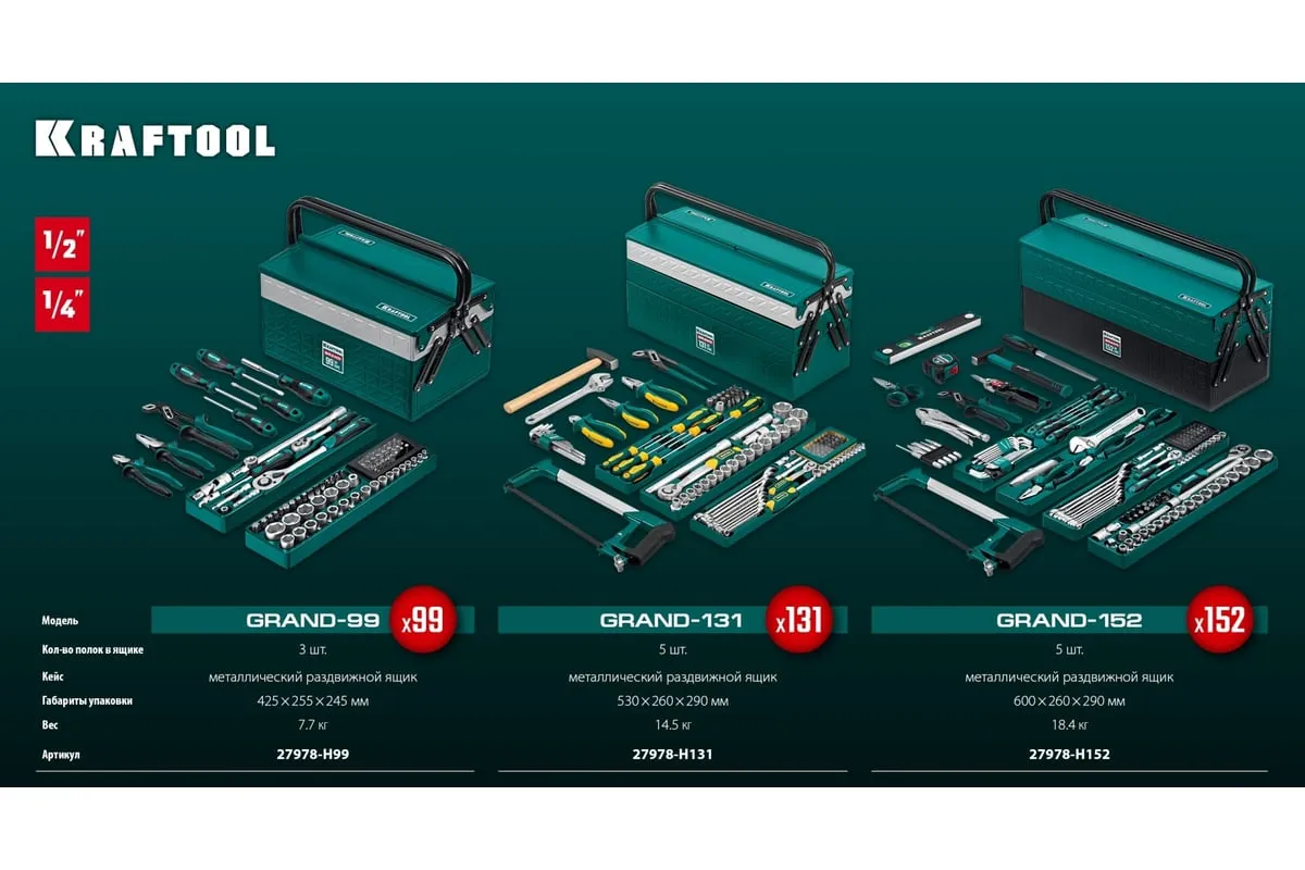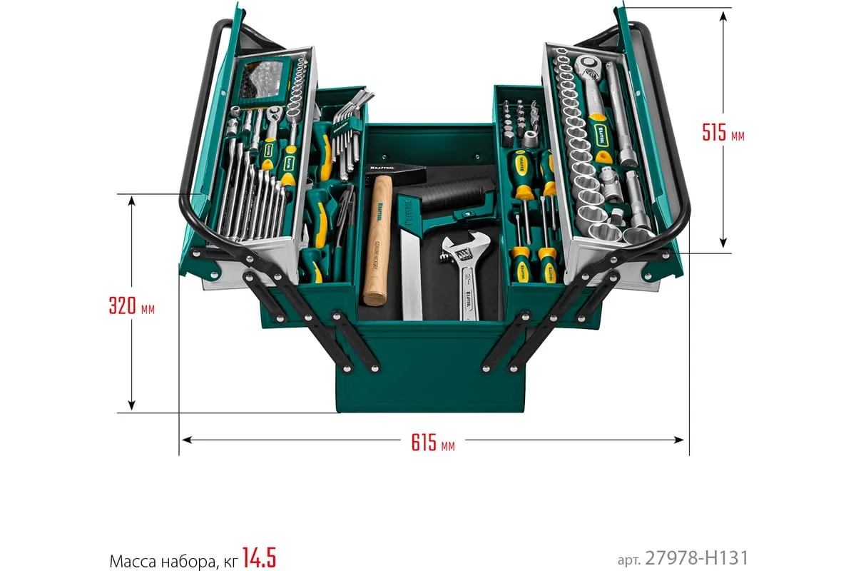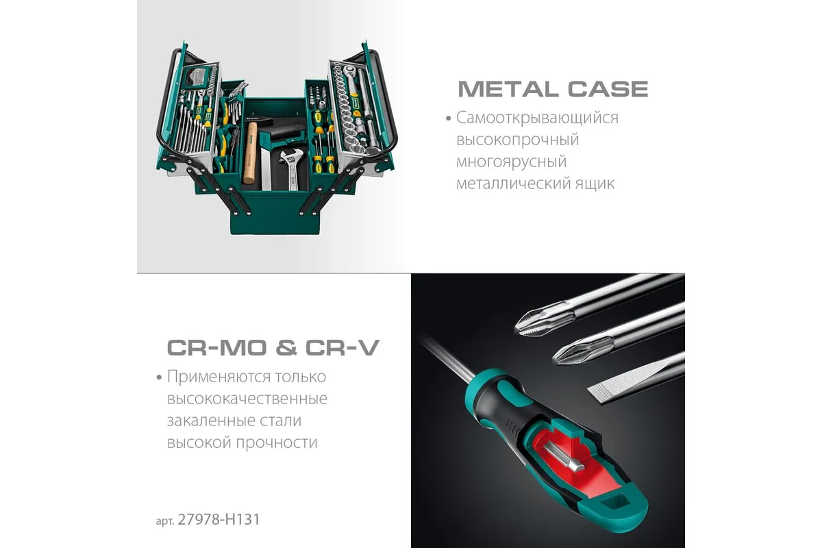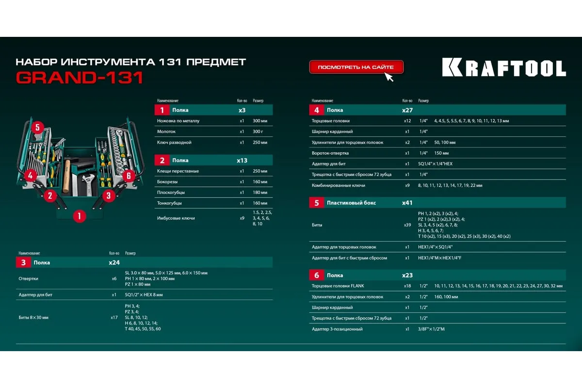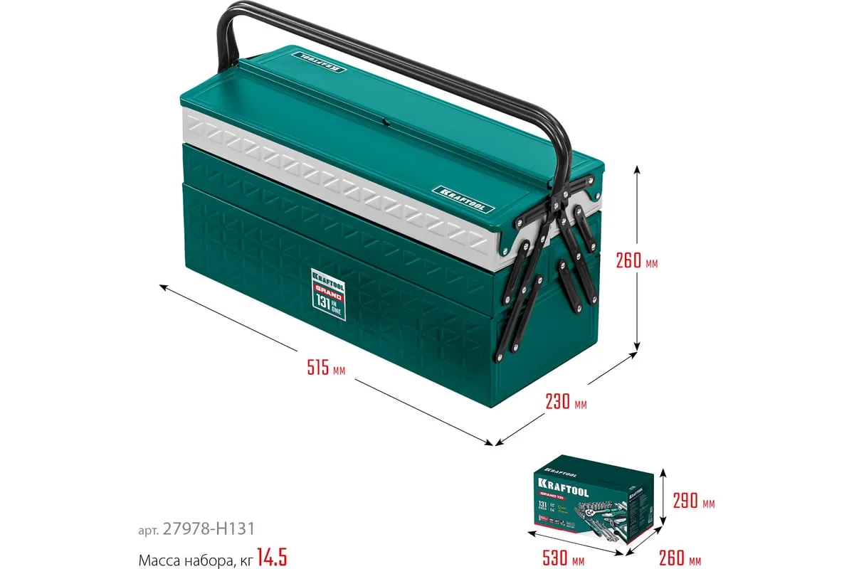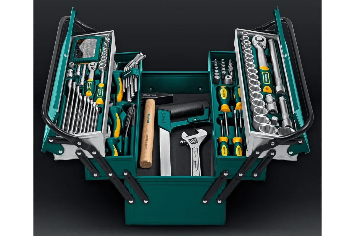 Универсальный набор инструмента KRAFTOOL Grand-131, 131 предмет 27978-H131 - это профессиональный комплект инструмента для проведения различных монтажных и слесарных работ. Он состоит из 131 инструмента. Набор снабжен профилем SUPER-LOCK для переноса пятен контактов с углов граней крепежа к их центру.