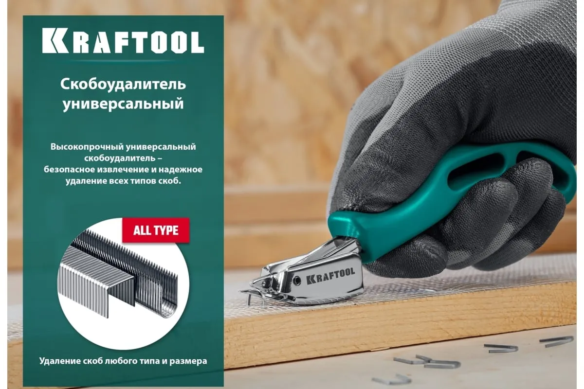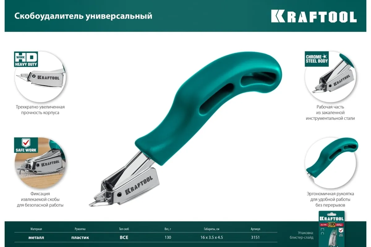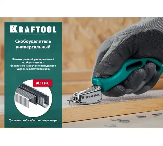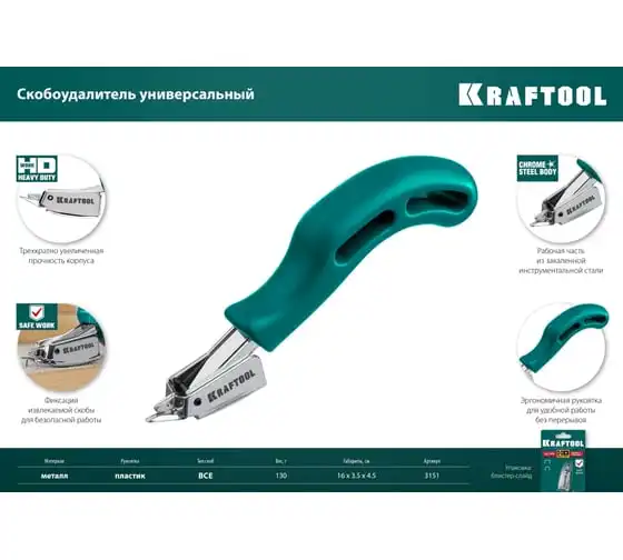 Универсальный скобоудалитель KRAFTOOL 3151 представляет собой специализированный профессиональный инструмент. Корпус изготовлен из закалённой стали. Фиксация извлекаемой скобы обеспечивает безопасность работ. Эргономичная конструкция гарантирует удобство работы.