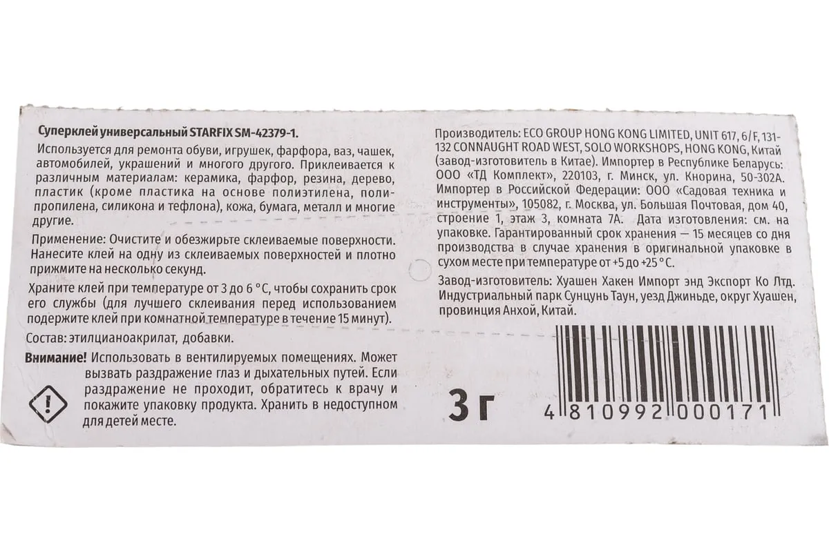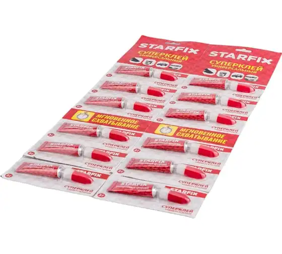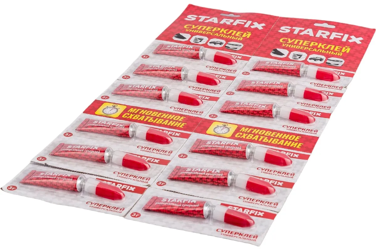 Универсальный Суперклей STARFIX 3 г х 12 штук SM-42379-1 - это универсальный секундный клей для любых материалов: кожа, пластмасса, металл, фарфор, керамика, дерево и т. д.