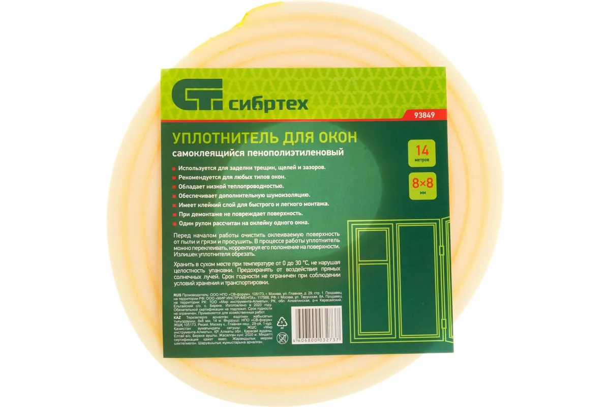 Самоклеящийся уплотнитель для окон Сибртех 93849 размером 8 мм х 8 мм х 14 м обеспечивает тепло- и шумоизоляцию, предотвращает образование сквозняков, попадание пыли. Может использоваться в жилых, производственных и иных помещениях.