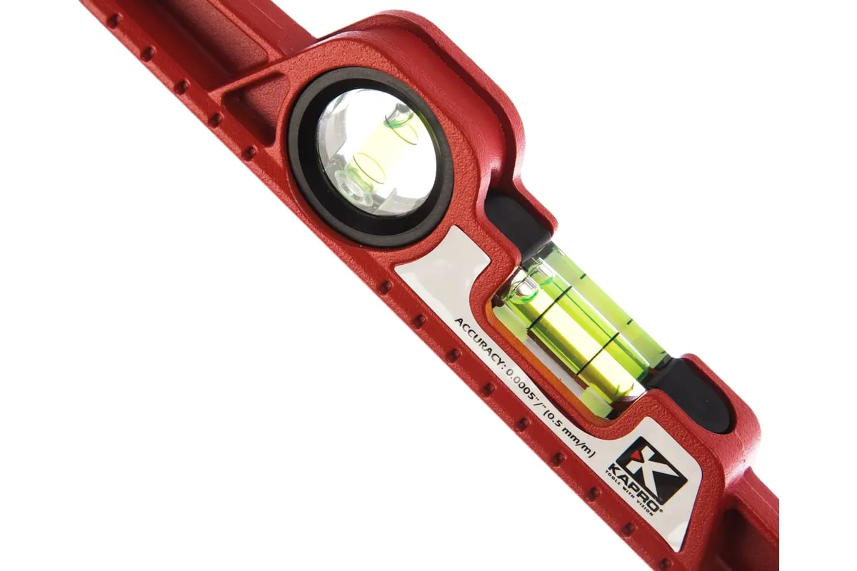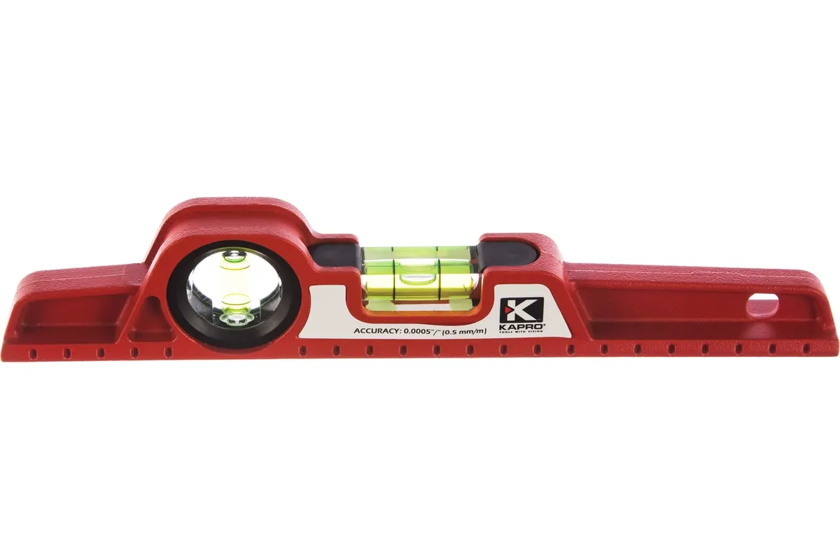 Уровень KAPRO 724-25 выполнен из литого алюминия, что делает конструкцию прочной и надежной. Наличие двух глазков позволяет проводить измерения горизонтальных и вертикальных поверхностей. Плоское основание имеет достаточную ширину для обеспечения устойчивости.