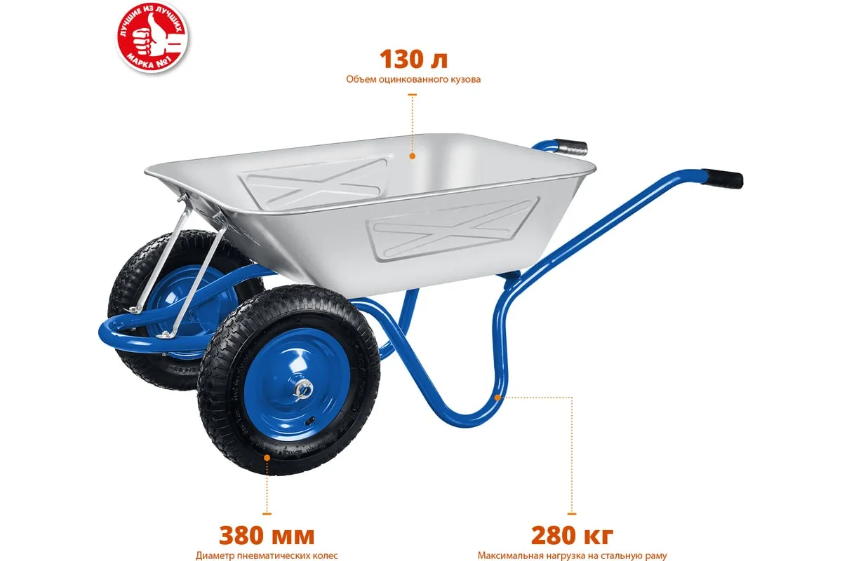 Усиленная строительная двухколесная тачка ЗУБР ПТ-350 39913 отличается прочной конструкцией, большой грузоподъемностью, хорошей маневренностью и долговечностью. Модель оснащена стальными подшипниками. Применяется для транспортировки различных грузов во время проведения строительных и садовых работ.