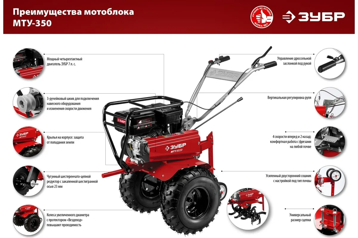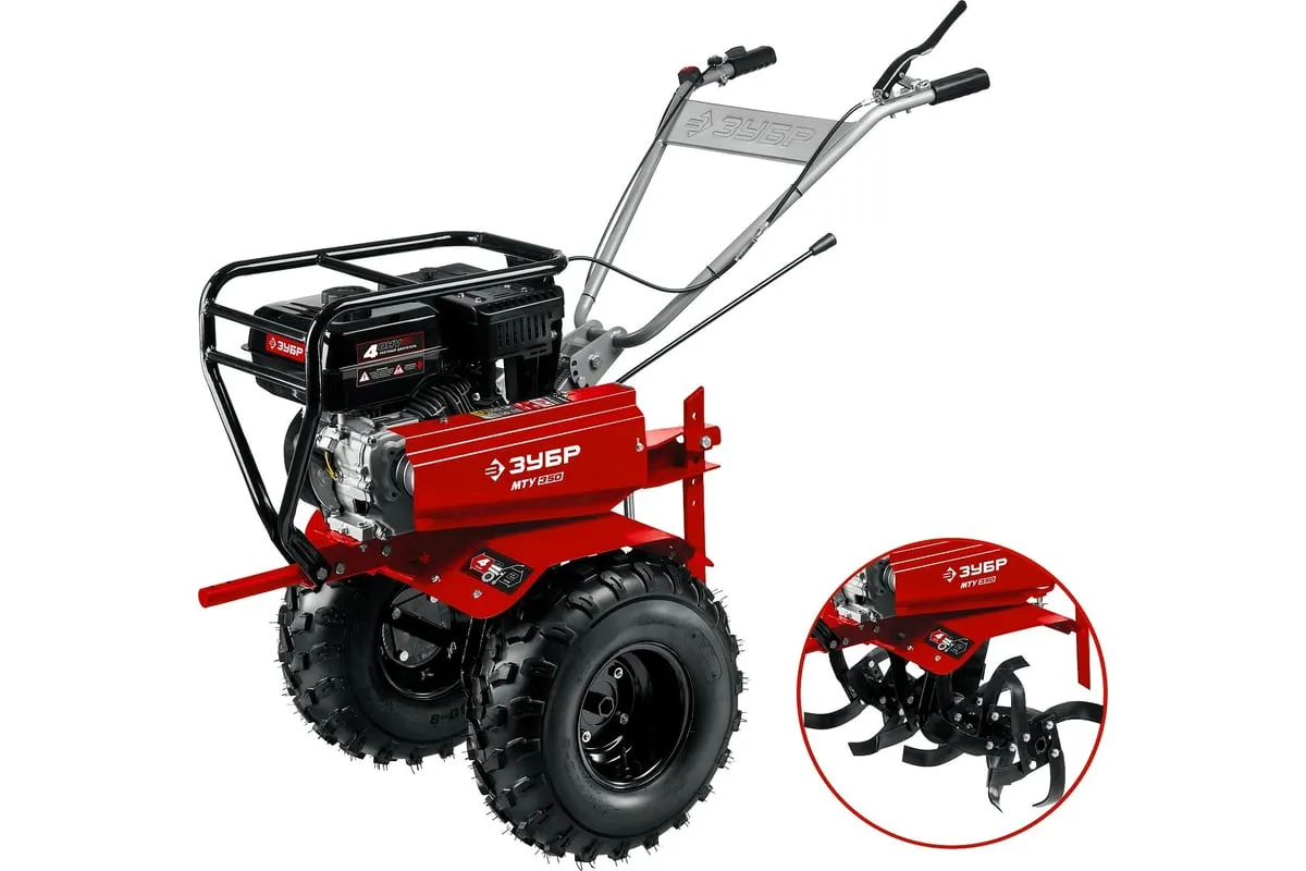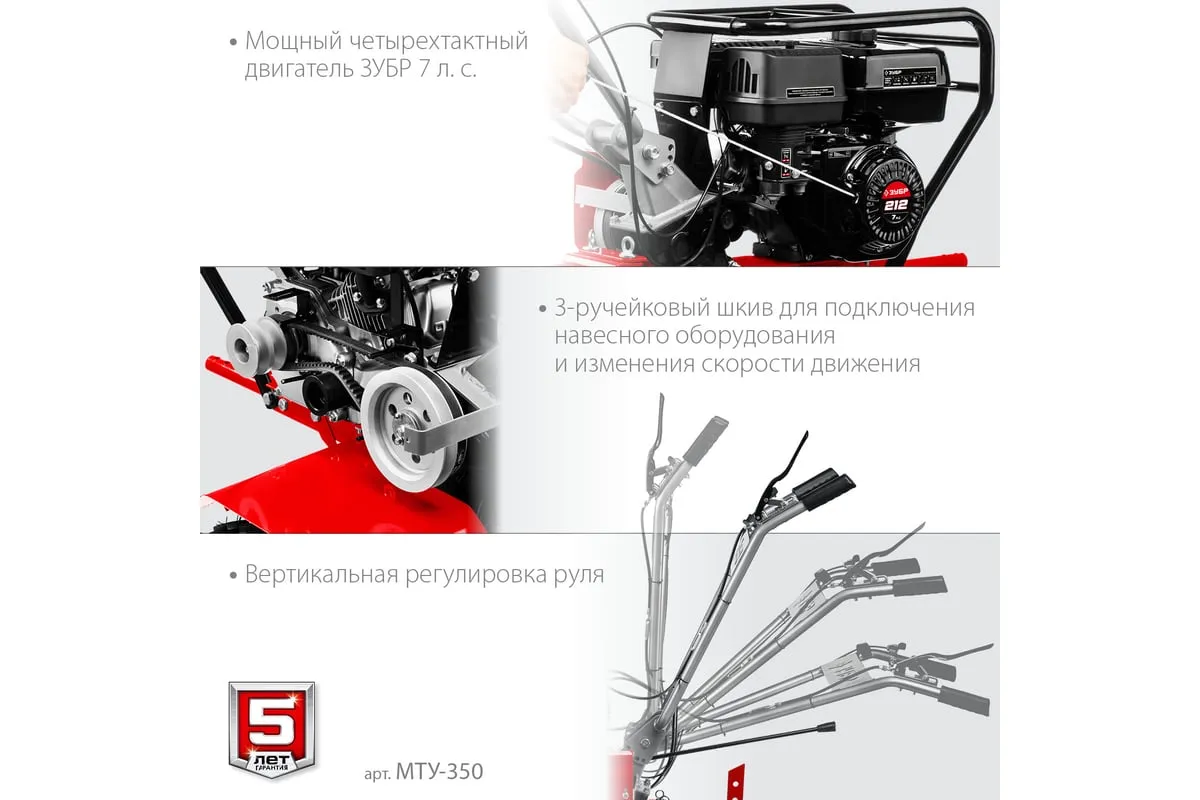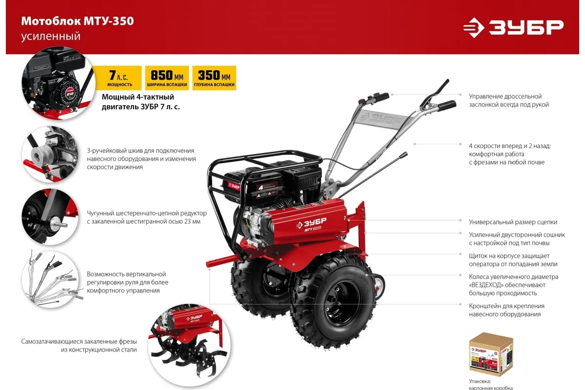 Усиленный бензиновый мотоблок ЗУБР МТУ-350 предназначен для земельных и сельскохозяйственных работ на личных приусадебных участках. Отличается многофункциональностью, благодаря возможности присоединенияразличного навесного оборудования: снегоуборщик, щетка, роторная косилка. Рукоять мотоблока настраивается под рост операторадля комфорта во время работы.