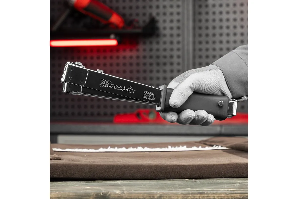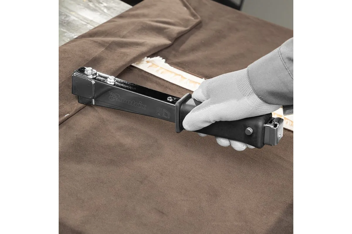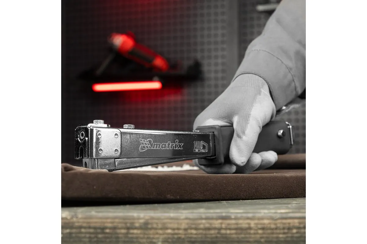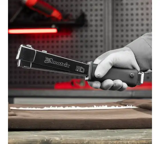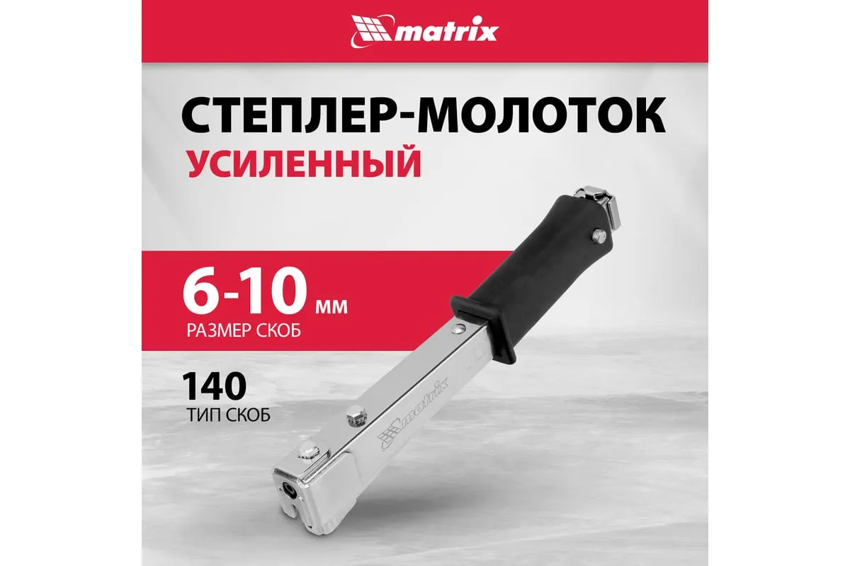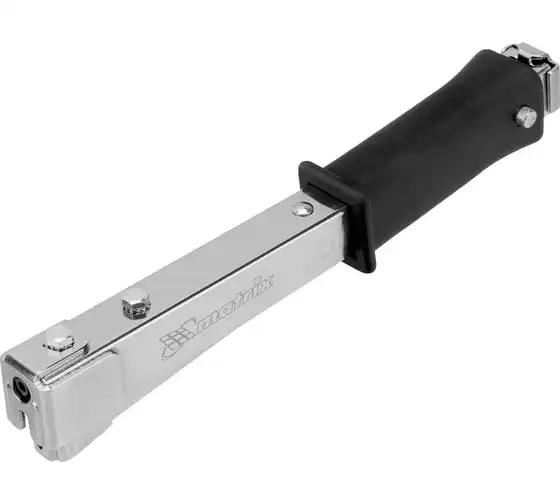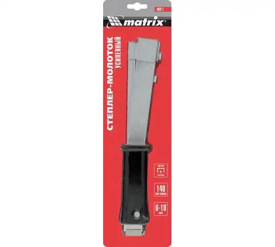 Усиленный степлер-молоток MATRIX MASTER 40911 - это удобный ручной инструмент для проведения кровельных работ, обшивки стен изоляционным материалом, обивки мебели, укладки коврового полотна и других монтажных работ. Степлер имеет прочную конструкцию, в которой сочетаются сталь и ударопрочный ABS-пластик.
