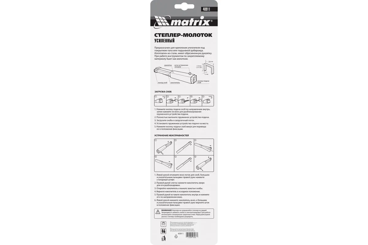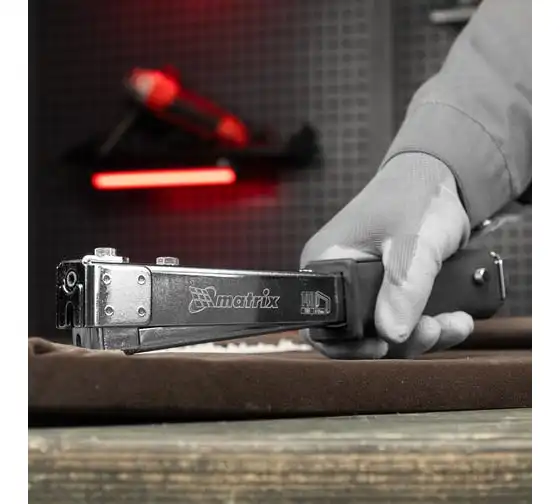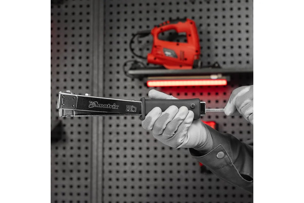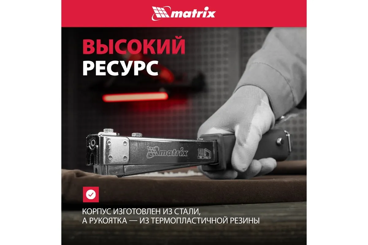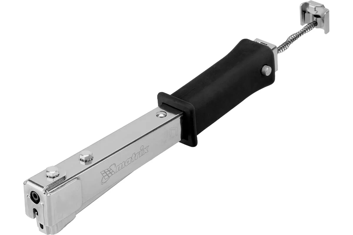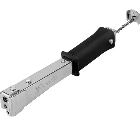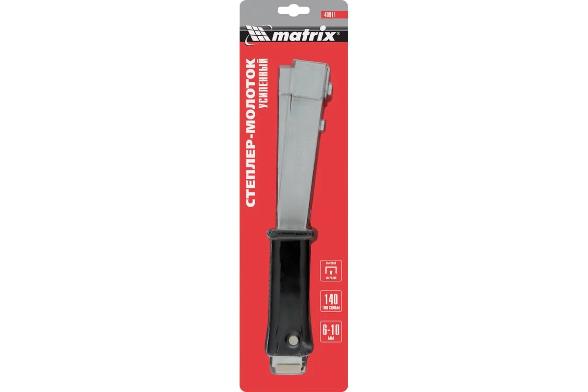 Усиленный степлер-молоток MATRIX MASTER 40911 - это удобный ручной инструмент для проведения кровельных работ, обшивки стен изоляционным материалом, обивки мебели, укладки коврового полотна и других монтажных работ. Степлер имеет прочную конструкцию, в которой сочетаются сталь и ударопрочный ABS-пластик.