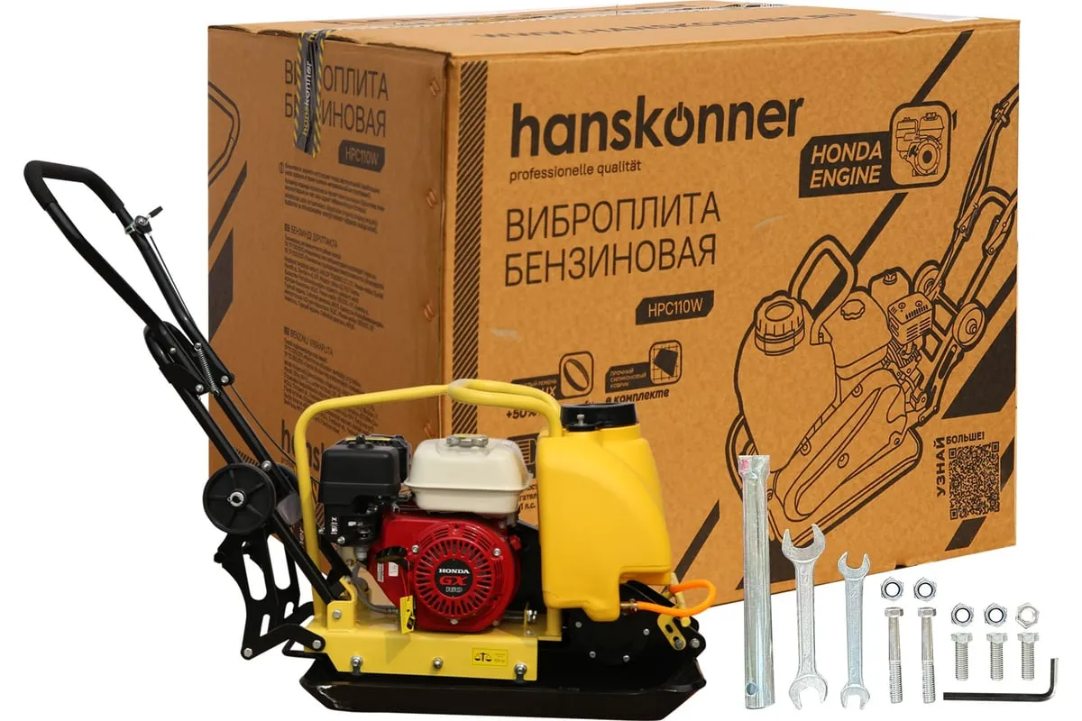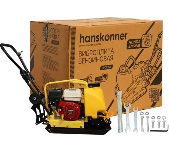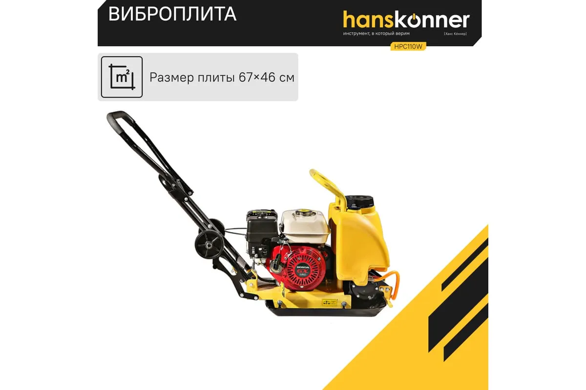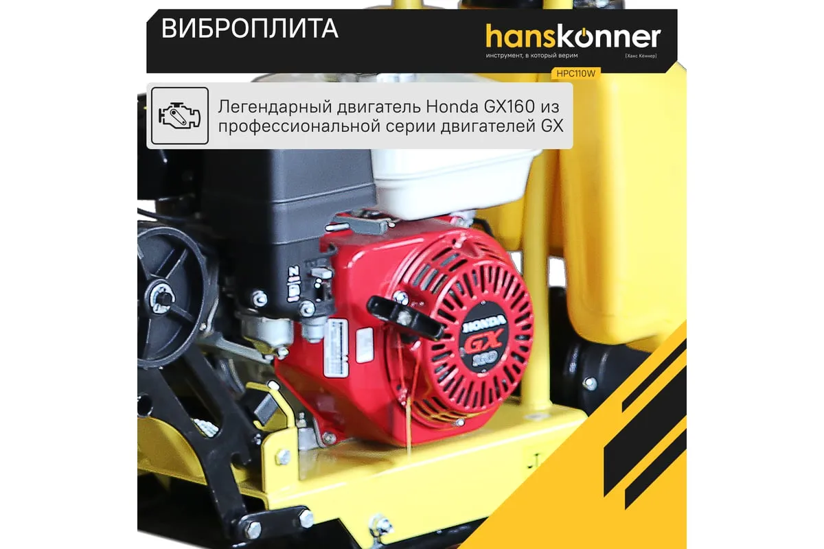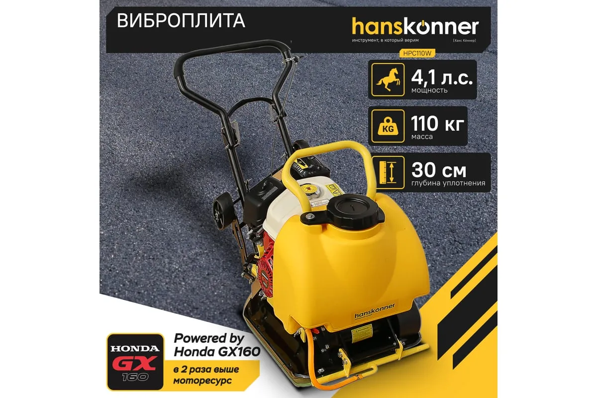 Компактная виброплита весом 100 кг HPC110W оснащена 4-х тактным бензиновым двигателем OHV марки Honda GX 160 мощностью 4.8 л.с. Легендарный двигатель Honda GX160 из профессиональной серии двигателей GX; В конструкцию виброплиты вмонтирована система подачи воды на трамбовочную плиту для работ по асфальту с вместительным баком на 13 литров. Наличие в комплекте высококачественного силиконового коврика для работ по тротуарной плитке является существенным преимуществом и позволяет сразу после приобретения приступать к работе с виброплитой без дополнительных затрат. Трамбовочная плита из конструкционной высокоуглеродистой стали имеет закругленные вверх края, что исключает образование наплывов и прочих неровностей на обрабатываемой поверхности. Складная рукоятка для удобства перевозки и хранения. Откидные колеса позволяют легко перемещать виброплиту.