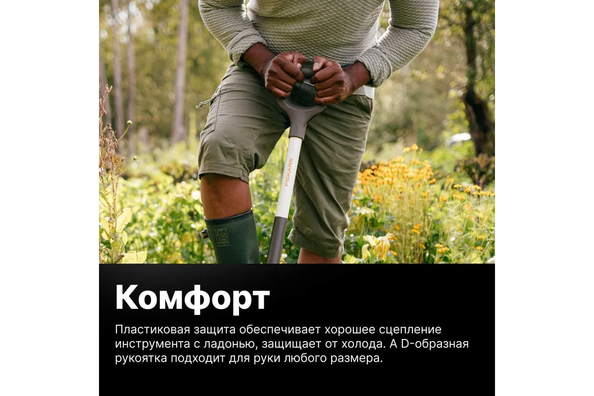 Алюминиевый черенок оснащен Д-образной рукояткой для удобства работы.