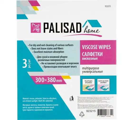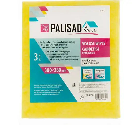 Универсальные вискозные салфетки Palisad Home 923215 размером 300 х 380 мм, 3 шт. в комплекте, подходят для уборки любых поверхностей, в том числе деликатных: зеркал, мебели, сантехники и т.д. Они гораздо дешевле микрофибры, но при этом также не оставляют следов и ворсинок.