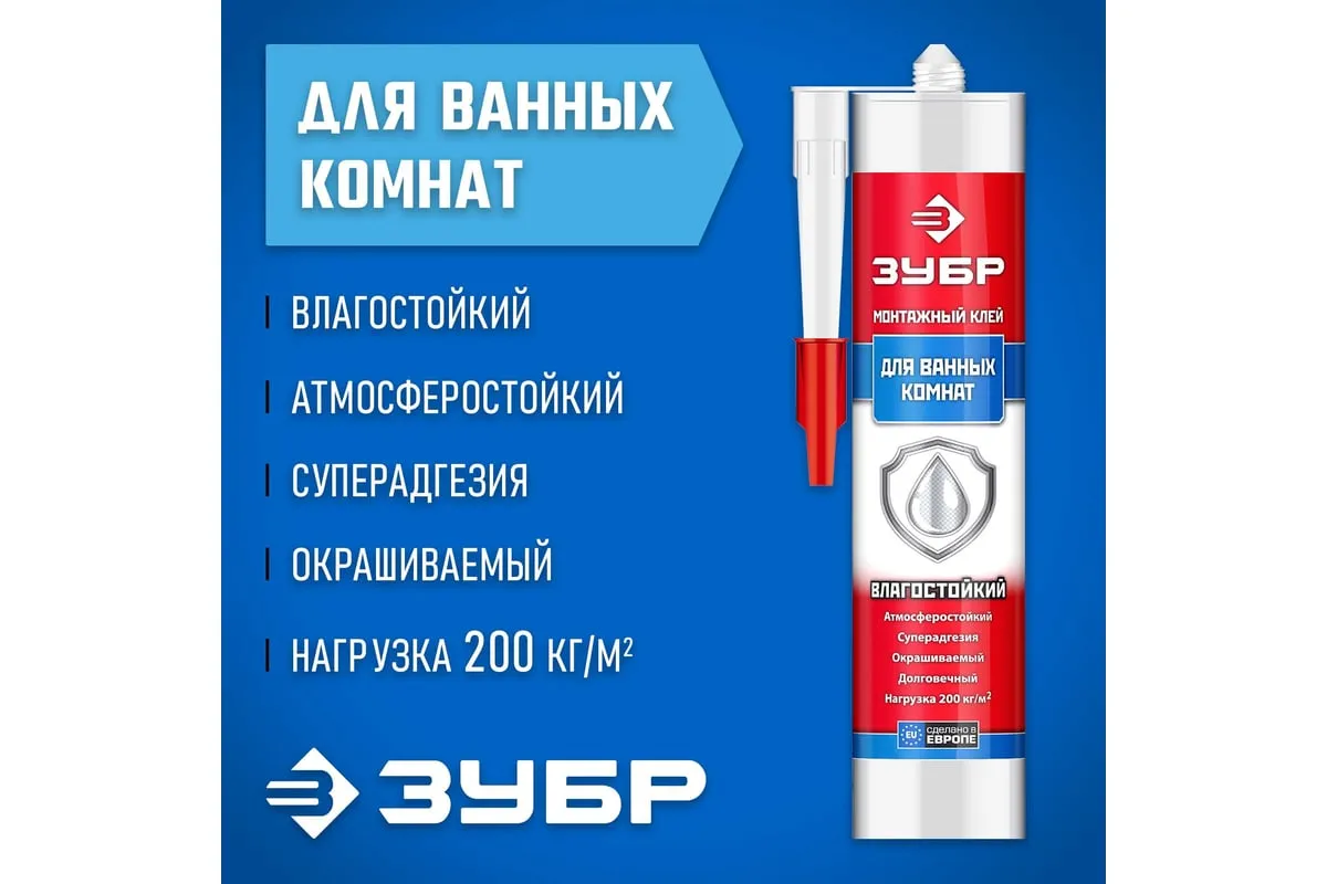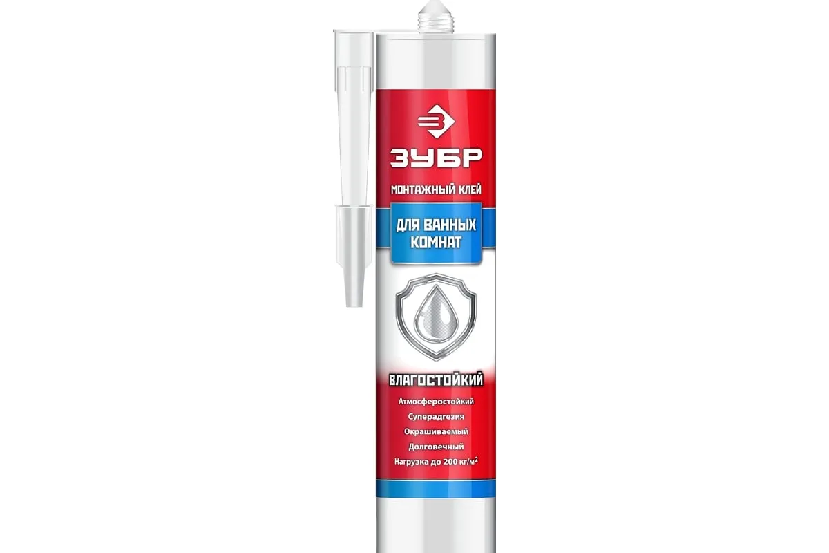Влагостойкий монтажный клей ЗУБР Эксперт 300 мл, белый 41335 подходит для большинства поверхностей, таких как металл, керамика, бетон, кирпич, древесина, пластик и др. Отлично склеивает и надежно удерживает даже тяжелые конструкции. Хорошо применять для фиксации зеркал. Можно использовать как внутри помещения, так и снаружи. Устойчив к влаге, низким температурам, вибрации. Для нанесения подходит температура от + 10 до +30 0С.