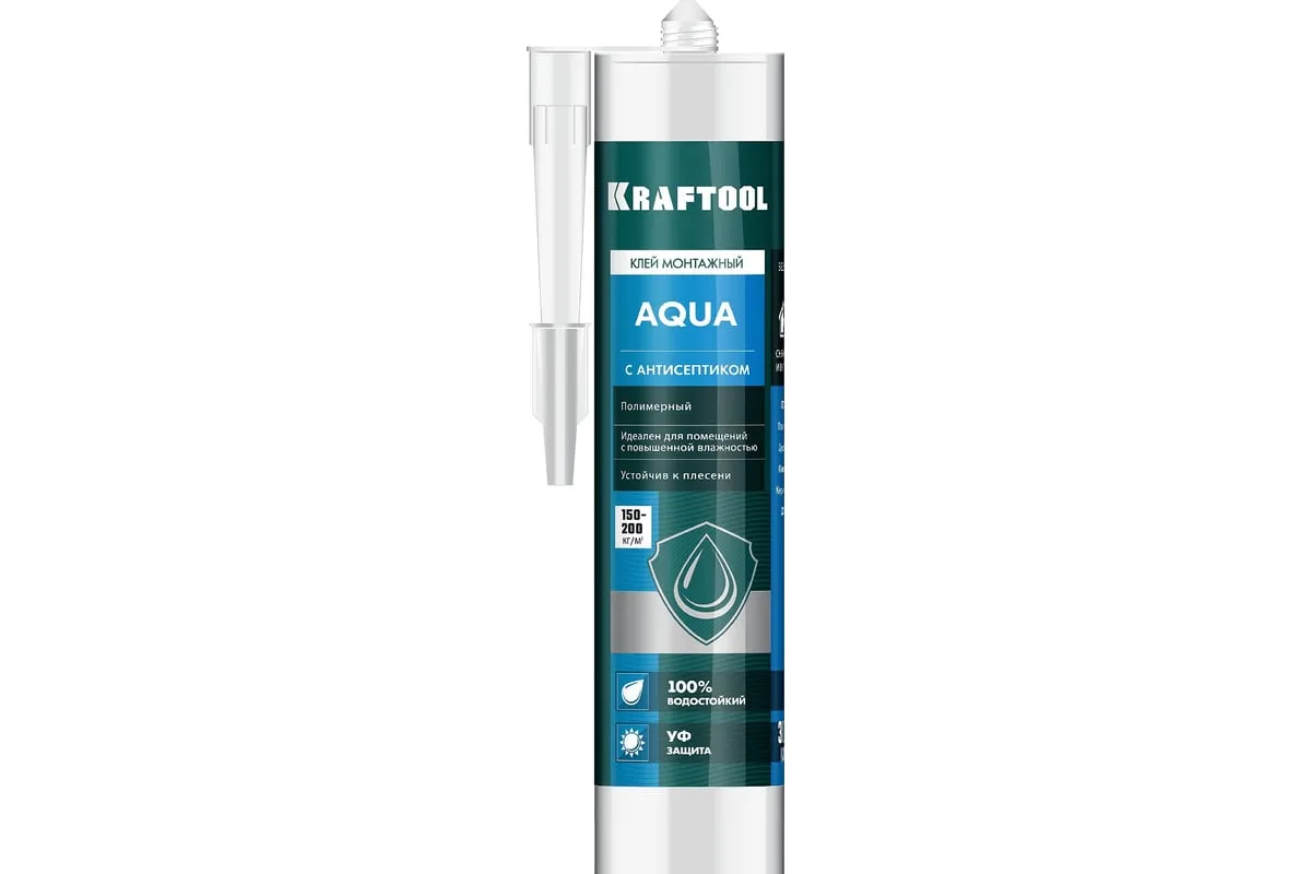 Водостойкий монтажный клей с антисептиком KRAFTOOL 310мл, белый 41345_z01 специально разработан для склеивания широкого ряда конструкционных материалов. Обладает превосходной адгезией даже при низких температурах. Применяется для монтажа изделий из ПВХ и других пластиков, используемых при отделке ванных комнат как между собой, так и на многие конструкционные материалы, такие как дерево, сухая штукатурка, металл, ДСП, ДВП и др.