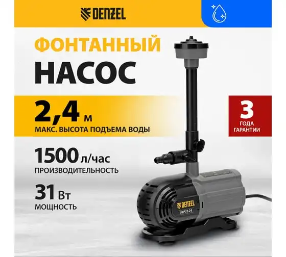 Насос фонтанный Denzel fnp31-24, 31 вт, подъем 2,4 м, 1500 л/ч, колокольчик/2 каскада/гейзер 99031